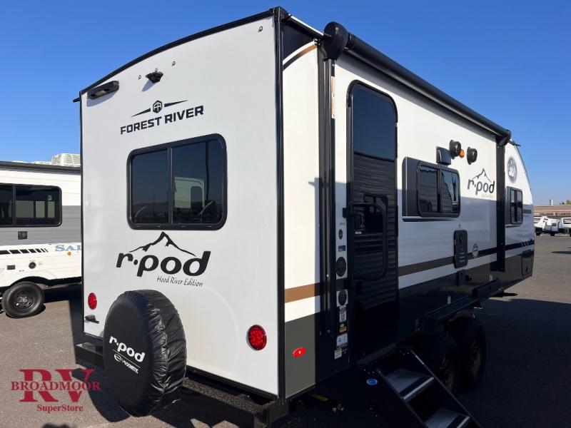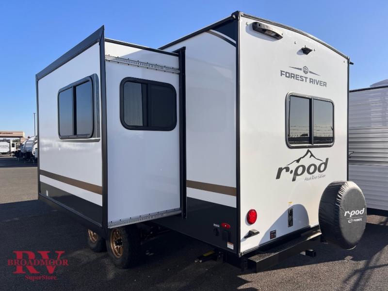 With any R-Pod travel trailer by Forest River, you will enjoy affordable luxury at the lowest tow weight in its class! There is a sealed underbelly with forced heat, a curved dual-pane acrylic front window with a bug screen and night shade, plus a large roof mounted solar panel for off-grid capabilities. The 15K A/C unit will keep you comfortable during the summer camping months, and the tankless water heater will provide endless hot showers after hiking, biking, swimming and more! Each model also includes a black glass friction hinge entrance door, roof ladder prep, exterior motion lighting, plus a hot and cold exterior spray port to wash off sand from the beach. Inside, you'll enjoy seamless Surf-X kitchen countertops, blackout roller shades, and a central vacuum system for hassle-free cleaning!