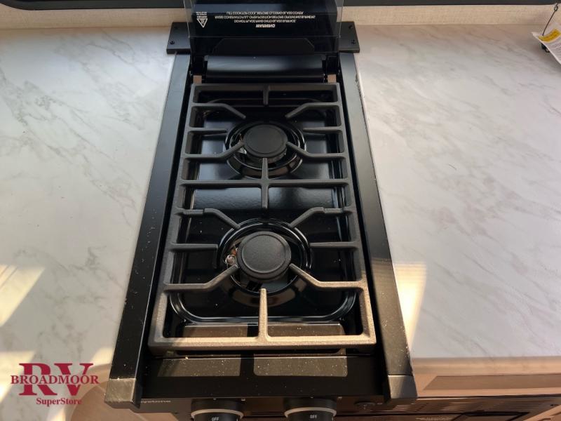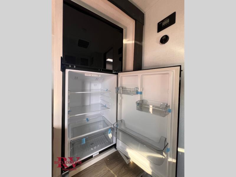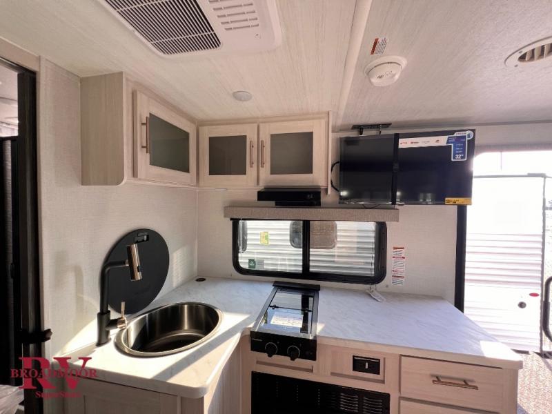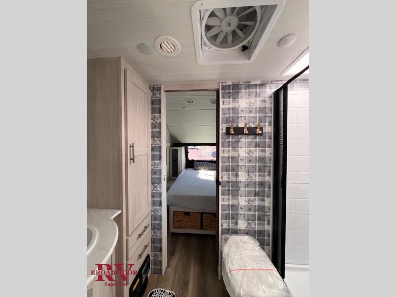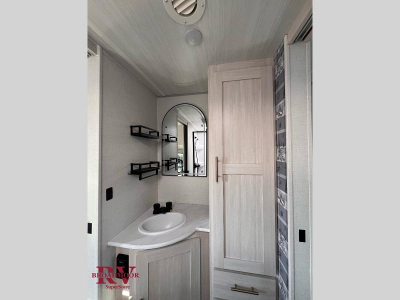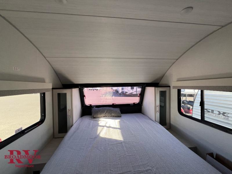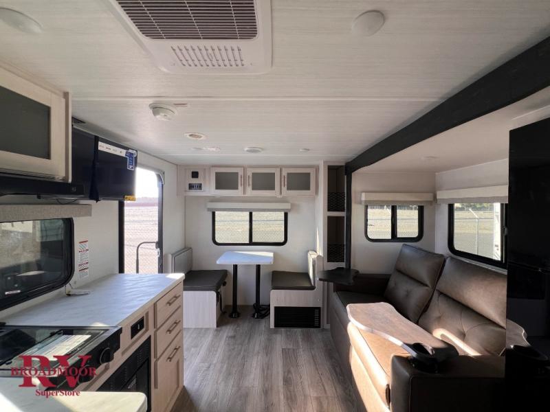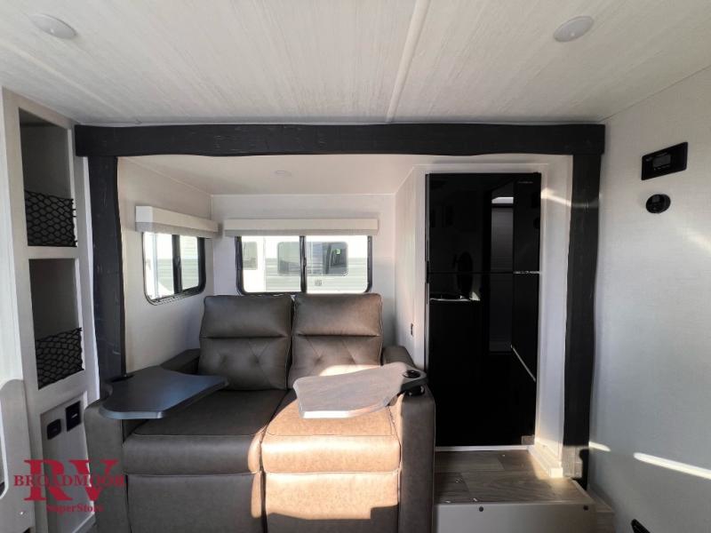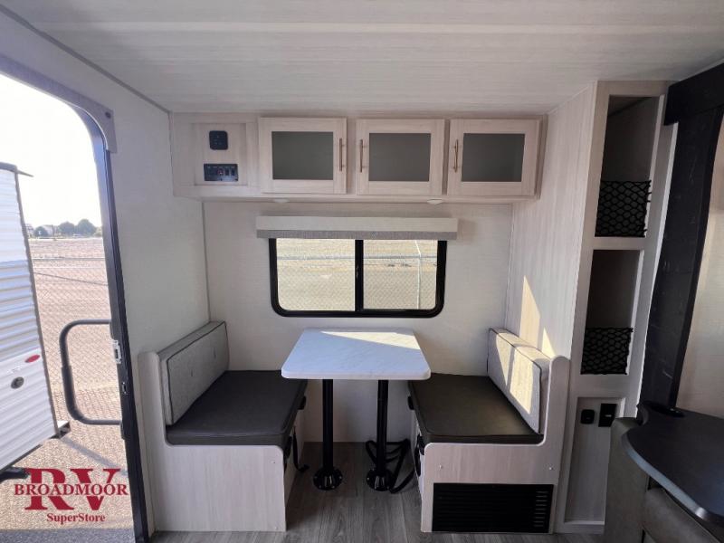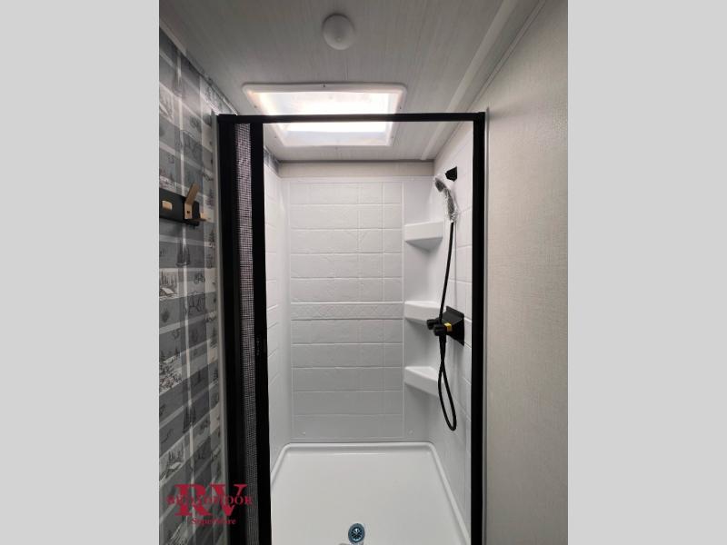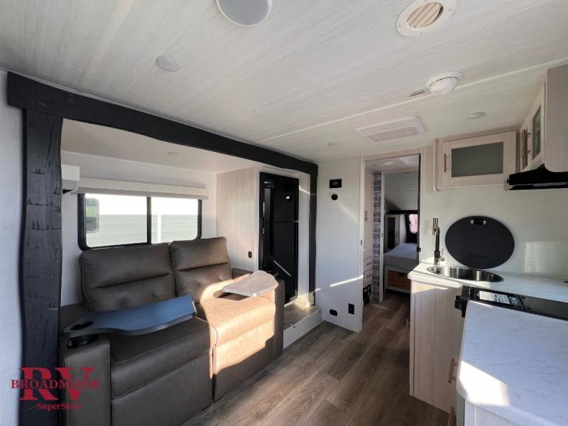Whether you spend your days at the lake or in the woods, you'll be met with comfort in this spacious travel trailer. There is a rear dinette where you can enjoy your meals together, a 56" theater seat across from a 12V TV, and a slide out for added space. The walk-thru bath includes a night light for easy nighttime use, and the front master bedroom includes a queen bed just like at home. There are also dual wardrobes and end tables plus an entertainment center if you want to add a TV. Outside, you'll find a rear accessory hitch, a 14' awning, and a slam latch cargo doors to keep your gear secure. This model also includes the Hood River Edition that comes with Mud Legend all terrain tires with TPMS, a MaxxAir vent cover, and 12V tank heaters!