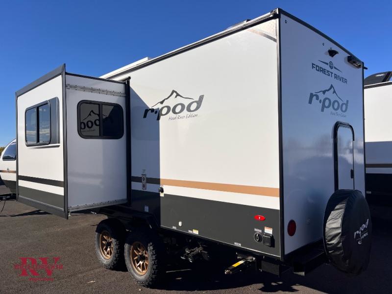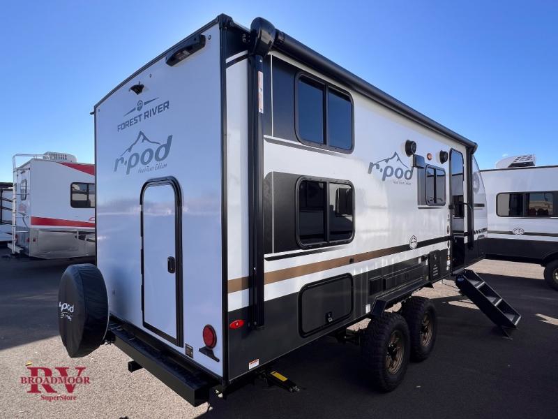 With any R-Pod travel trailer by Forest River, you will enjoy affordable luxury at the lowest tow weight in its class! There is a sealed underbelly with forced heat, a curved dual-pane acrylic front window with a bug screen and night shade, plus a large roof mounted solar panel for off-grid capabilities. The 15K A/C unit will keep you comfortable during the summer camping months, and the tankless water heater will provide endless hot showers after hiking, biking, swimming and more! Each model also includes a black glass friction hinge entrance door, roof ladder prep, exterior motion lighting, plus a hot and cold exterior spray port to wash off sand from the beach. Inside, you'll enjoy seamless Surf-X kitchen countertops, blackout roller shades, and a central vacuum system for hassle-free cleaning!