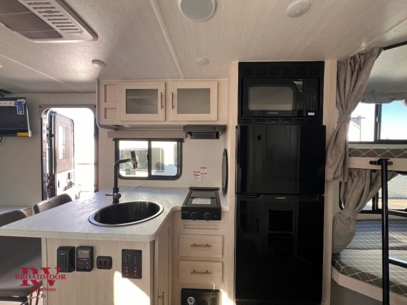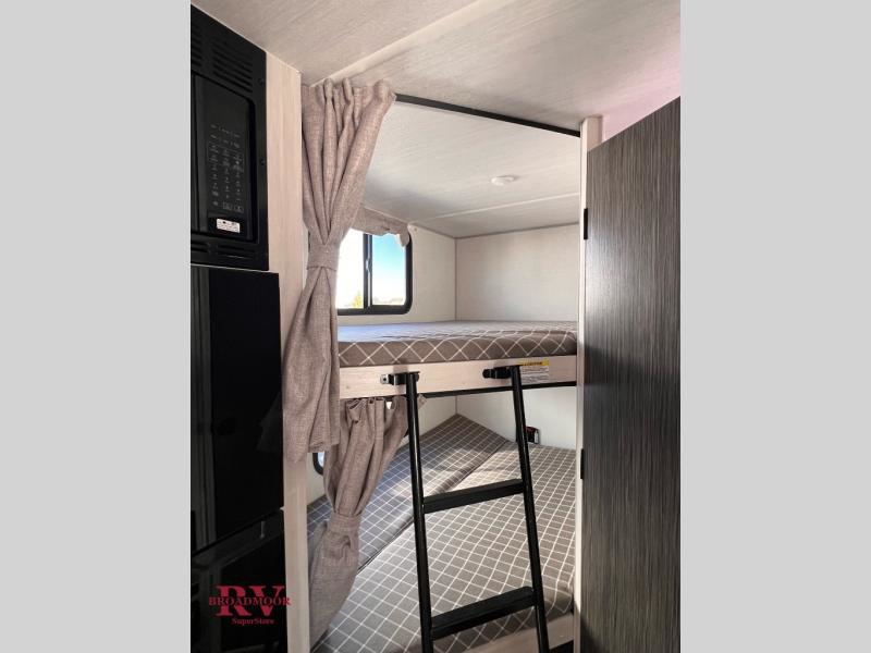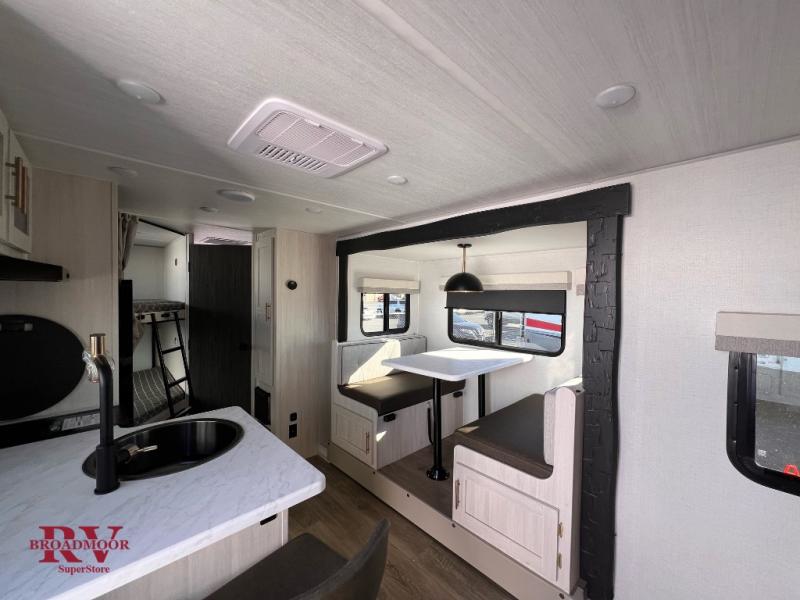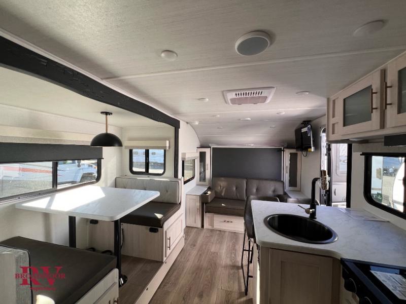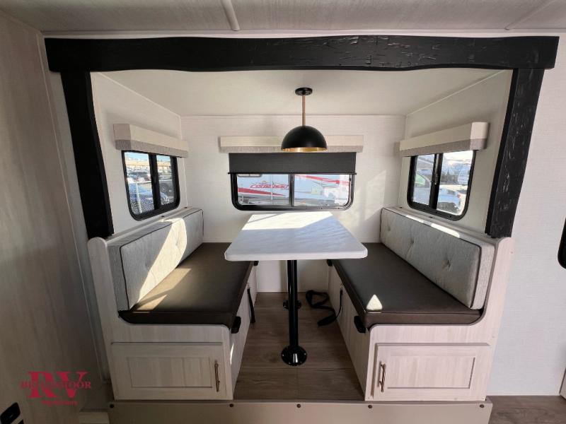 This travel trailer offers a great flexible floorplan. The living area sofa hides a Murphy bed which can be folded down at night, giving you full use of the room during the day. At the rear is a pair of double-size bunks which provide a spacious private sleeping area for children or guests. The booth dinette can also be used for an additional bed as needed. An efficient kitchen includes a bar top with high chairs plus a convection microwave and cooktop to cook meals each day. This model also includes the Hood River Edition that comes with Mud Legend all terrain tires with TPMS, advanced ground clearance, a MaxxAir vent cover, and 12V tank heaters!