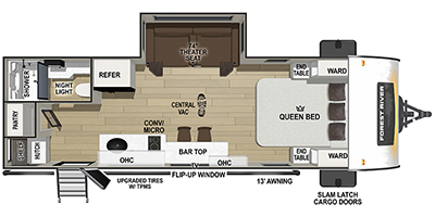 A front bedroom with a walk-around queen bed, a full bath, and a theater seat slide out are a few of the features that you are sure to want in your next RV! You can rest comfortably each night, plus all your clothing can be stored in the dual wardrobes to keep everything tidy. If you're needing more sleeping space, just choose the optional tri-fold sofa or optional booth dinette in place of the theater seat! The chef of your group can make meals on the two-burner cooktop or in the air fryer microwave, and there is a 12V black glass refrigerator for perishables. And the bar top with two seats and the flip-up window provide a great view outdoors as you dine together.