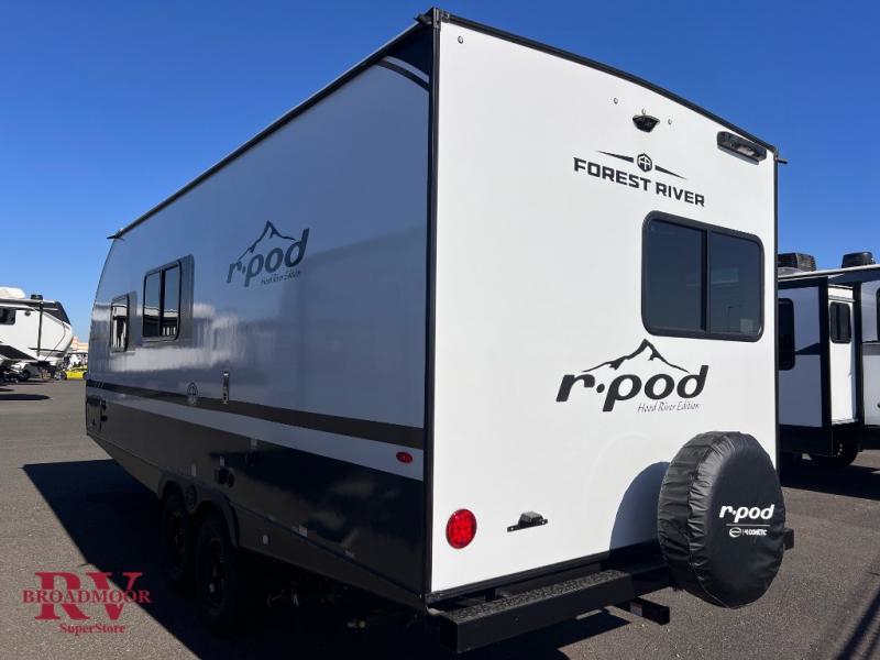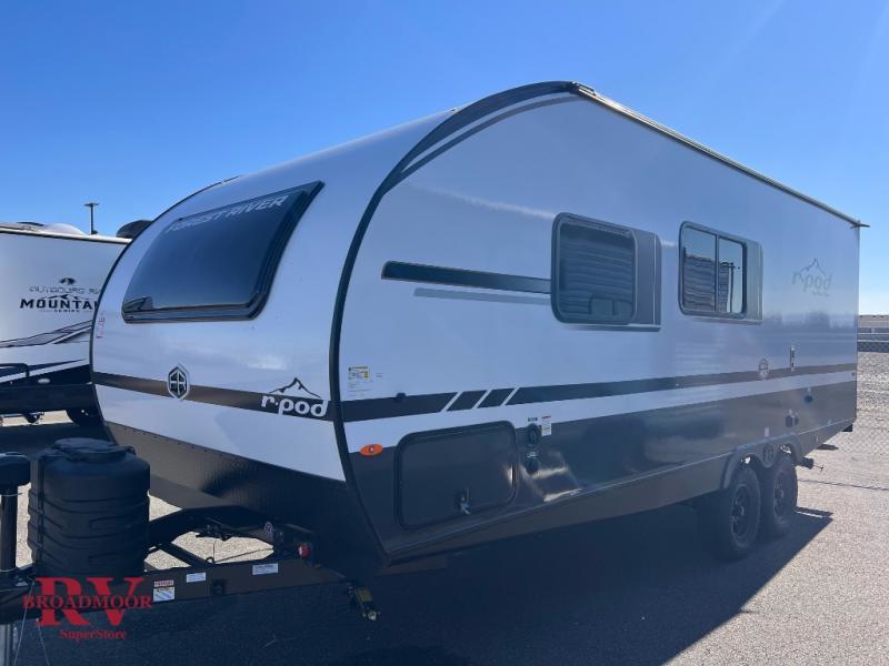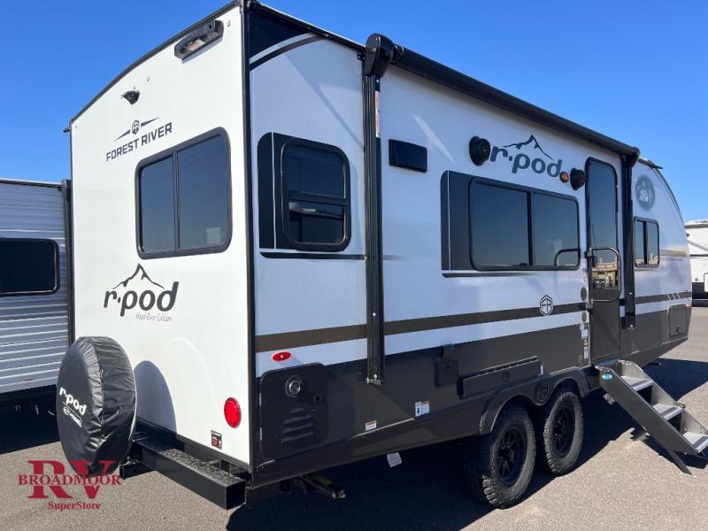 With any R-Pod travel trailer by Forest River, you will enjoy affordable luxury at the lowest tow weight in its class! There is a sealed underbelly with forced heat, a curved dual-pane acrylic front window with a bug screen and night shade, plus a large roof mounted solar panel for off-grid capabilities. The 15K A/C unit will keep you comfortable during the summer camping months, and the tankless water heater will provide endless hot showers after hiking, biking, swimming and more! Each model also includes a black glass friction hinge entrance door, roof ladder prep, exterior motion lighting, plus a hot and cold exterior spray port to wash off sand from the beach. Inside, you'll enjoy seamless Surf-X kitchen countertops, blackout roller shades, and a central vacuum system for hassle-free cleaning!