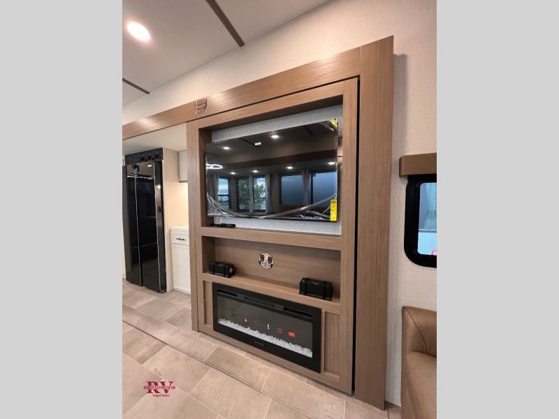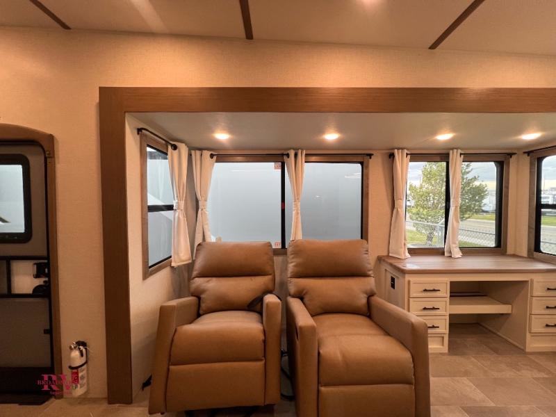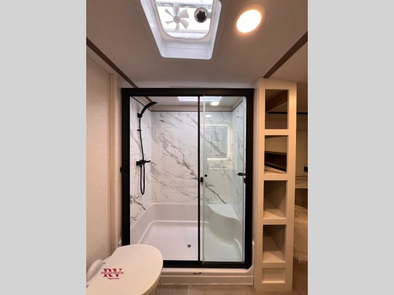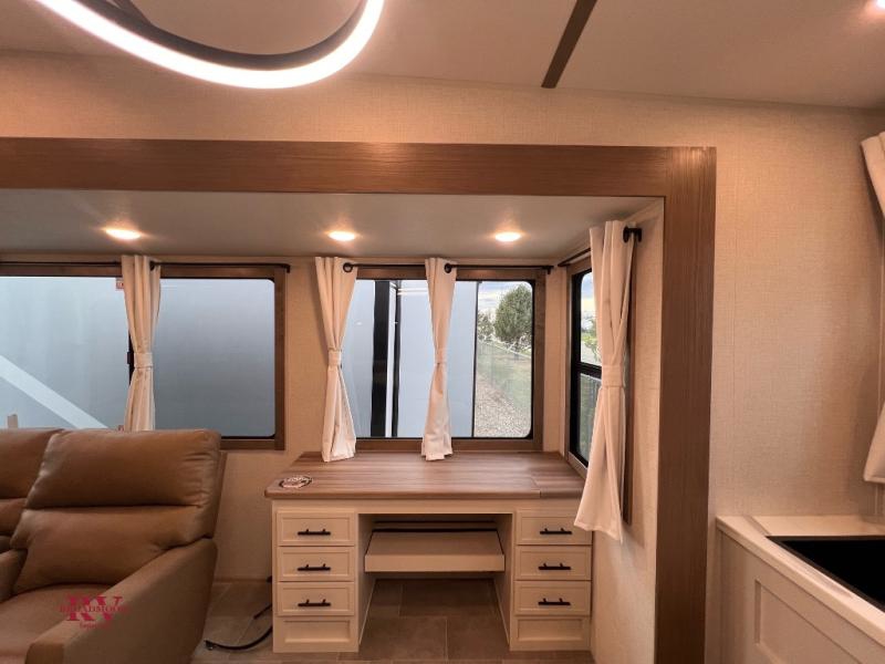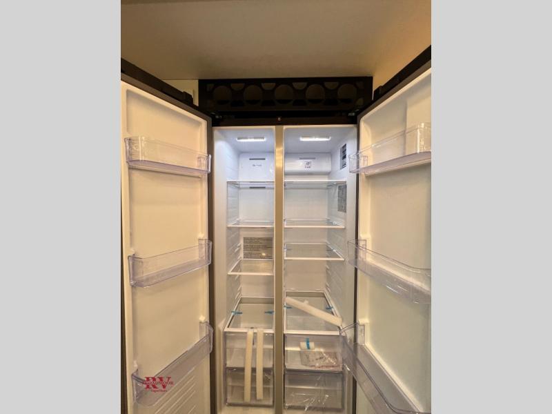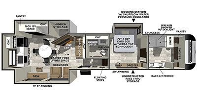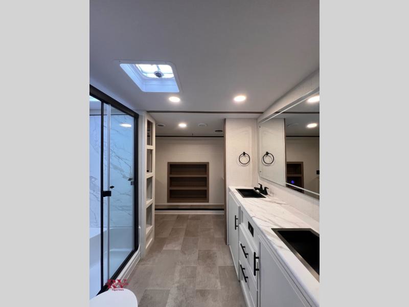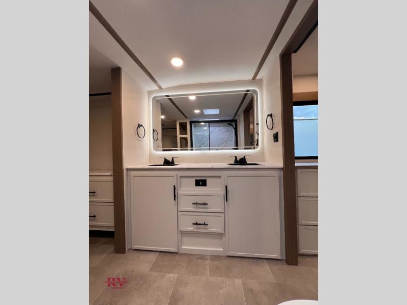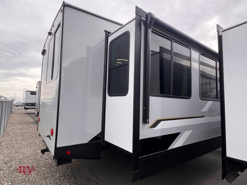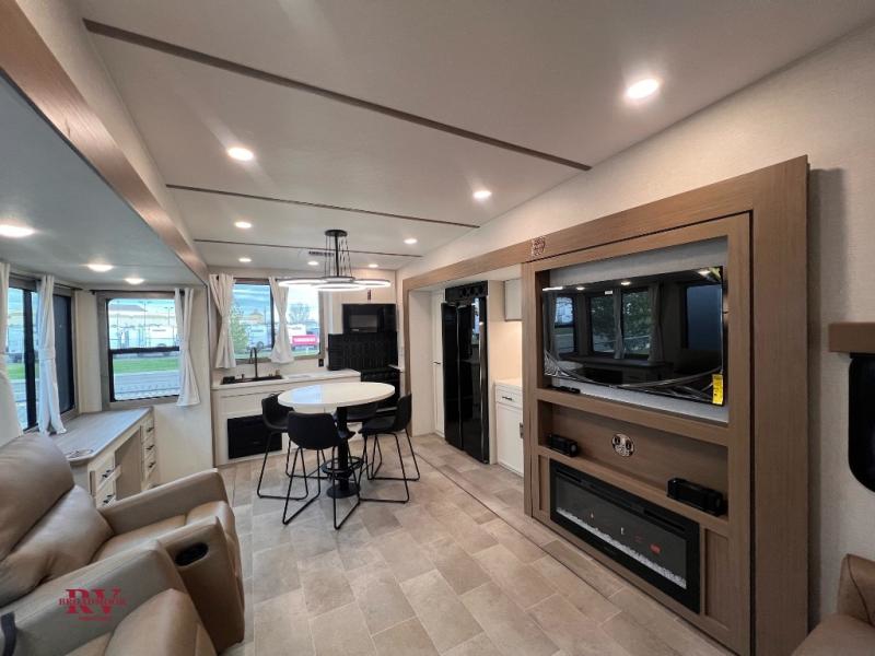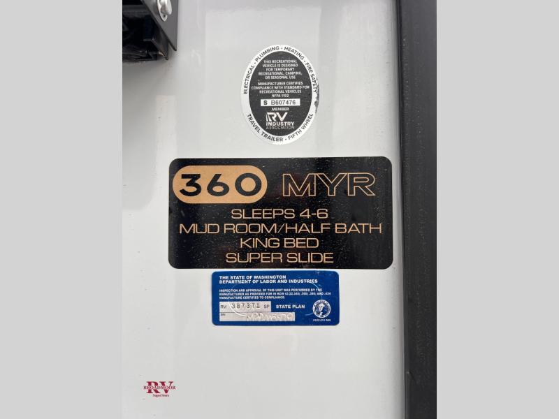 There are many residential features in this 360MYR model, such as a middle table with four seats, dual recliners, a desk to get some work done, and a master bedroom you are sure to love. You'll find a king bed with Versa Tilt technology, a dresser, and TV prep. A front master bath includes a walk-in shower with a skylight, dual bath sinks with a back-lit mirror, and a closet with shelves. The middle half bath includes washer/dryer prep, counter space and a shelf for all your essentials, clothes, and gear. Everyone will enjoy spending time in the main living room that includes dual opposing slides, a tri-fold sofa, and an entertainment center with hidden storage behind. And the chef of your group will love the rear kitchen with its 16 cu. ft. 12V refrigerator and pantry, an oven, and plenty of counter space. Head outdoors to enjoy the two power awnings in the evening!