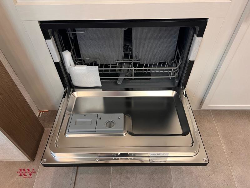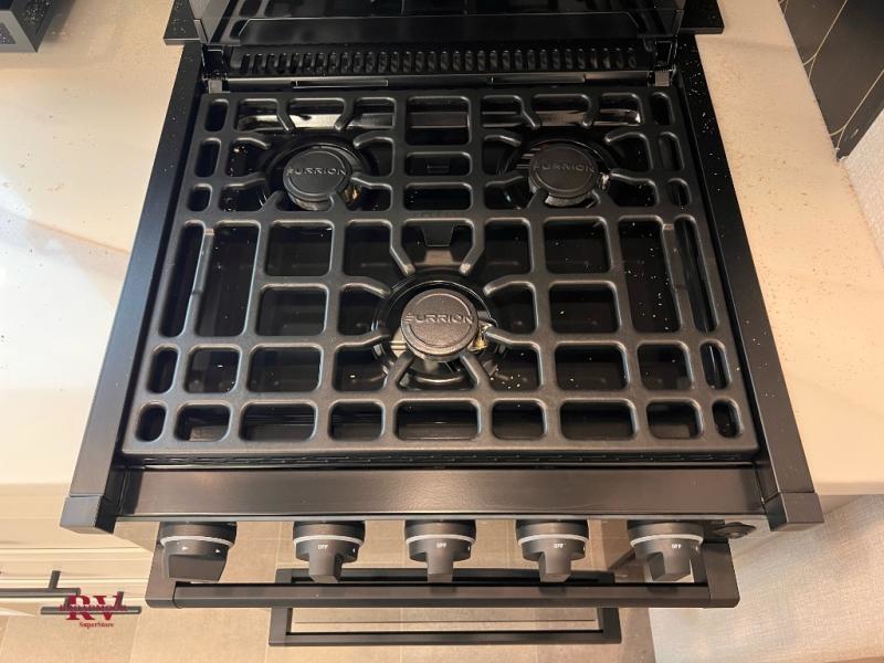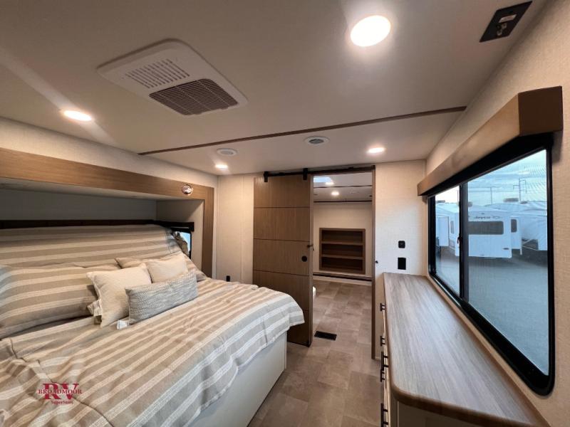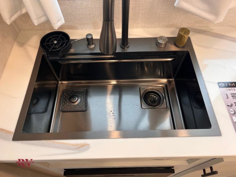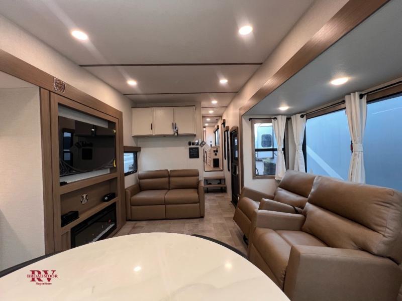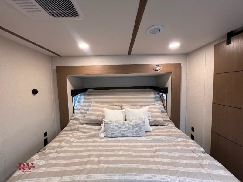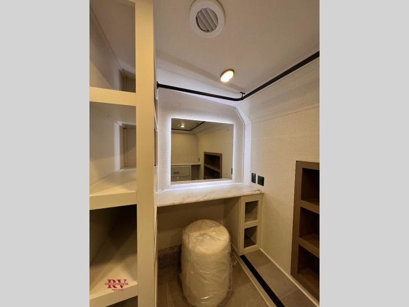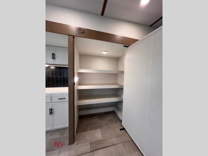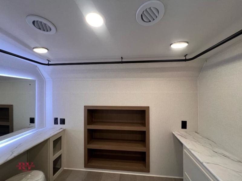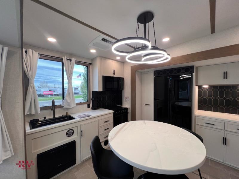 There are many residential features in this 360MYR model, such as a middle table with four seats, dual recliners, a desk to get some work done, and a master bedroom you are sure to love. You'll find a king bed with Versa Tilt technology, a dresser, and TV prep. A front master bath includes a walk-in shower with a skylight, dual bath sinks with a back-lit mirror, and a closet with shelves. The middle half bath includes washer/dryer prep, counter space and a shelf for all your essentials, clothes, and gear. Everyone will enjoy spending time in the main living room that includes dual opposing slides, a tri-fold sofa, and an entertainment center with hidden storage behind. And the chef of your group will love the rear kitchen with its 16 cu. ft. 12V refrigerator and pantry, an oven, and plenty of counter space. Head outdoors to enjoy the two power awnings in the evening!