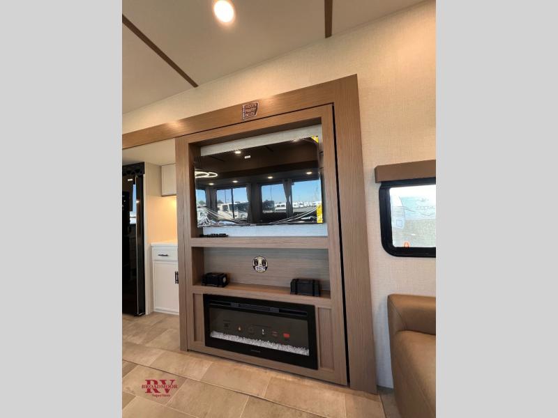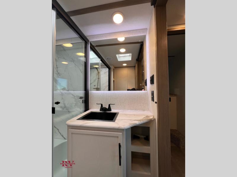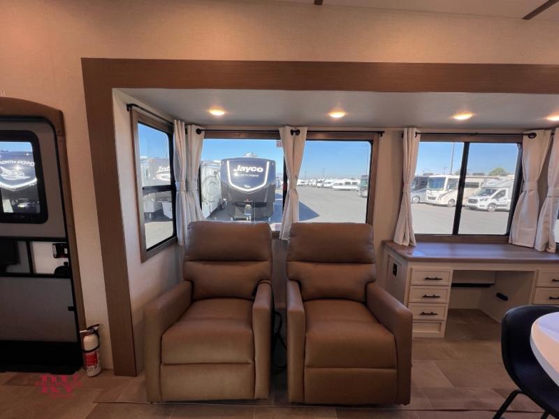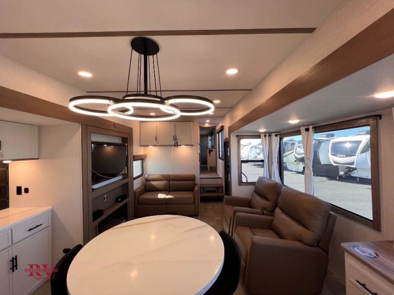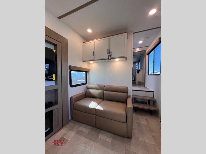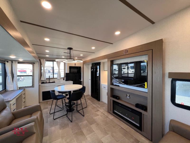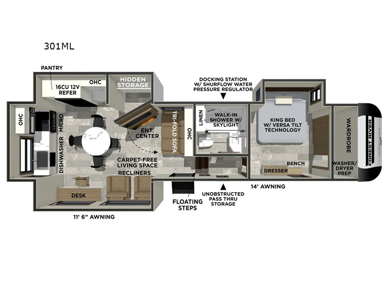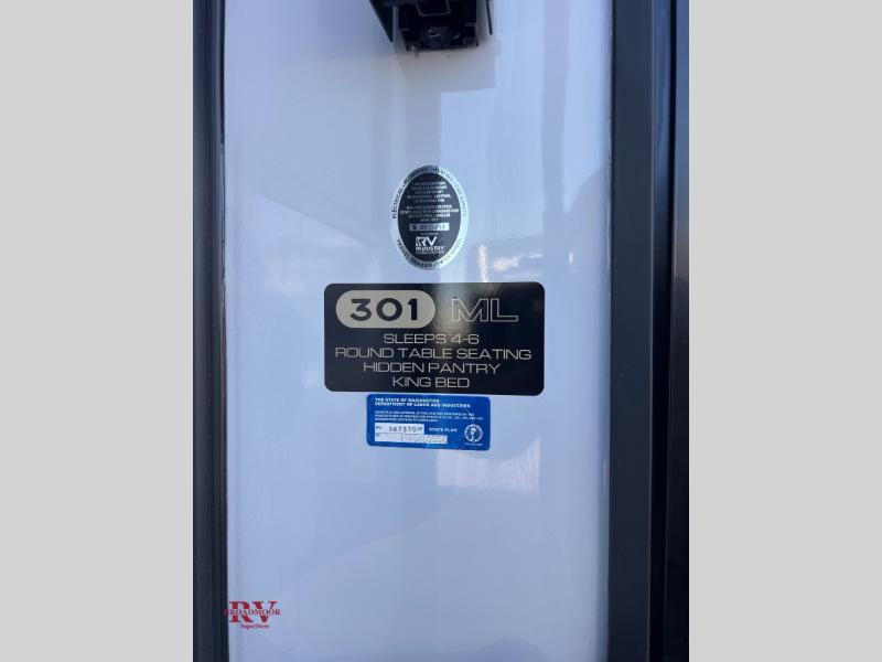 With this 301ML model, the main living area of this travel trailer is truly the heart of the home, featuring a spacious table and chairs perfect for gathering around during dinner or enjoying a fun board game, all while watching TV with hidden storage behind it to keep your essentials and snacks neatly tucked away. For added comfort, there’s a versatile trifold sofa that doubles as extra sleeping space, or you can relax in the cozy recliners and kick your feet up. Next to the recliners is a convenient desk, ideal for studying or working from home. The full rear kitchen is fully equipped with modern conveniences, including a dishwasher and a spacious 16-cubic-foot refrigerator. Moving toward the center, you’ll find a full bathroom with a walk-in shower and skylight, while the front of the trailer boasts a private bedroom complete with a king bed featuring Versa Tilt technology, a dresser, bench, and wardrobe to ensure maximum comfort and storage.