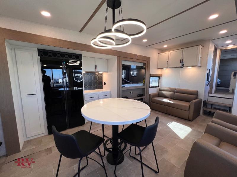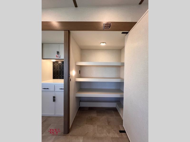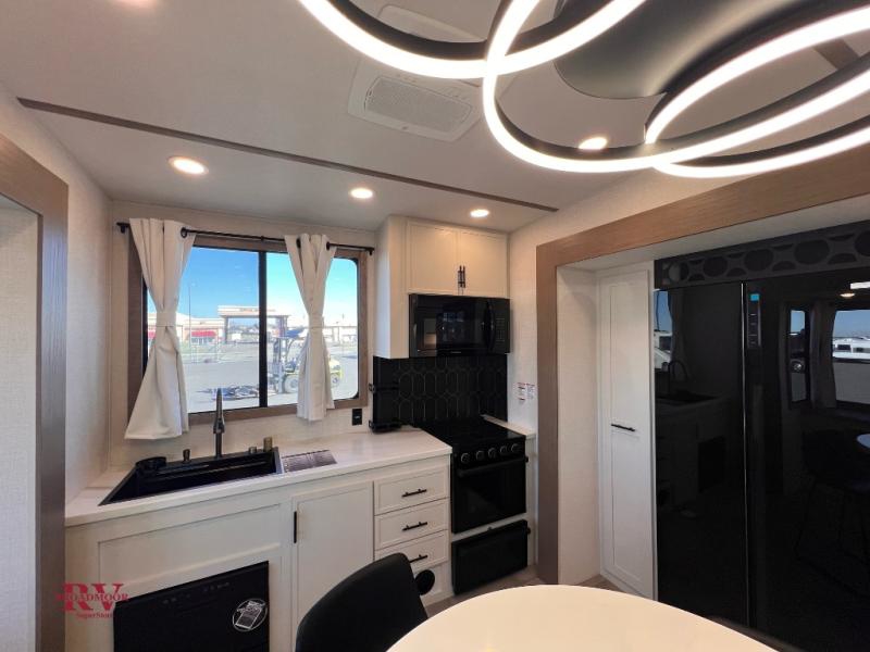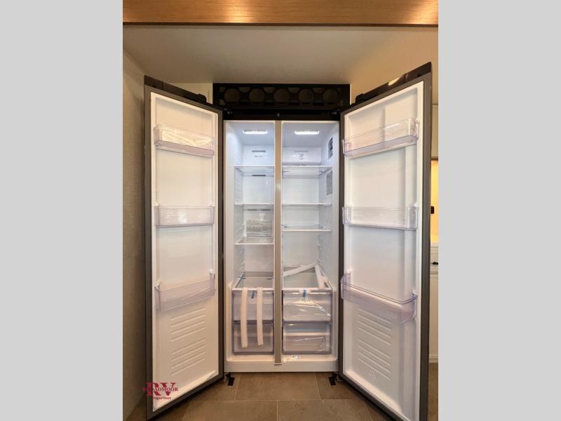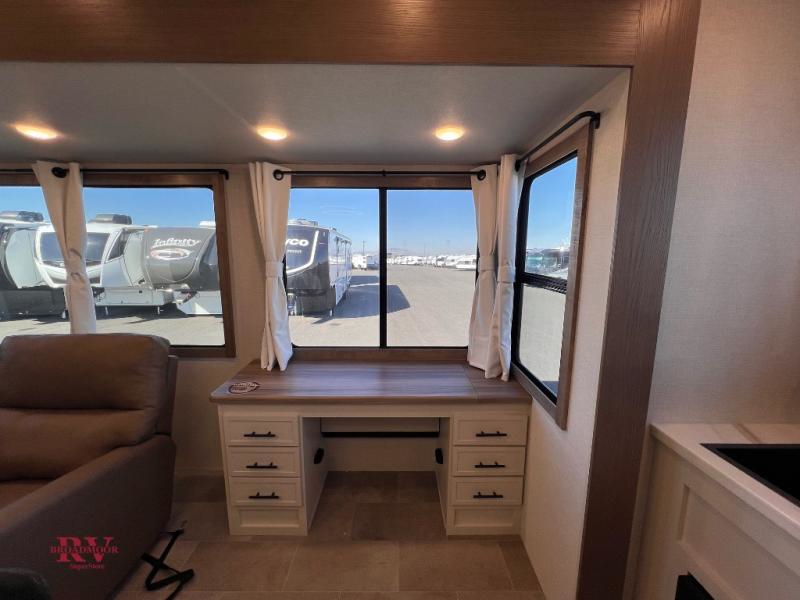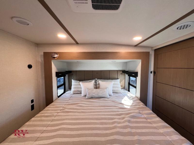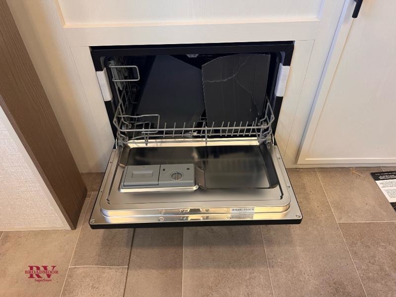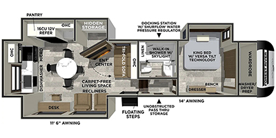With this 301ML model, the main living area of this travel trailer is truly the heart of the home, featuring a spacious table and chairs perfect for gathering around during dinner or enjoying a fun board game, all while watching TV with hidden storage behind it to keep your essentials and snacks neatly tucked away. For added comfort, there’s a versatile trifold sofa that doubles as extra sleeping space, or you can relax in the cozy recliners and kick your feet up. Next to the recliners is a convenient desk, ideal for studying or working from home. The full rear kitchen is fully equipped with modern conveniences, including a dishwasher and a spacious 16-cubic-foot refrigerator. Moving toward the center, you’ll find a full bathroom with a walk-in shower and skylight, while the front of the trailer boasts a private bedroom complete with a king bed featuring Versa Tilt technology, a dresser, bench, and wardrobe to ensure maximum comfort and storage.