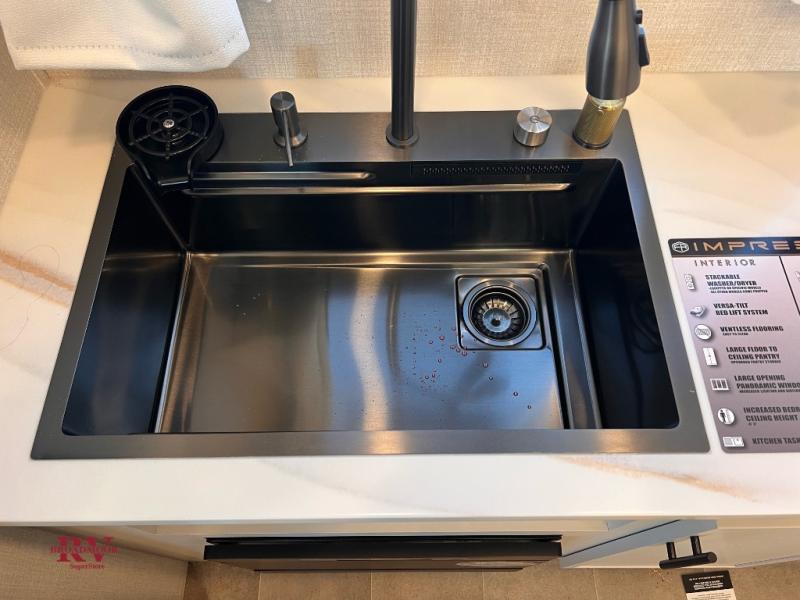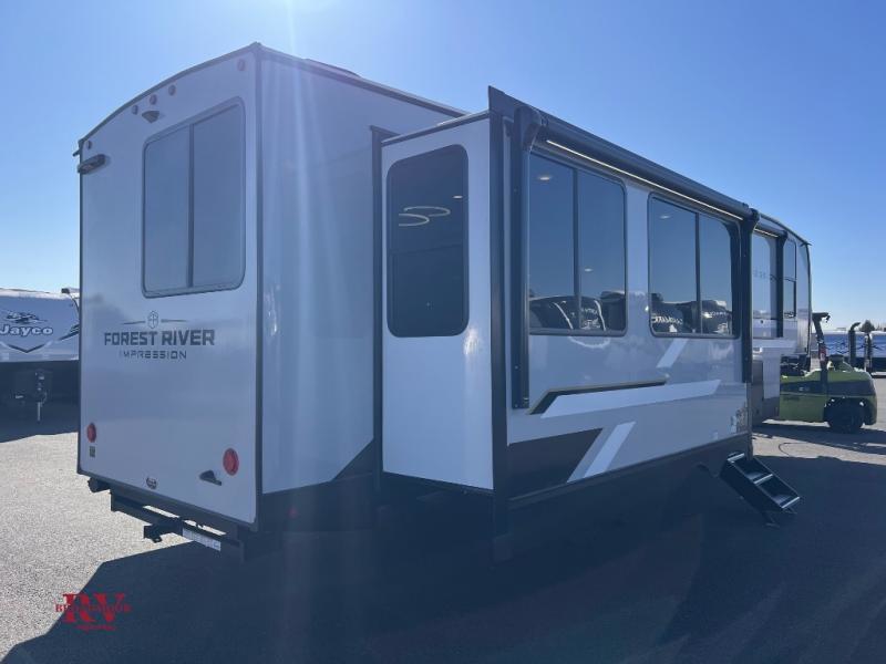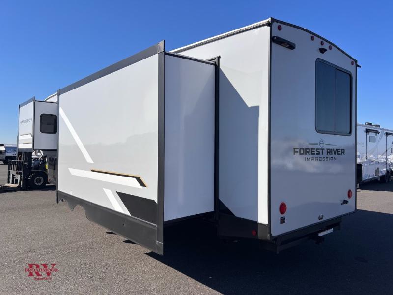 With any Impression fifth wheel by Forest River, the focus of the design is comfort and value, built with quality craftsmanship and attention to customer's desires in each Impression! The exterior includes upgraded E-rated tires, custom exterior graphics package, and insulated slam latch baggage doors. There is also an enclosed docking station, an outside shower, and a 100W roof panel for off-grid capabilities. The fully heated and enclosed AccessiBelly has removable underbelly panels along with enclosed tank valves. There is an industry leading 15K A/C plus 35K BTU furnace to keep you comfortable. The interior has lumbercore cabinetry, residential linoleum, residential backsplash in the kitchen, and oversized opening windows in the living area for more natural lighting and good air flow.