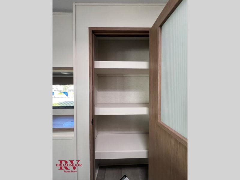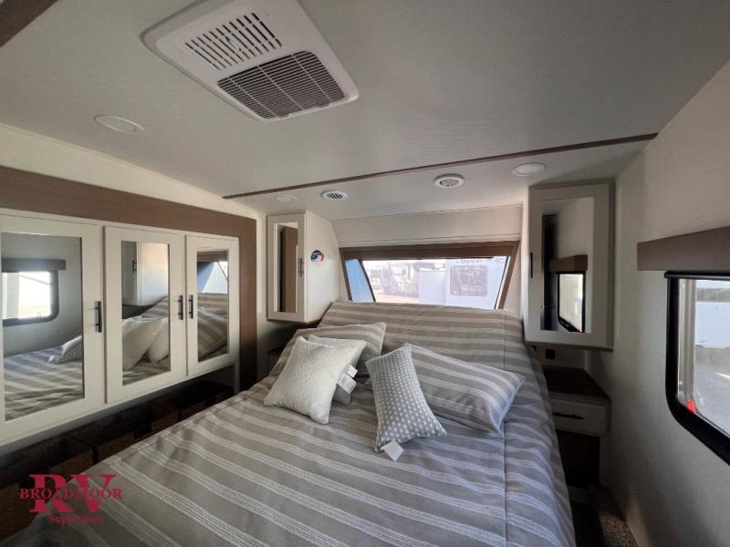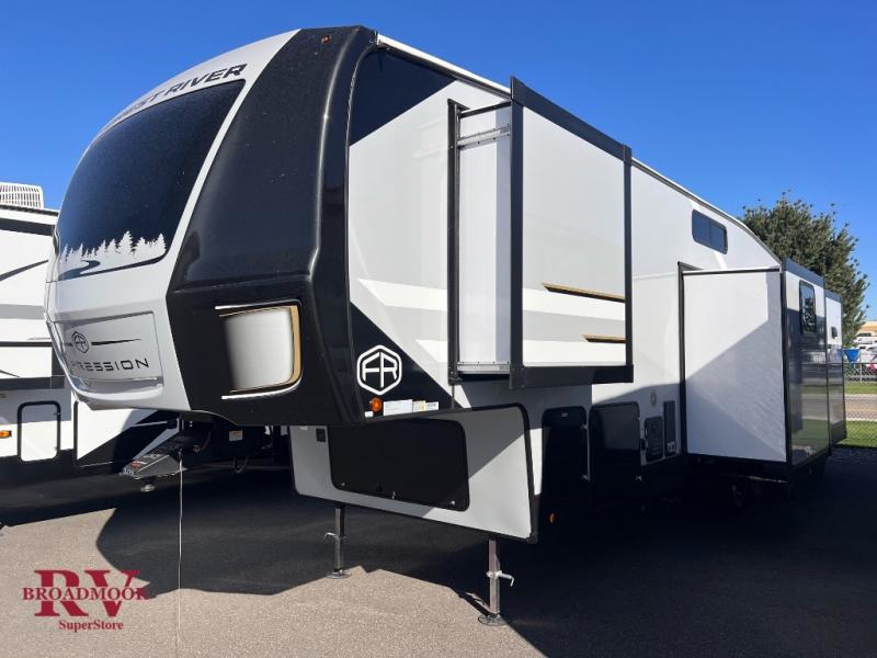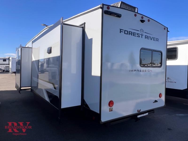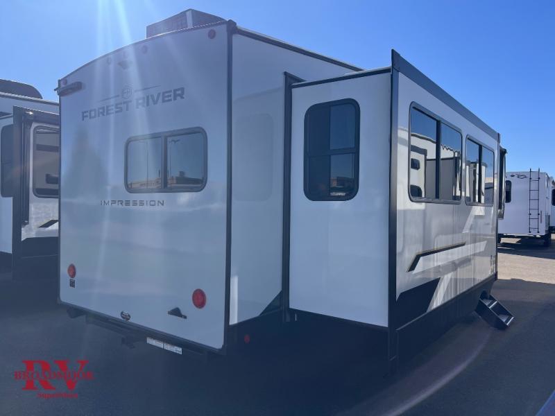 With any Impression mid-profile fifth wheel by Forest River, the focus of the design is comfort and value, built with quality craftsmanship and attention to customer's desires in each Impression! The exterior includes upgraded E-rated tires, custom exterior graphics package, and insulated slam latch baggage doors. There is also an enclosed docking station, an outside shower, and a 100W roof solar panel for off-grid capabilities. The fully heated and enclosed AccessiBelly has removable underbelly panels and offers four seasons of travel, and there is an industry leading 15K A/C plus 35K BTU furnace to keep you comfortable. The interior has lumbercore cabinetry, residential linoleum, residential backsplash in the kitchen, and oversized opening windows in the living area for more natural lighting and good air flow.