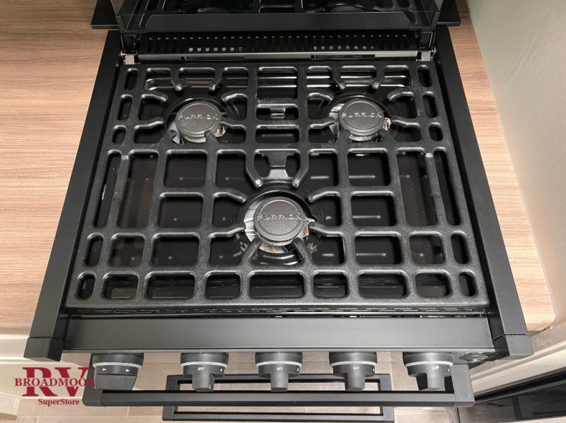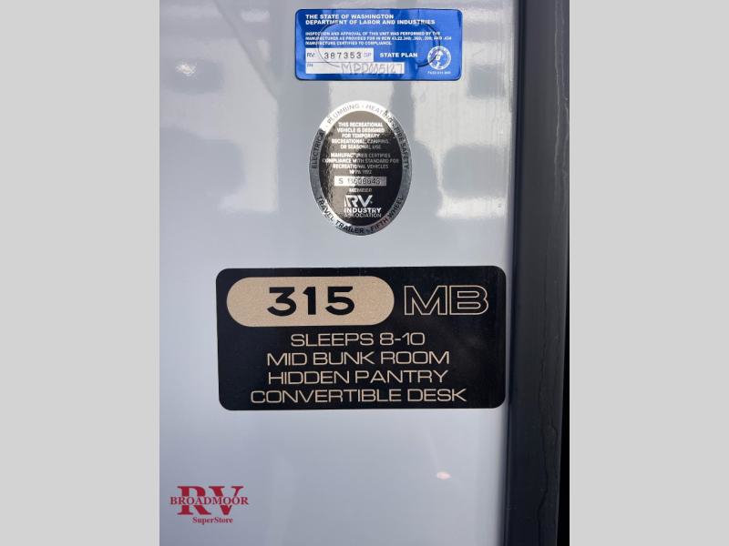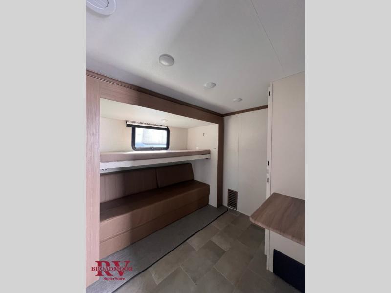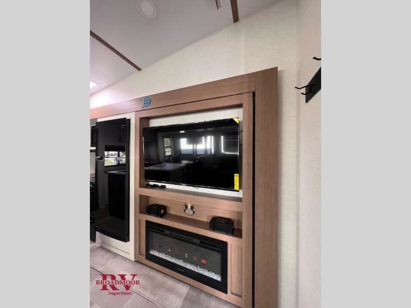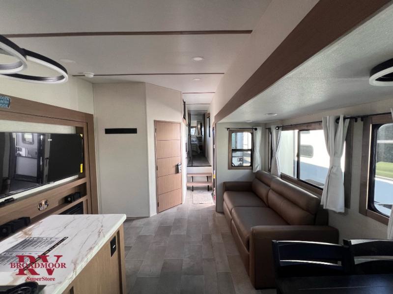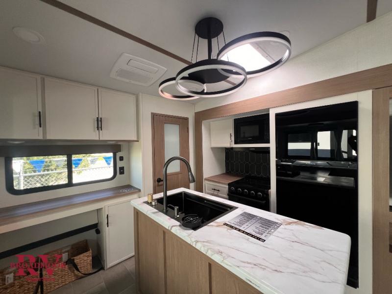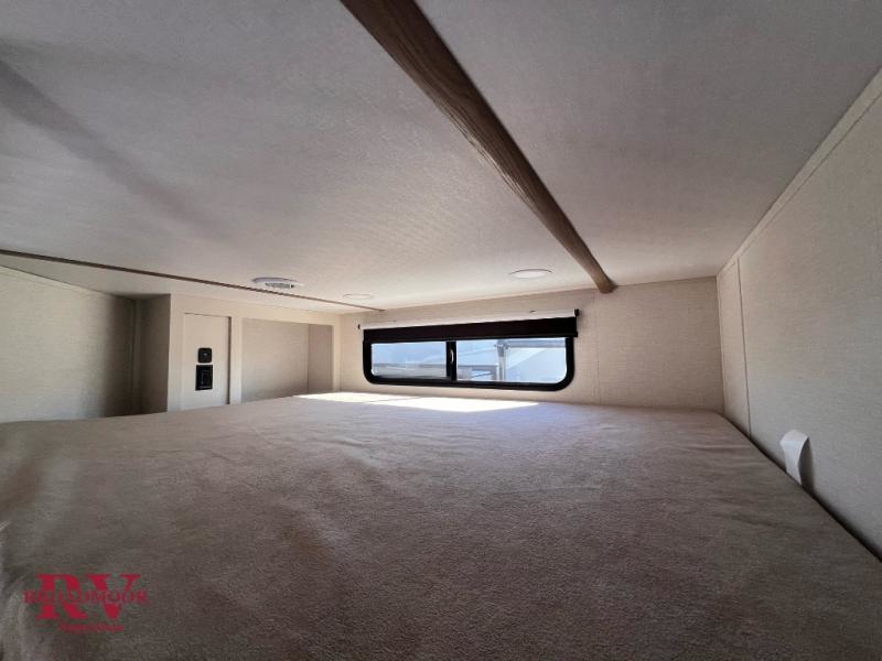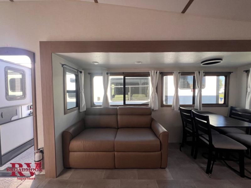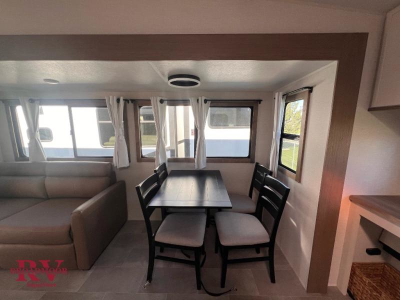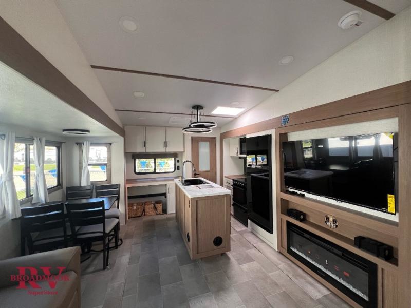 Wow! This fifth wheel will surely make an impression with its middle bunkhouse that can be utilized as an extra bedroom, second living room or even an office thanks to the desk and sofa that becomes a Versa queen bed at night. You will also find a flip-down upper bunk, a slide out for more floor space, and a wardrobe for clothing. The full bathroom is between this room and the front bedroom that offers lots of storage including a slide out wardrobe, a space prepped for a washer/dryer option, nightstands to place your cellphone and such, plus a queen bed with Versa Tilt technology. The rear kitchen includes plenty of storage for your dishes, pans, drinkware, and dry goods. The cook will love the kitchen island, the full amenities as well as the choice to use the outside kitchen to help feed everyone. And the free standing dinette with chairs plus the so a theater seating offer seating inside.