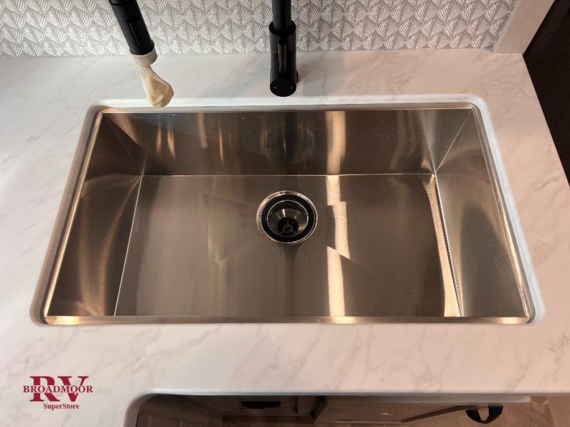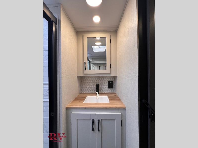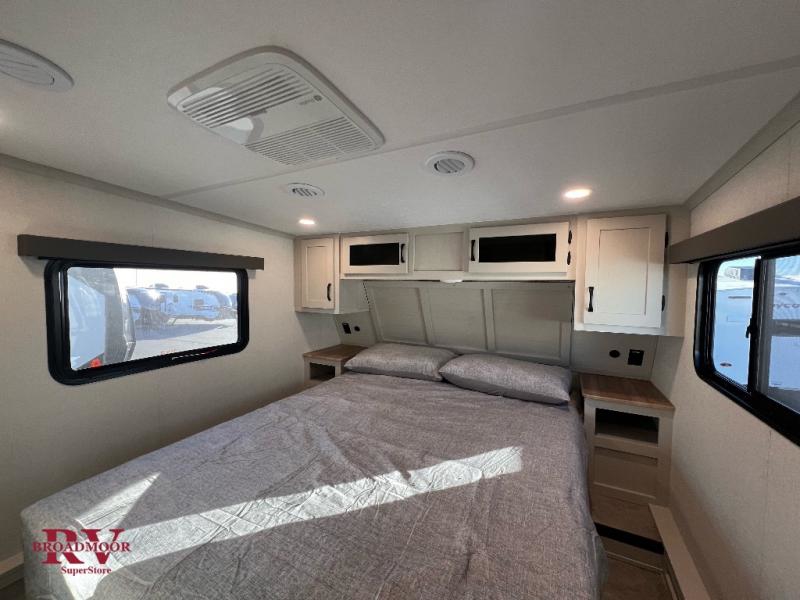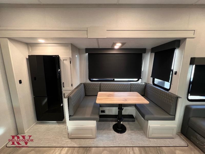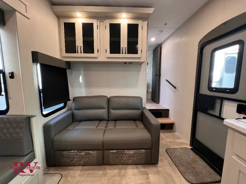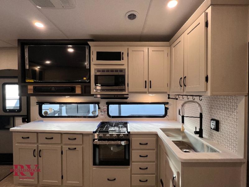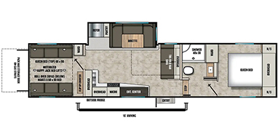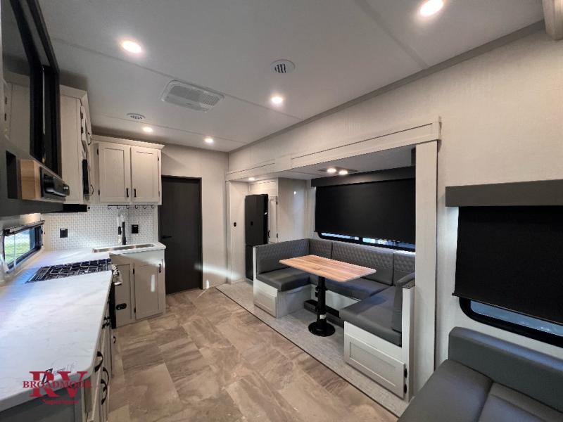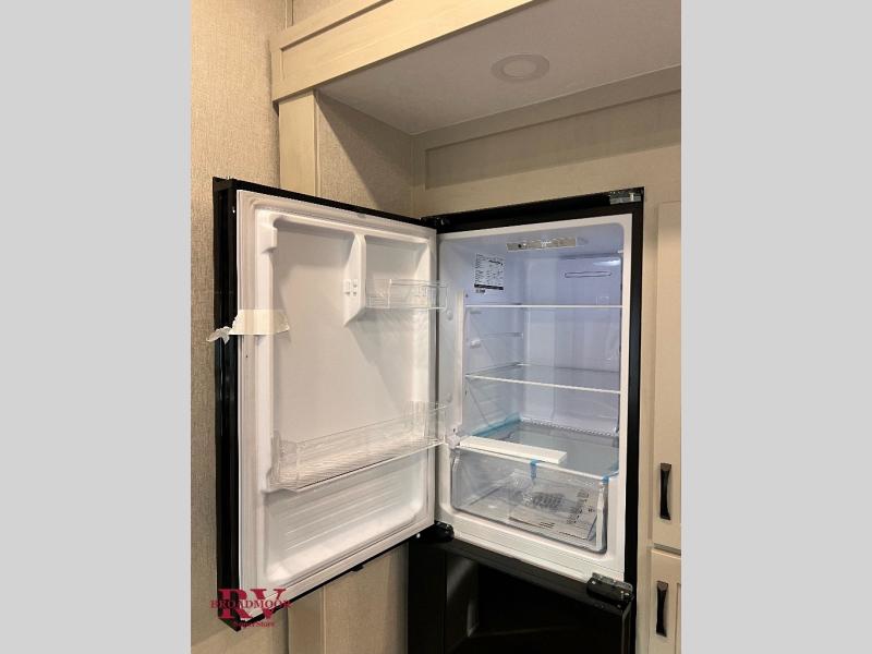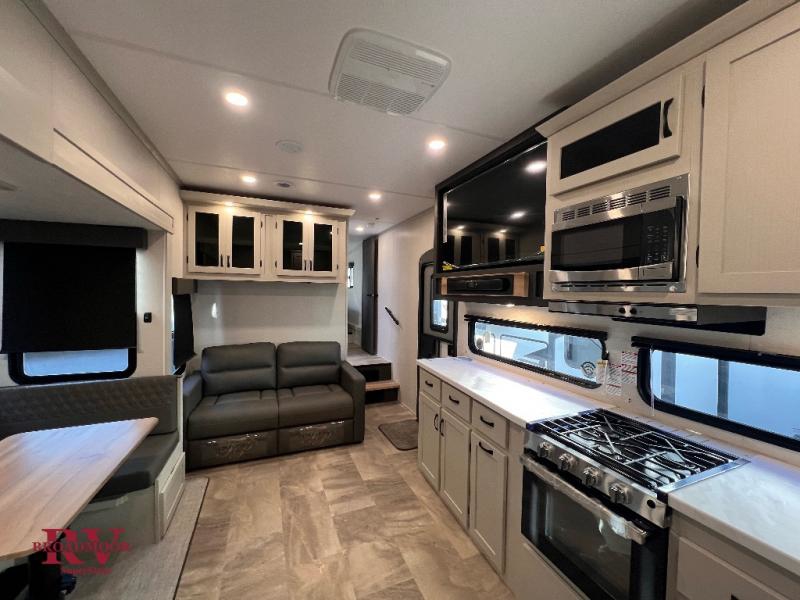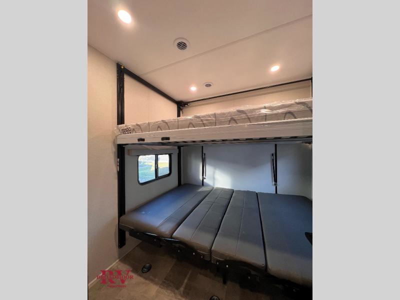 This unique fifth wheel allows you to bring along bikes, kayaks, and extra camp gear thanks to the rear Pack Max storage door on gas struts. Once you've unloaded your gear, you can relax on the roll over sofas that will convert to a queen-size bed. There is also a top queen bed above the sofas for more sleeping space, along with a door to make this your guests' bedroom at night. You'll have the front bedroom all to yourselves with a queen bed, dual nightstands, and a wardrobe for clothes, and the full bath is close by for easy nighttime use. In the morning, everyone can meet in the combined kitchen and living area to dine around the U-shaped dinette or relax on the tri-fold sofa.