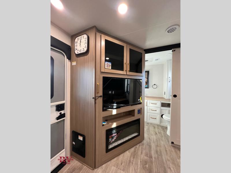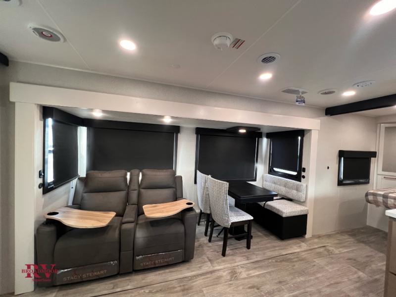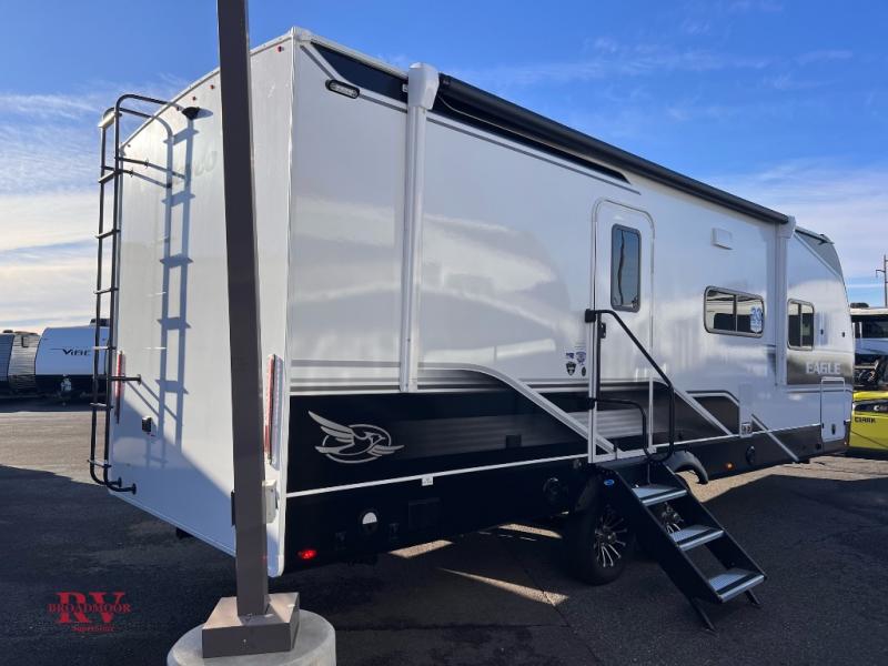 With any Eagle HT fifth wheel or travel trailer by Jayco you will enjoy a smooth drive thanks to the 4 Star Handling Package and MORryde CRE-3000 rubberized suspension. The Customer Value Package includes amenities that are sure to make camping easier than ever, like the 60K on-demand water heater, Keyed-Alike lock system, 15,000 BTU "Whisper Quiet" A/C, and more. Handcrafted door/drawer fronts will make your space feel more like home, along with residential vinyl flooring throughout, GE appliances, and blackout roller shades with reflective side throughout to keep the sun out when you want to sleep in. Each model also includes a NuVo H2O water treatment system with filters included, interior and exterior "Blue Sync" audio connect with MB Quart Sound for your TV and phone, and 100% no floor vents for added comfort and convenience!