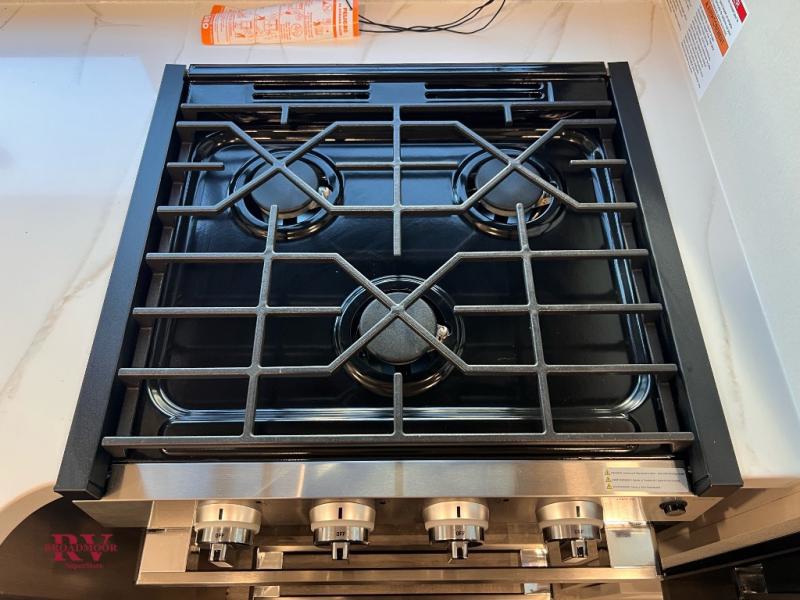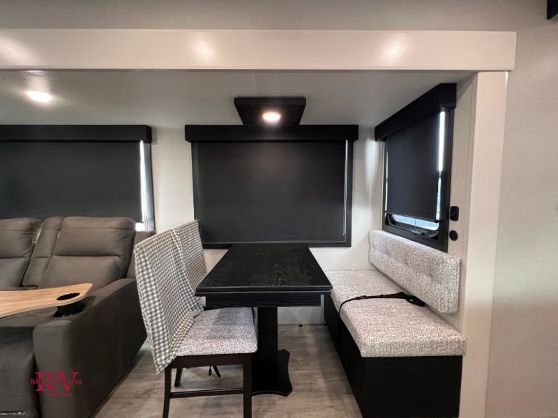 There's a lot to love about this travel trailer, from the full rear bath to the front private bedroom with an Olympic queen-size bed! The tri-fold sofa with cup holders will provide a comfy place to relax, and there is a table with chairs and a bench to dine at, and both of these pieces of furniture are within a large slide out for more floor space. The fully-equipped kitchen comes with a GE microwave and 21 in. range plus a GE 10 cu. ft. 12V refrigerator and walk-in pantry for food storage. And an exterior Jayport with LP Quick Connect and hot/cold water makes it possible to hook up your own grill!