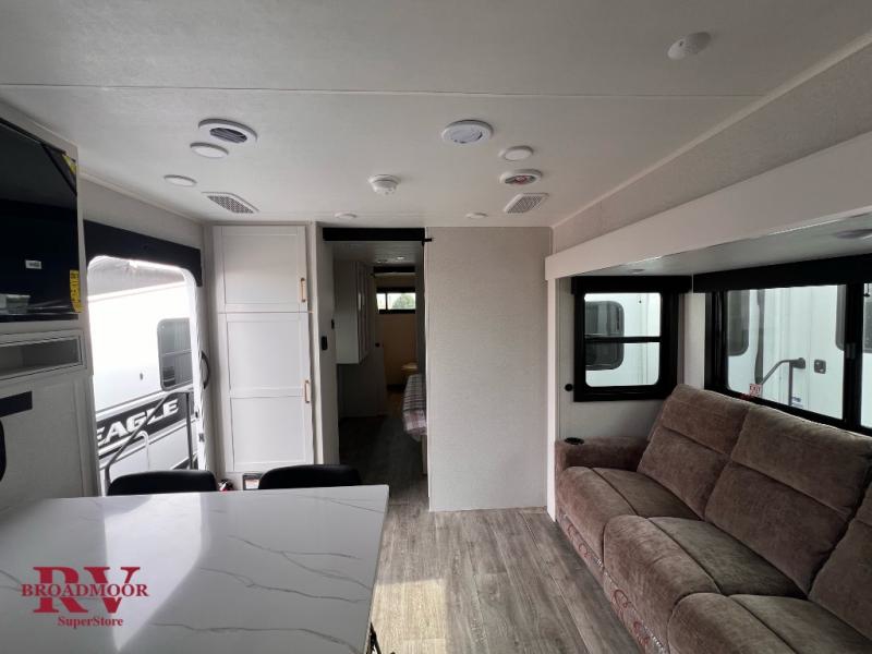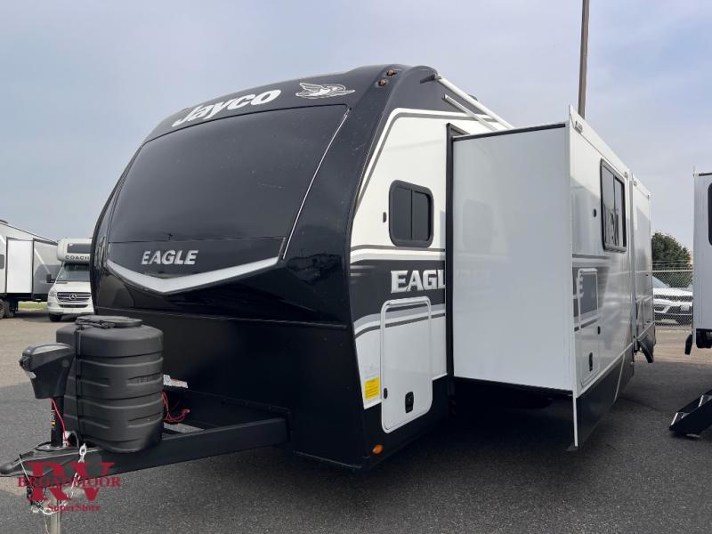 With any Eagle HT fifth wheel or travel trailer by Jayco you will enjoy a smooth drive thanks to the 4 Star Handling Package and MORryde CRE-3000 rubberized suspension. The Customer Value Package includes amenities that are sure to make camping easier than ever, like the 60K on-demand water heater, Keyed-Alike lock system, 15,000 BTU "Whisper Quiet" A/C, and more. Handcrafted door/drawer fronts will make your space feel more like home, along with residential vinyl flooring throughout, GE appliances, and blackout roller shades with reflective side throughout to keep the sun out when you want to sleep in. Each model also includes a NuVo H2O water treatment system with filters included, interior and exterior "Blue Sync" audio connect with MB Quart Sound for your TV and phone, and 100% no floor vents for added comfort and convenience!