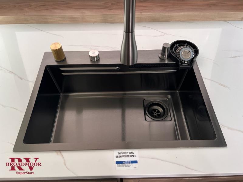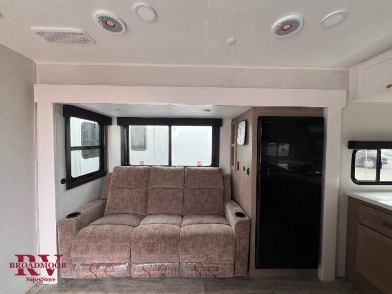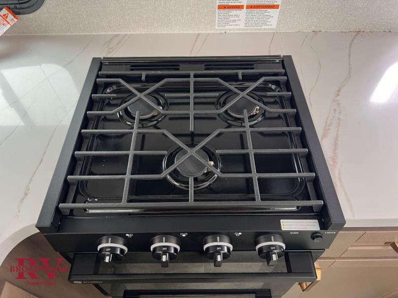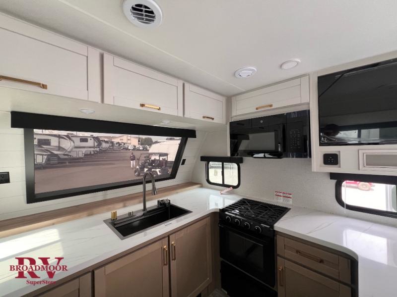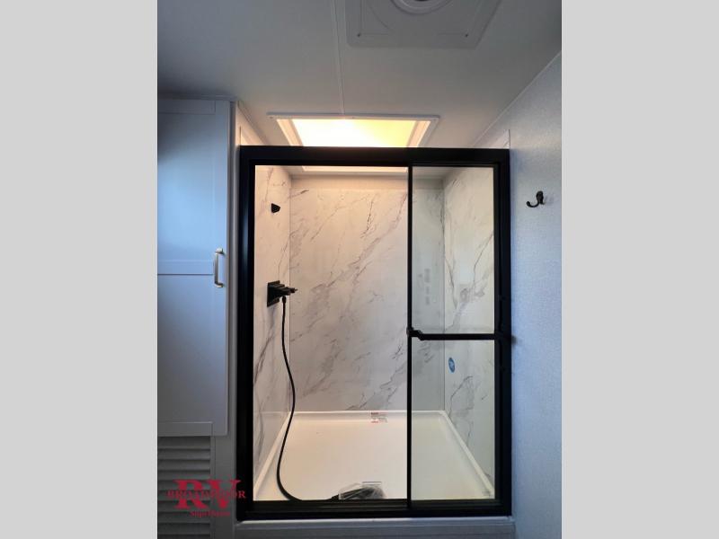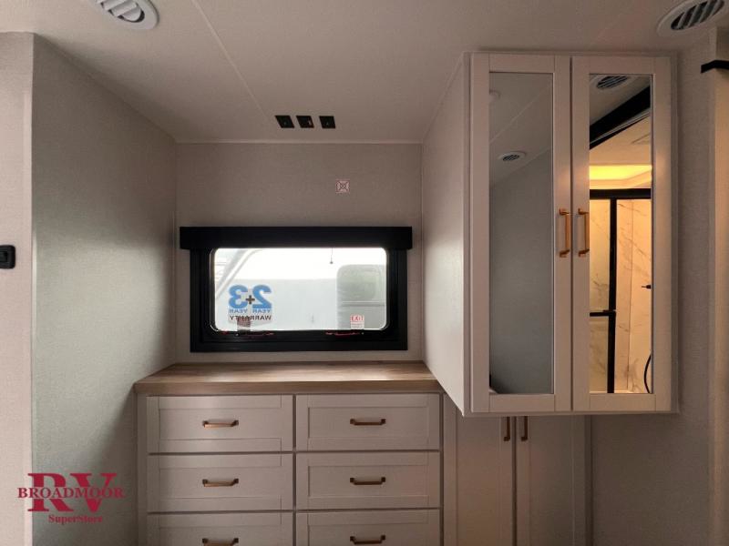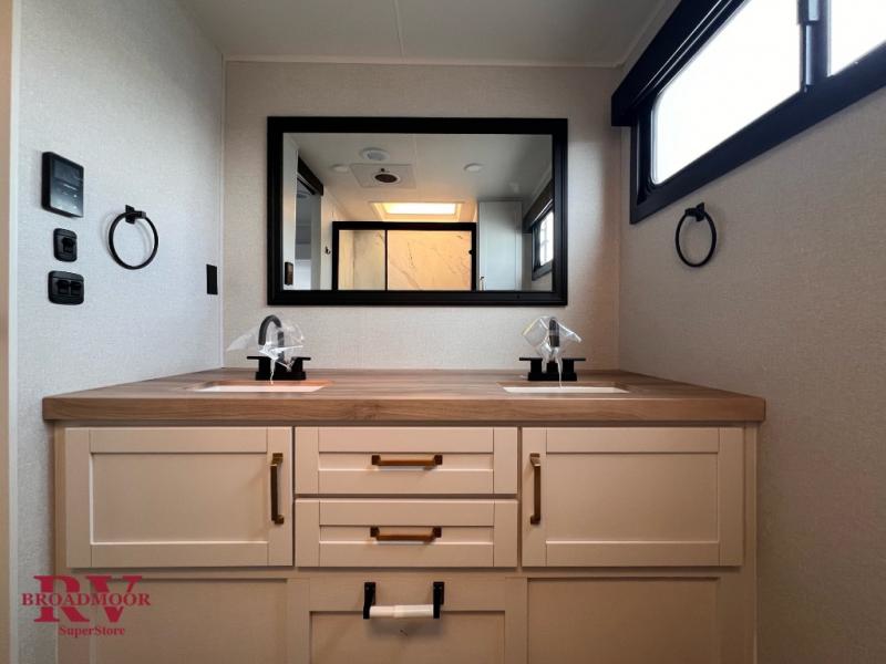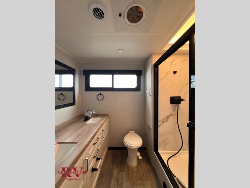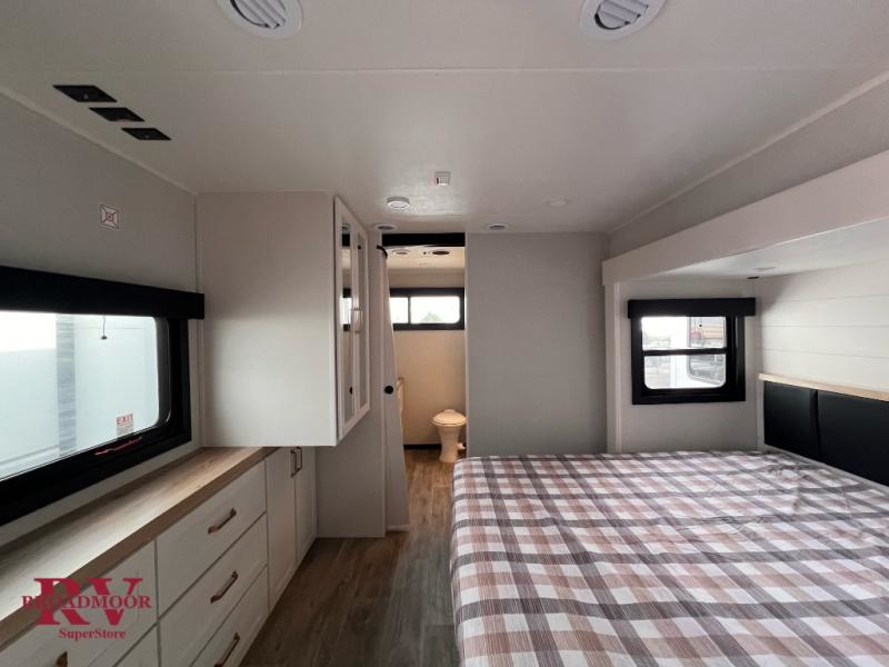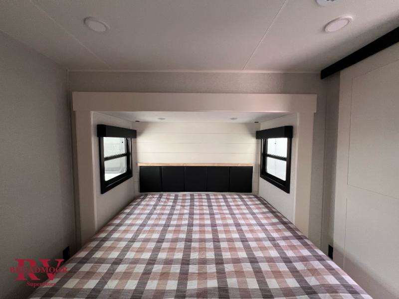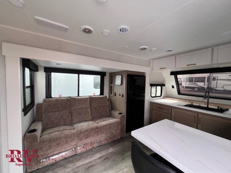 This is the perfect travel trailer for the couple who loves comfort at the campground! The front kitchen features ample counter space, including a bartop with barstool chairs and all the appliances to make your best meals. If you'd rather be outside, there is an outdoor kitchen and a power awning where you can spend your evenings. The master bedroom includes an Olympic-size queen bed slide out, a dresser, plus a wardrobe with washer and dryer prep. And don't overlook the full rear bath, complete with a 30" x 48" shower, a linen closet, and dual bath sinks so you both can get ready at the same time!