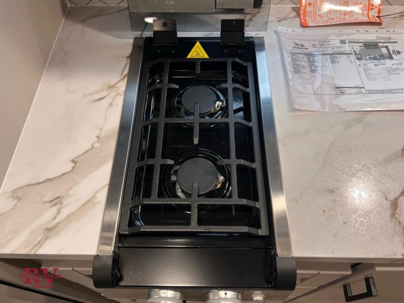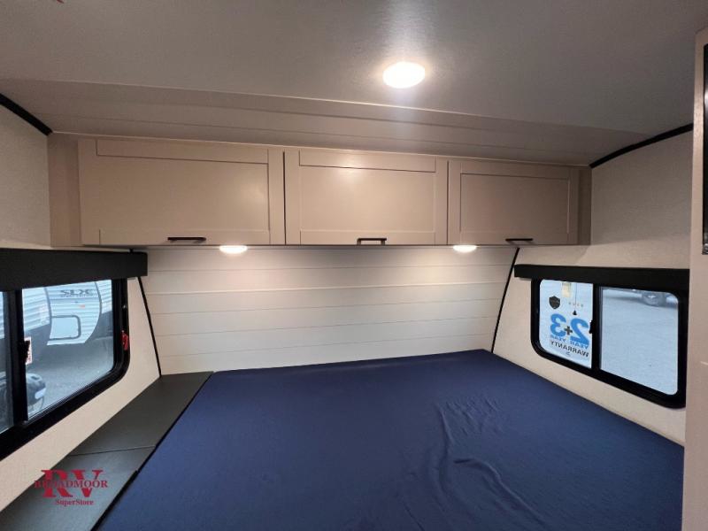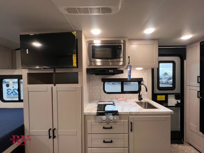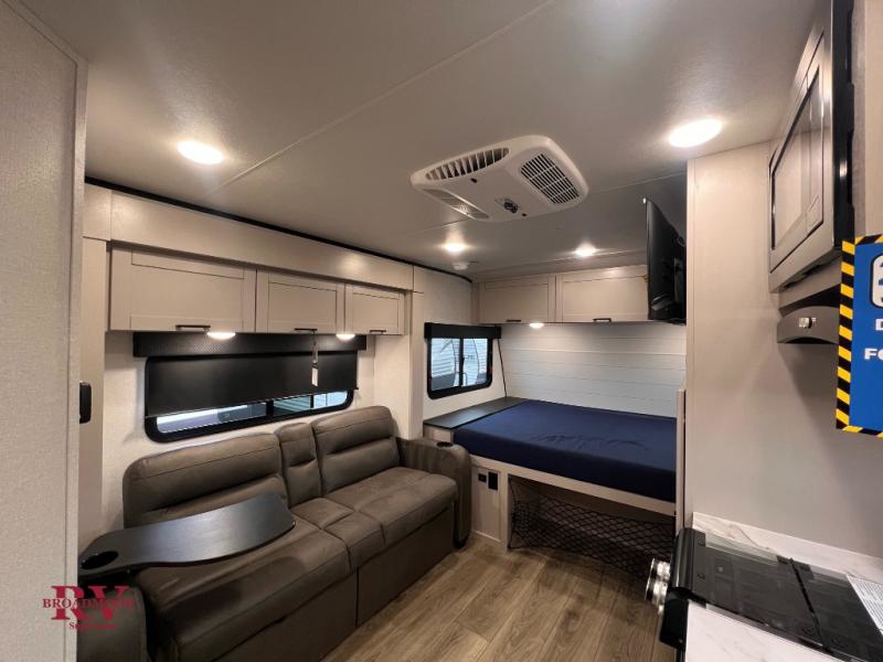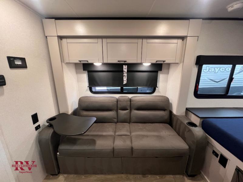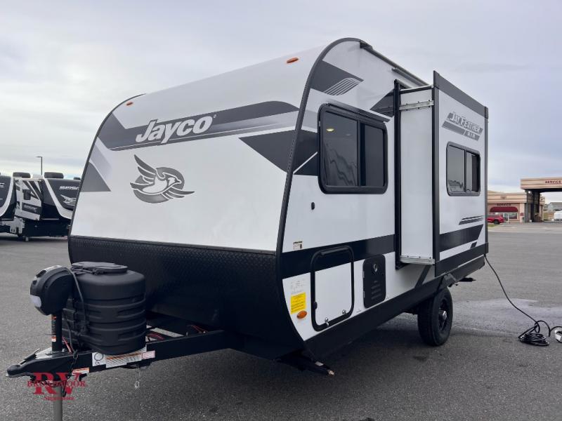 The perfect couple's trailer is found with this Jay Feather Air! You can sleep soundly each night on the front queen bed that includes a large overhead cabinet for books, board games and more. There is also a TV cabinet with a wardrobe below for even more storage. A Jack-knife sofa slide out includes table trays, giving you a place to dine together, and an overnight guest could sleep here if needed. Whip up your best meals on the two burner cooktop or in the microwave, and there is a refrigerator plus a pantry for food storage. The full bath includes a radius shower, a sink with a medicine cabinet, and a toilet with an overhead cabinet to keep all your toiletries tucked away.