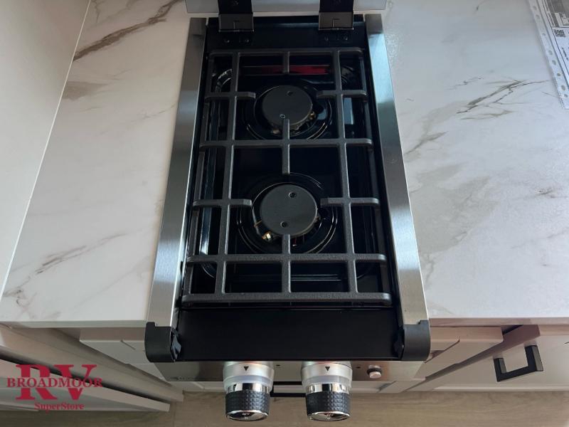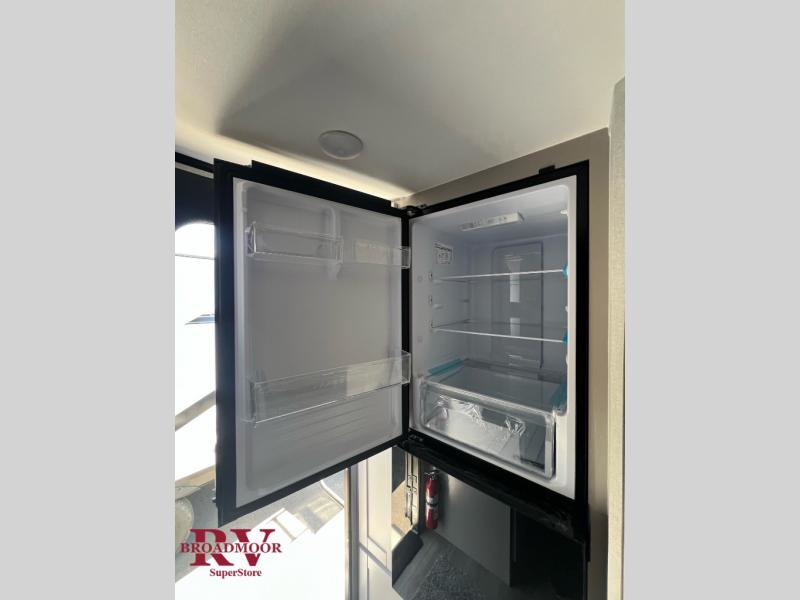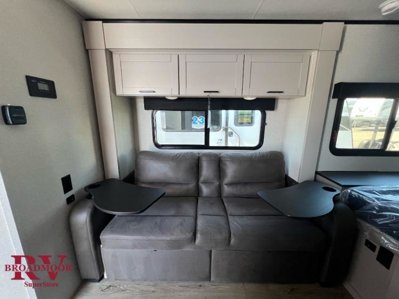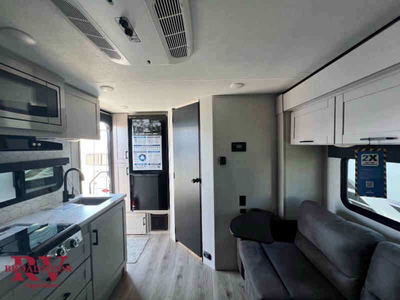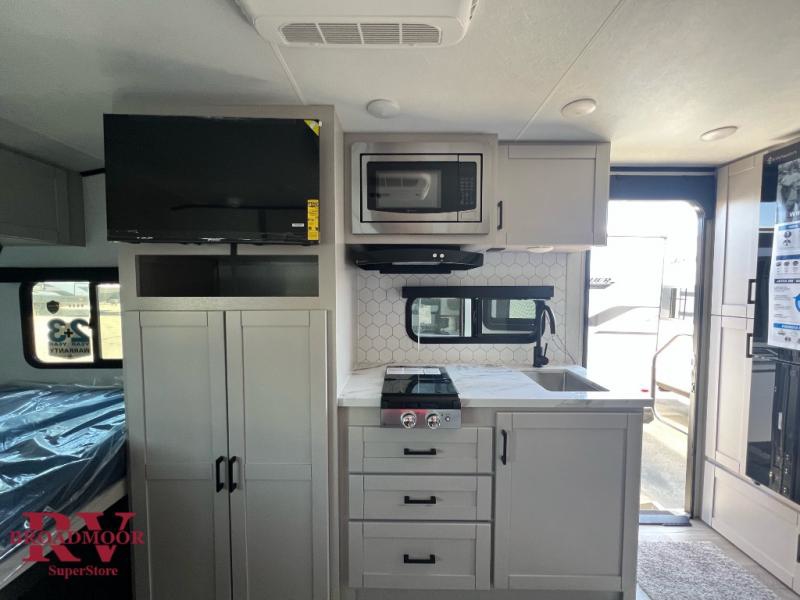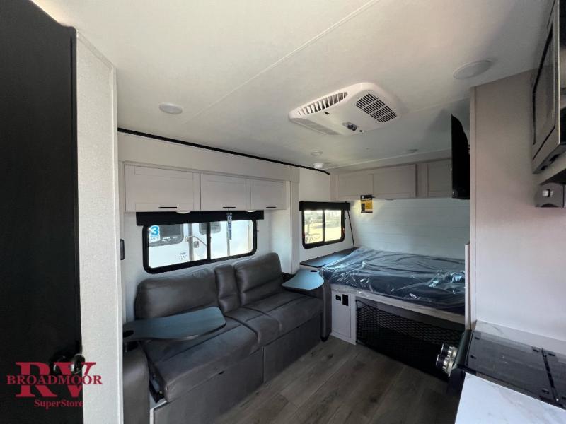 The perfect couple's trailer is found with this Jay Feather Air! You can sleep soundly each night on the front queen bed that includes a large overhead cabinet for books, board games and more. There is also a TV cabinet with a wardrobe below for even more storage. A Jack-knife sofa slide out includes table trays, giving you a place to dine together, and an overnight guest could sleep here if needed. Whip up your best meals on the two burner cooktop or in the microwave, and there is a refrigerator plus a pantry for food storage. The full bath includes a radius shower, a sink with a medicine cabinet, and a toilet with an overhead cabinet to keep all your toiletries tucked away.