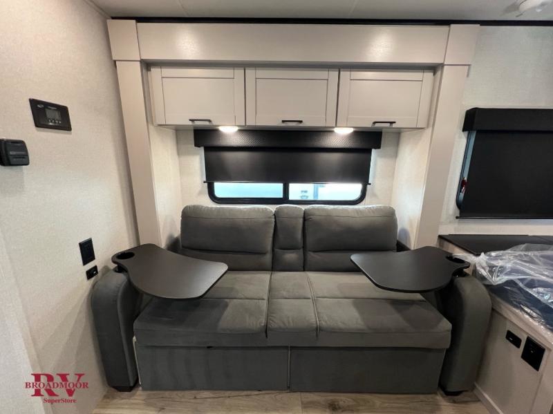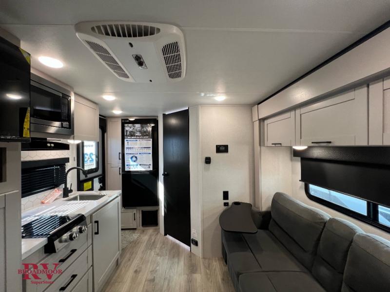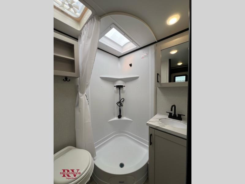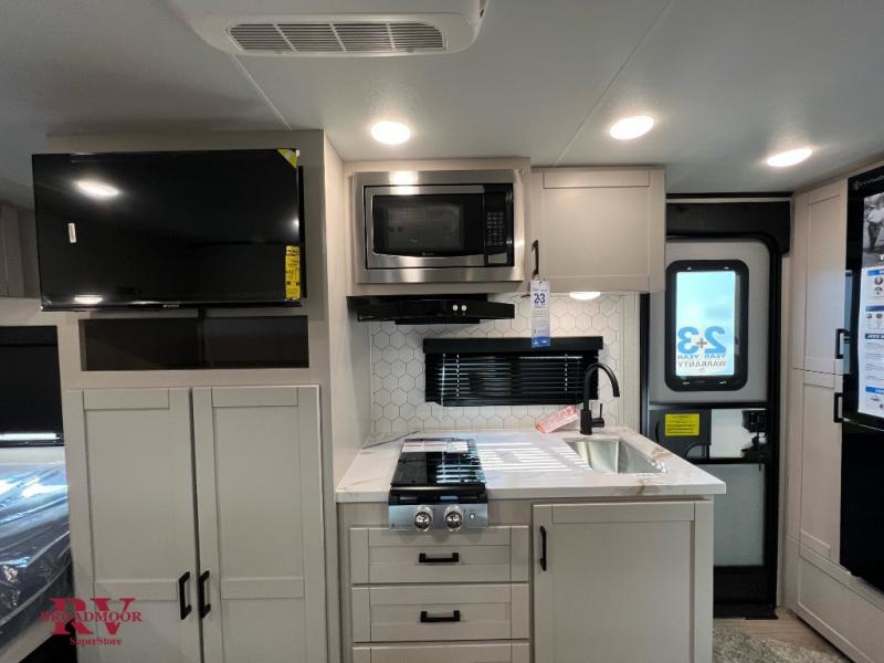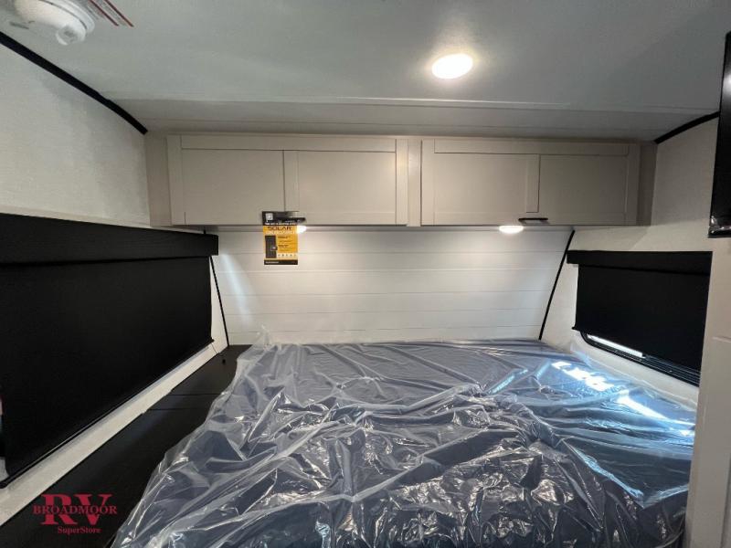 The perfect couple's trailer is found with this Jay Feather Air! You can sleep soundly each night on the front queen bed that includes a large overhead cabinet for books, board games and more. There is also a TV cabinet with a wardrobe below for even more storage. A Jack-knife sofa slide out includes table trays, giving you a place to dine together, and an overnight guest could sleep here if needed. Whip up your best meals on the two burner cooktop or in the microwave, and there is a refrigerator plus a pantry for food storage. The full bath includes a radius shower, a sink with a medicine cabinet, and a toilet with an overhead cabinet to keep all your toiletries tucked away.