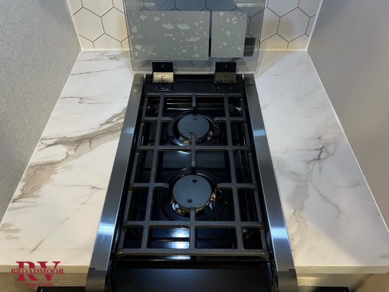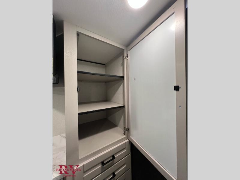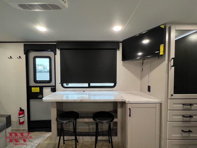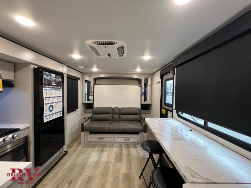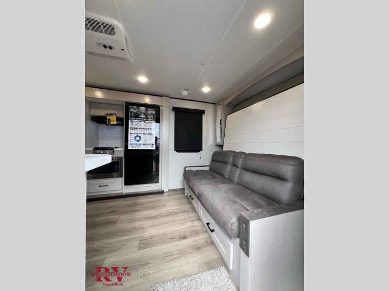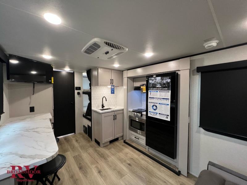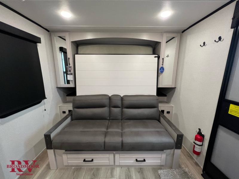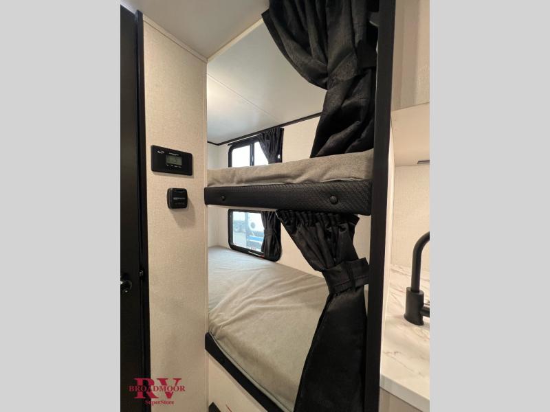 Light on weight doesn't mean light on features, and this Jay Feather Air proves that! You will appreciate the added space thanks to the kitchen slide out that houses the 11 cu. ft. 12V refrigerator and two burner cooktop. Your crew can enjoy meals together at the dining bar with a hinged top and two stools, or you can take your plate outdoors to sit under the 15' power awning with LED lights. The front Murphy bed can be folded away during the day so you can relax on the sofa, and your guests can make their bunk beds before heading out for the day. This model also includes ample storage space, including a pantry/wardrobe, overhead cabinets, dual bedside wardrobes, and outside storage!