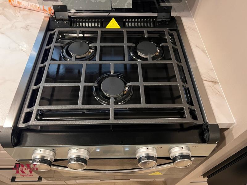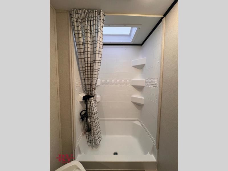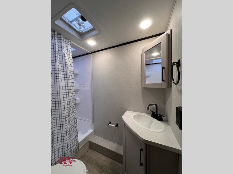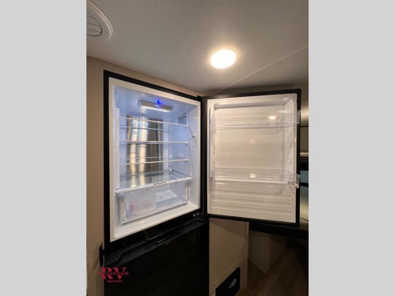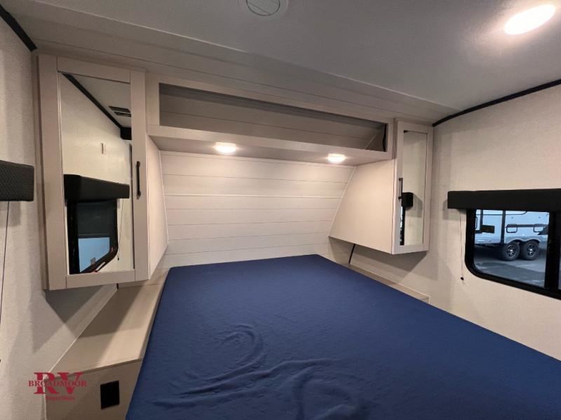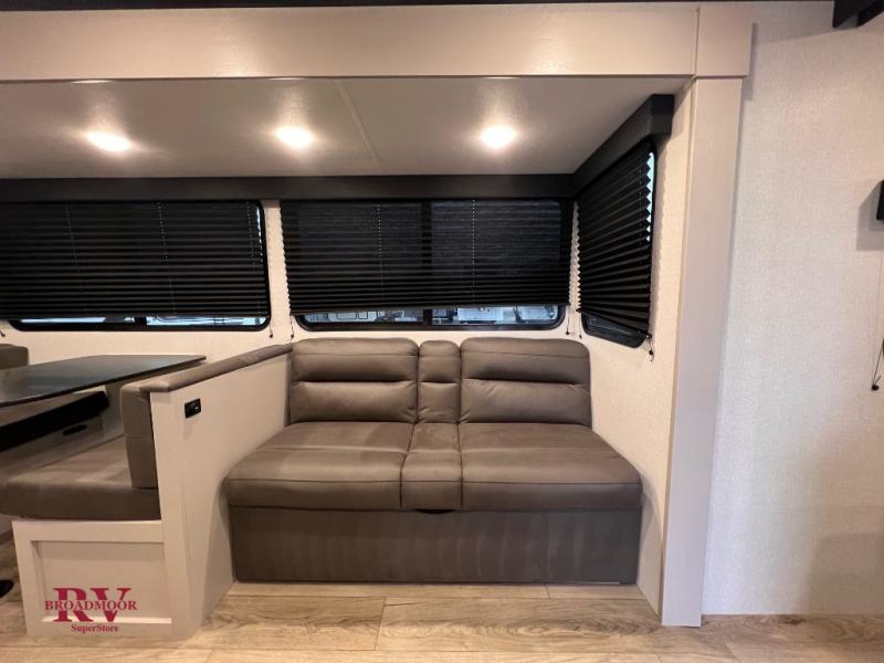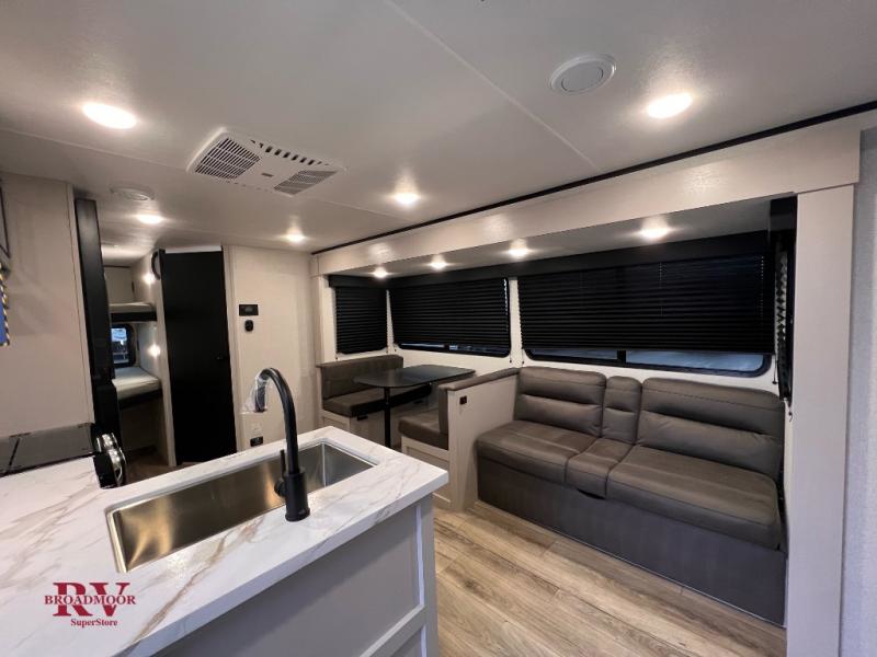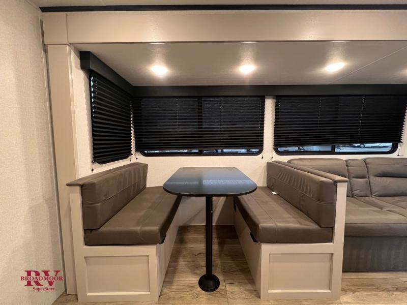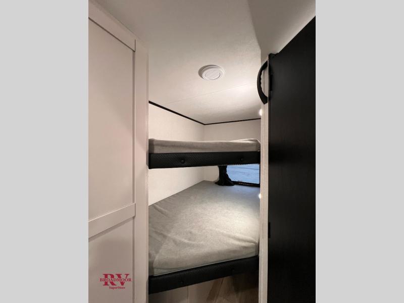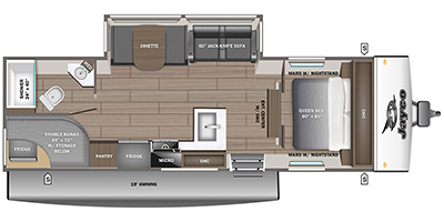 Camping with a larger group just got easier in this spacious travel trailer for eight! You'll have the front bedroom to yourselves which includes a walk-around queen bed with dual wardrobes and nightstands to keep your things tidy. The double-size bunks with storage below will be perfect for your guests or little ones, and the full bath adjacent to the bunks will let everyone freshen up each day. A booth dinette and jack-knife sofa within the large slide out provides a place to dine, play games, and convert to more sleeping space. And the chef of your group will find a full kitchen, complete with microwave oven, cooktop, pantry and 11 cu. ft. 12V refrigerator!