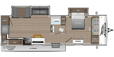 Experience the ultimate in RV living with our luxurious travel trailer, featuring a spacious rear kitchen perfect for meal prep. The pantry and fridge provide ample grocery storage, and the overhead cabinets add extra space for cookware and dishes. Plus, the microwave makes cooking and reheating meals a breeze, and the dinette is a great spot to enjoy meals or play games with family and friends. In the nice living room, you will find a trifold sofa, a perfect place to relax and unwind, and an entertainment center with a fireplace adding warmth and ambiance to the space. The full bathroom is beautifully appointed and provides all the essentials for a comfortable stay. Furthermore, the front bedroom is a serene retreat, featuring a spacious queen bed, dresser, wardrobe, and nightstands beside the bed for ultimate convenience. This travel trailer also features washer and dryer prep, making it easy to hook up to laundry facilities on the go, and with an outside kitchen, you can cook up a storm while enjoying the fresh air and scenery.