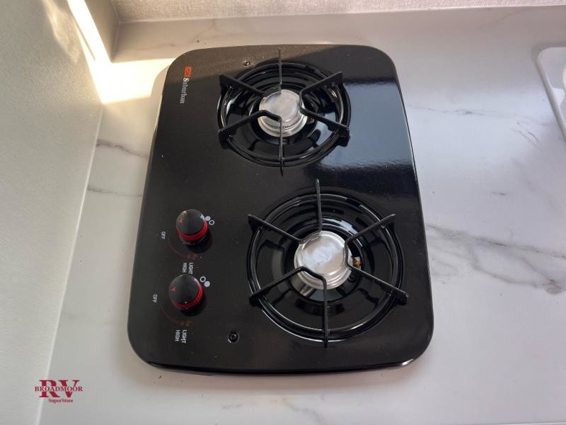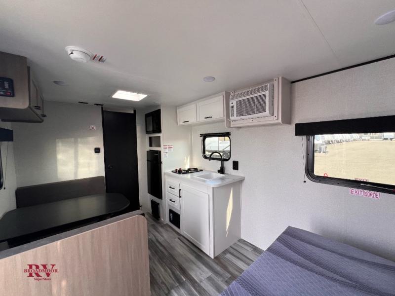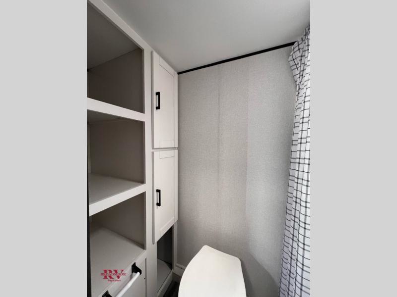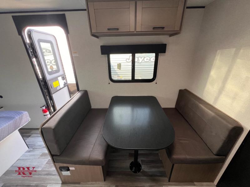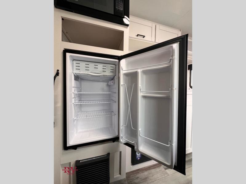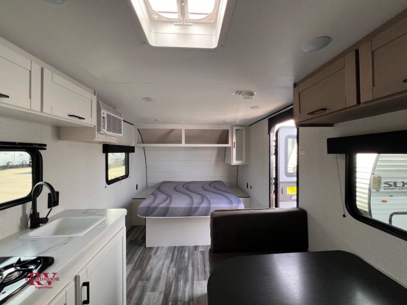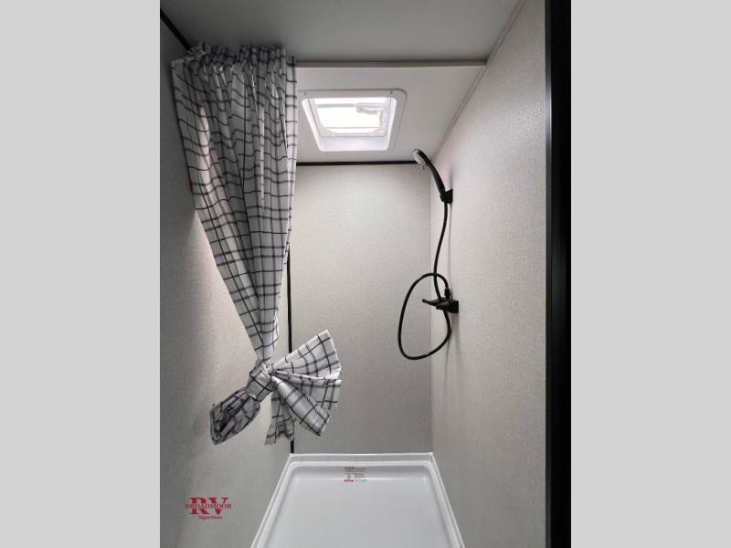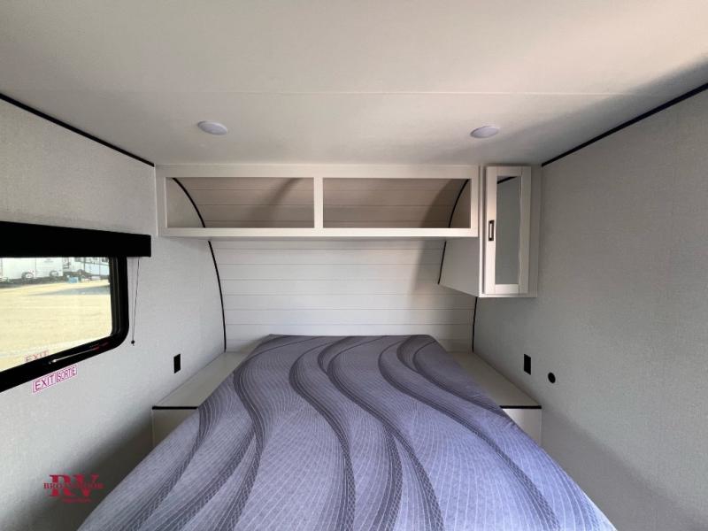 This travel trailer includes everything you need for fun trips at the lake. When you arrive at the campground, you can unload the exterior storage, then put out the 10' power awning. The booth dinette inside will provide a place to dine together, and the full rear bath with a shower will make it easier than ever to clean up after a day of hiking. A front RV queen bed will provide a great night's rest, and the overhead shelf will be perfect for books or personal belongings.