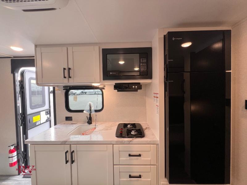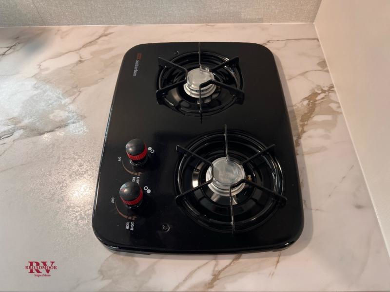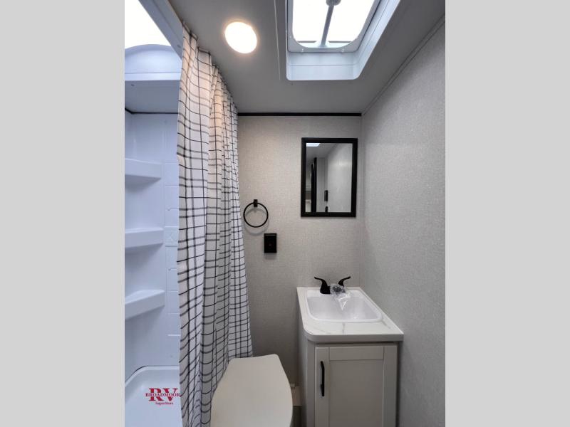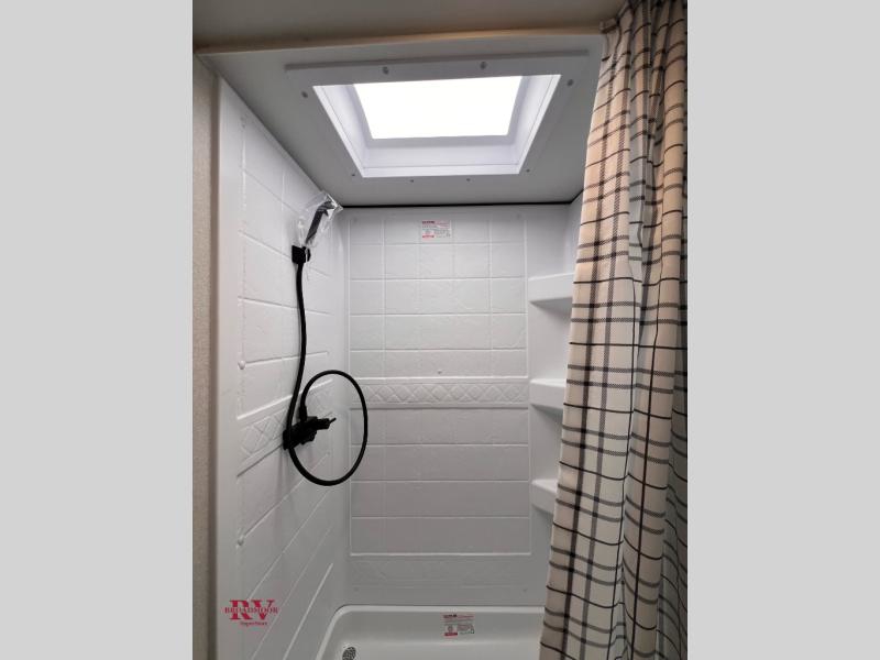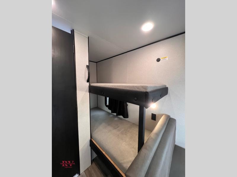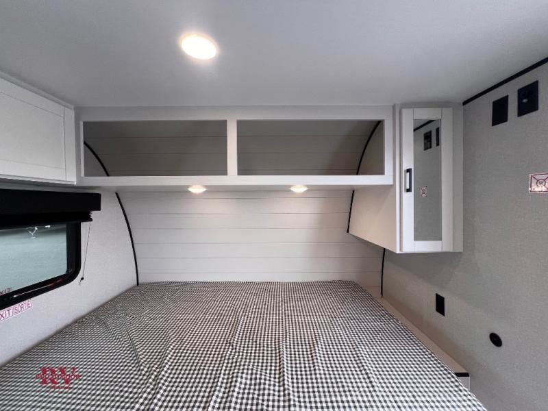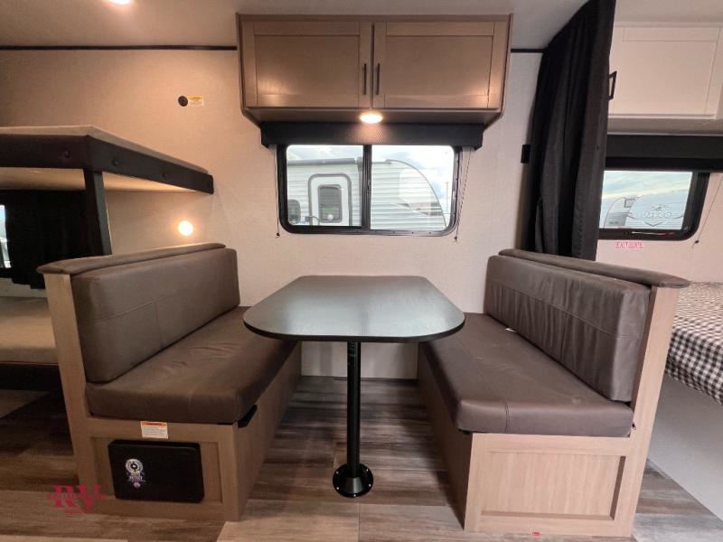 Your crew of five will love camping in this single-axle travel trailer! There are bunk beds in the rear corner and a full bath in the other rear corner for easy nighttime use. You will have the front queen bed to yourselves, along with a privacy curtain, overhead shelf, and a nightstand/wardrobe for your clothes. The booth dinette provides a place to dine, play games, and even let an extra guest stay over.