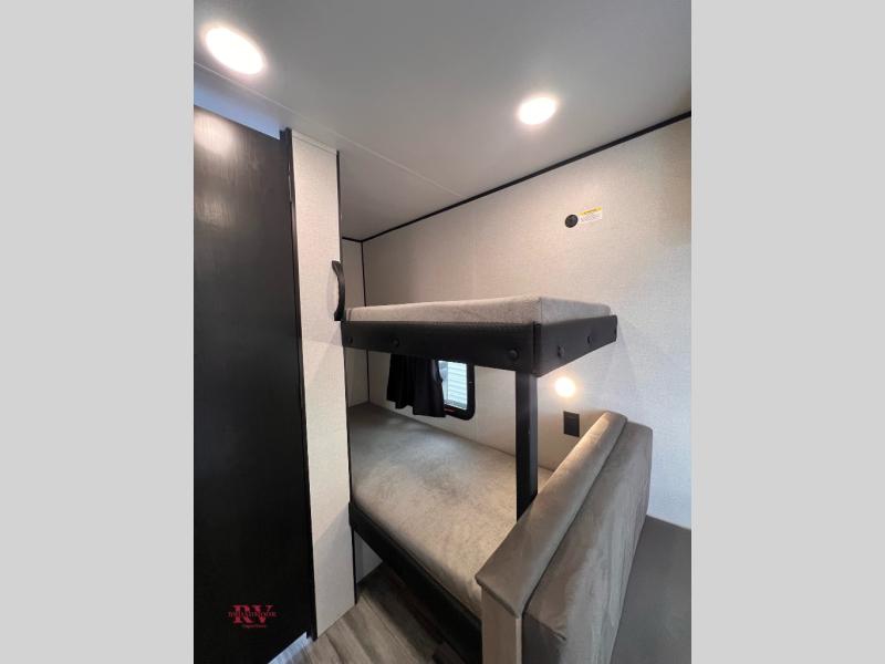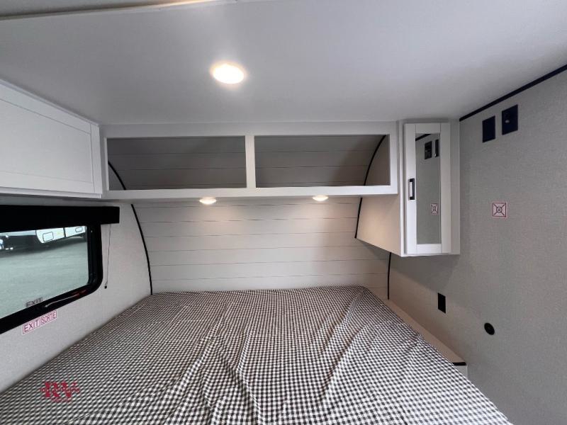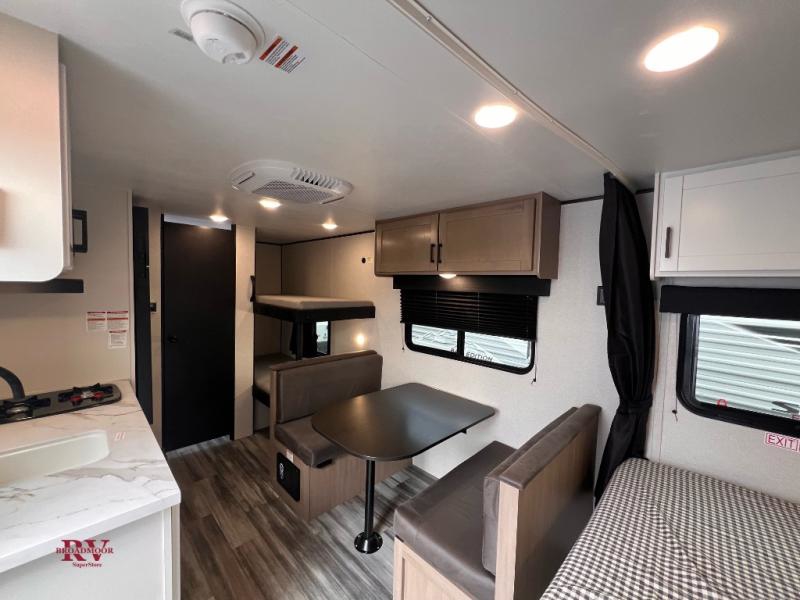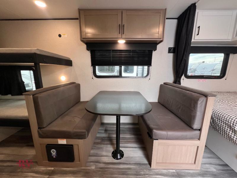 Your crew of five will love camping in this single-axle travel trailer! There are bunk beds in the rear corner and a full bath in the other rear corner for easy nighttime use. You will have the front queen bed to yourselves, along with a privacy curtain, overhead shelf, and a nightstand/wardrobe for your clothes. The booth dinette provides a place to dine, play games, and even let an extra guest stay over.