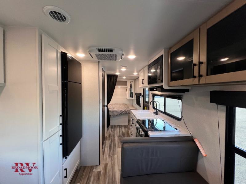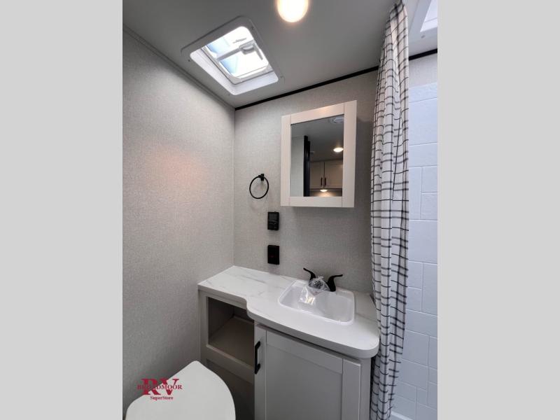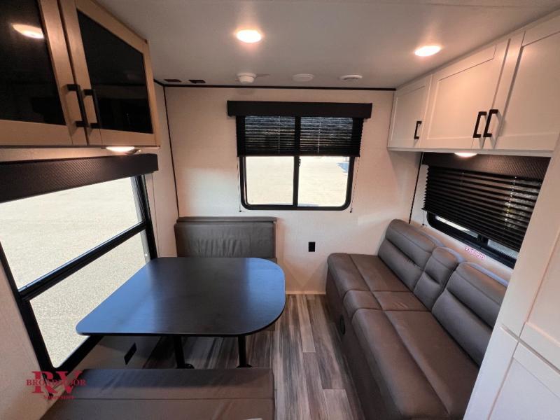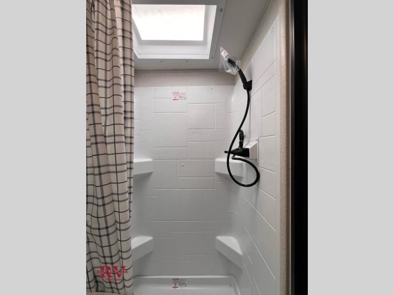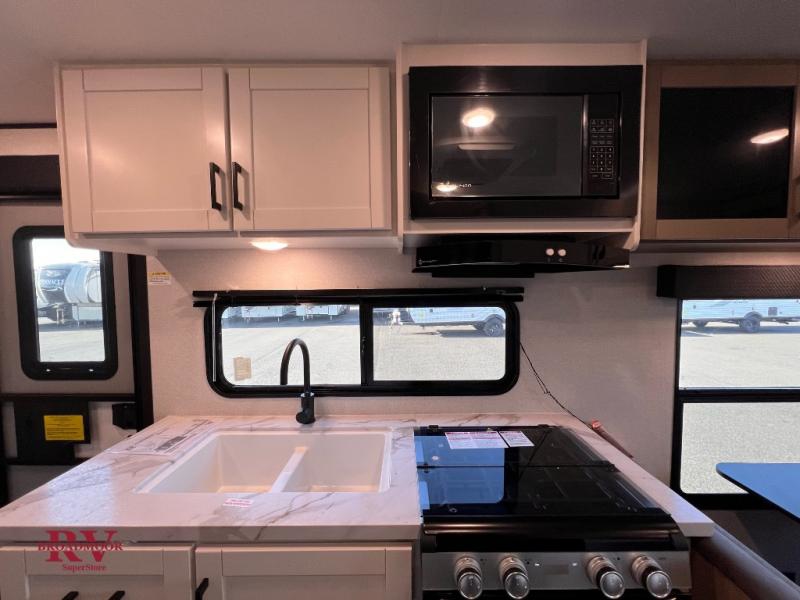 Camping in the woods is just what the doctor ordered and this trailer will provide all the interior comforts you need! There is a three burner cooktop and a microwave oven to prepare meals each day, plus an 8 cu. ft. 12V refrigerator for cold items. After your meal is made, you can dine at the booth dinette or relax on the jack-knife sofa, and these areas can become sleeping space for two to three guests at night. The full bath with a shower means you won't have to use the camp's facilities and the 16' power awning will provide protection from the sun as you visit with other campers!