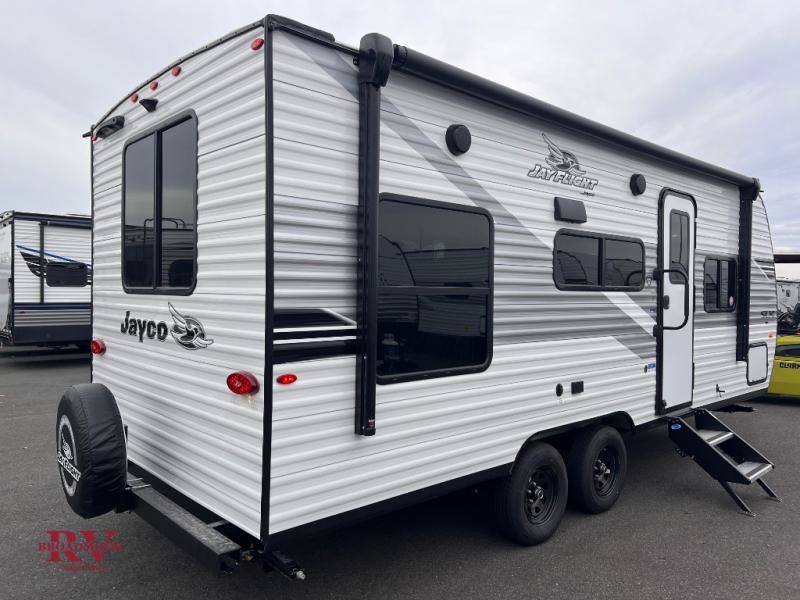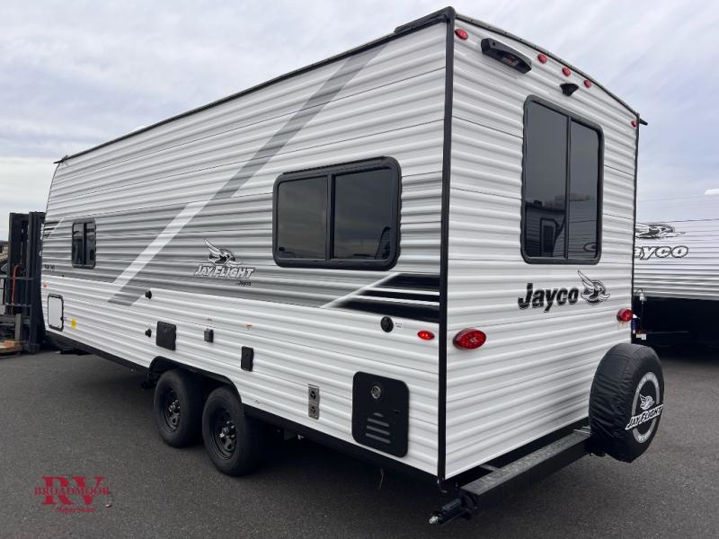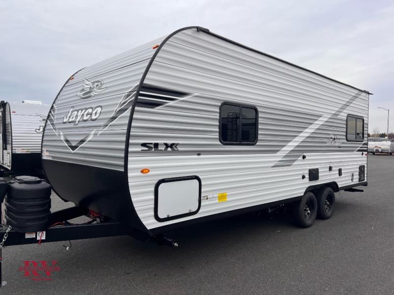 The Jayco Jay Flight SLX travel trailer is quite easy to own because it is lightweight for an easier towing experience. Built on a fully integrated A-frame with galvanized-steel, impact-resistant wheel wells, the Jay Flight SLX has quality at its very foundation. That quality continues on to the electric self-adjusting brakes, easy-lube hubs, Magnum Truss roof system, and LP quick connect. Some of what the mandatory Customer Value Package includes is backup camera prep, Keyed-Alike entry and baggage doors, and an on-demand tankless water heater