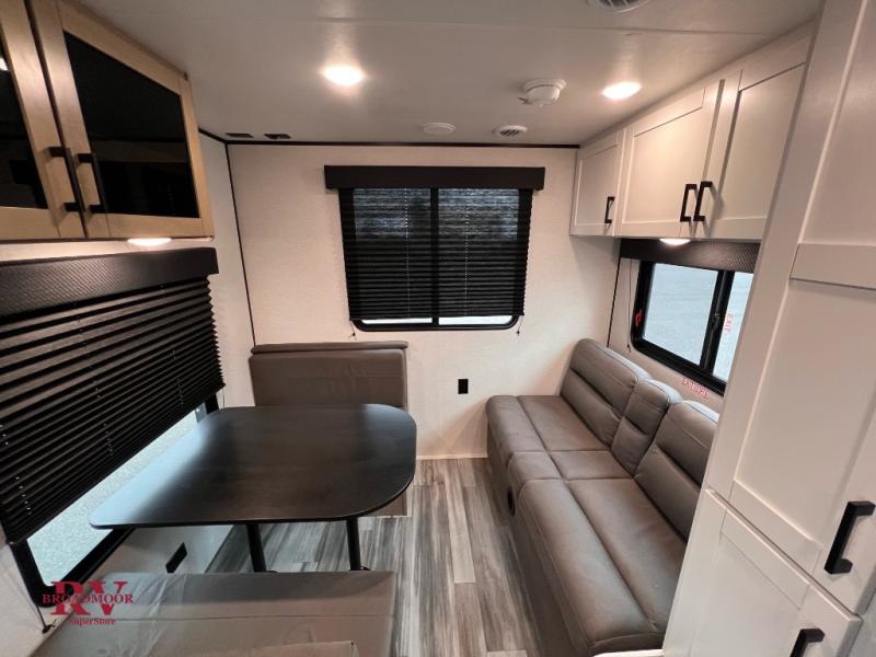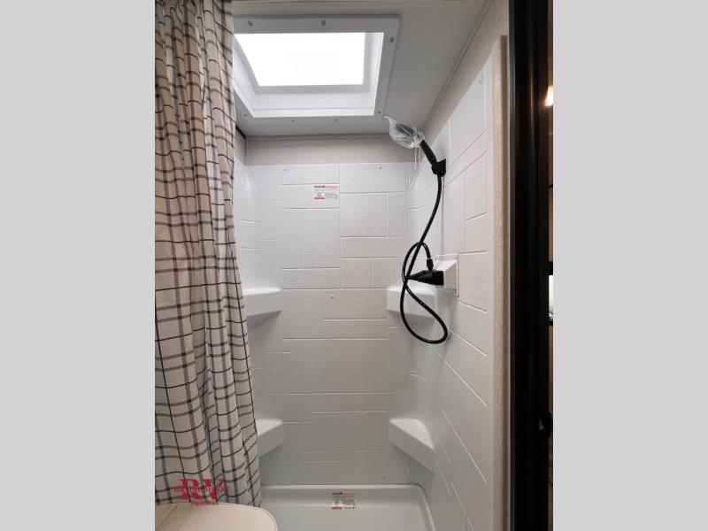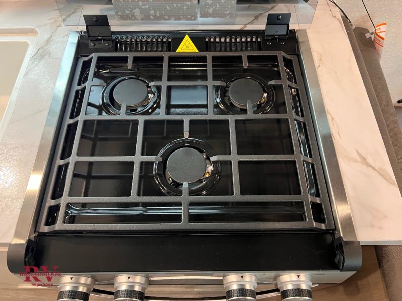 Camping in the woods is just what the doctor ordered and this trailer will provide all the interior comforts you need! There is a three burner cooktop and a microwave oven to prepare meals each day, plus an 8 cu. ft. 12V refrigerator for cold items. After your meal is made, you can dine at the booth dinette or relax on the jack-knife sofa, and these areas can become sleeping space for two to three guests at night. The full bath with a shower means you won't have to use the camp's facilities and the 16' power awning will provide protection from the sun as you visit with other campers!
