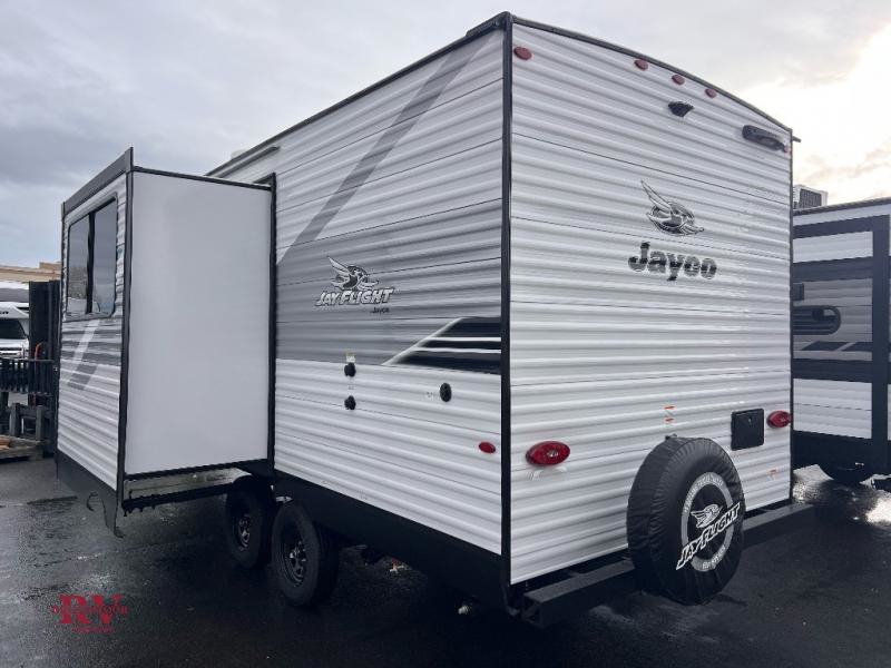 The Jayco Jay Flight SLX travel trailer is quite easy to own because it is lightweight for an easier towing experience. Built on a fully integrated A-frame with galvanized-steel, impact-resistant wheel wells, the Jay Flight SLX has quality at its very foundation. That quality continues on to the electric self-adjusting brakes, easy-lube hubs, Magnum Truss roof system, and LP quick connect. Some of what the mandatory Customer Value Package includes is backup camera prep, Keyed-Alike entry and baggage doors, and an on-demand tankless water heater