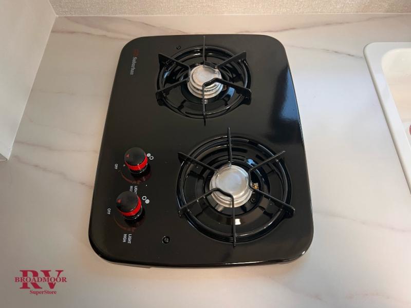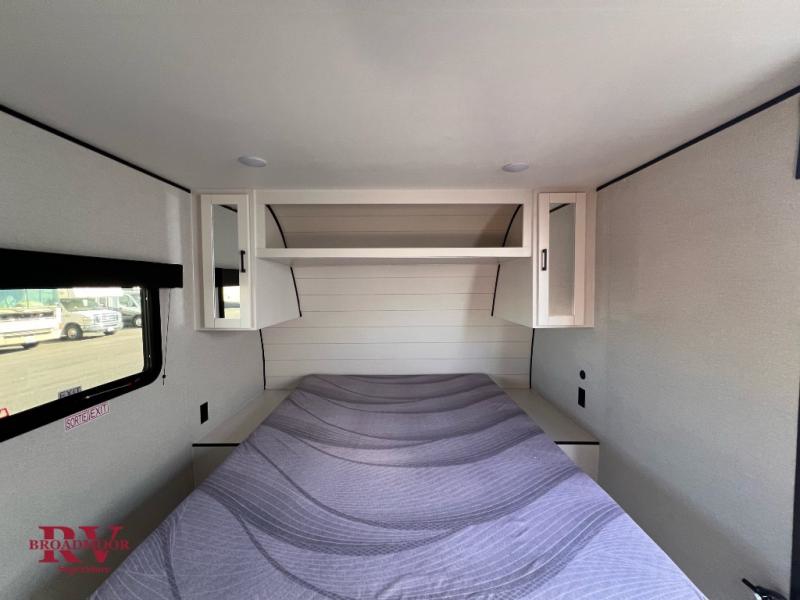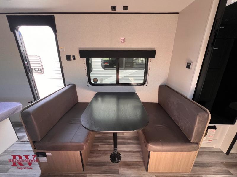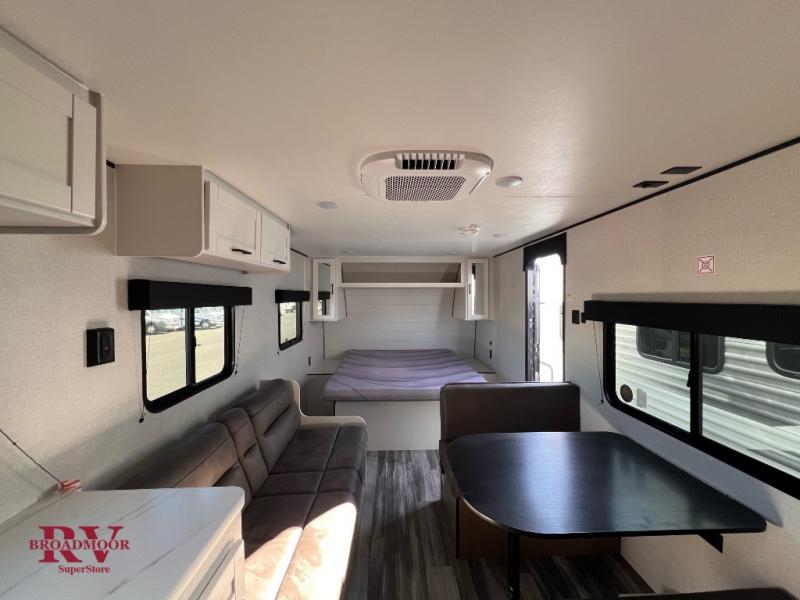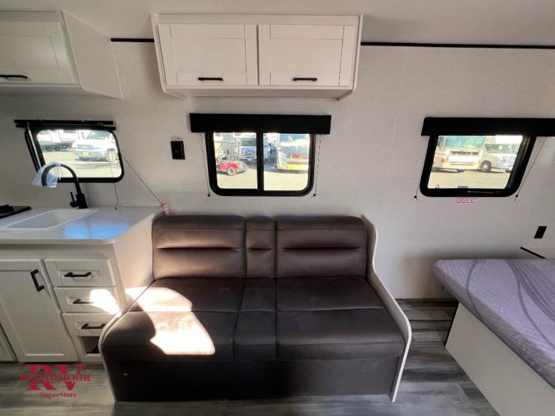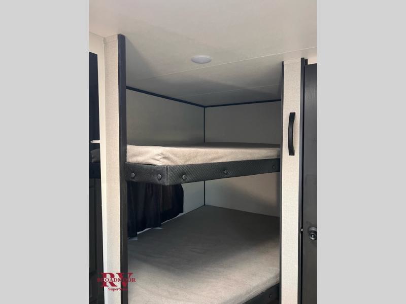 You can comfortably sleep eight to ten people in this trailer thanks to the double-size bunks, the 60" x 80" queen bed in the front bedroom, plus the booth dinette and jack-knife sofa in the main living area! The chef of your crew will have a two burner cooktop and microwave oven to prepare meals, and everyone can store their favorite drinks in the 12V refrigerator. The bathroom includes a 40" shower and a toilet, with the sink just outside of this room so others can brush their teeth if one is taking a shower before bed. The outside storage will let you bring along fishing poles and the 12' power awning will create a nice place to gather in the evenings!