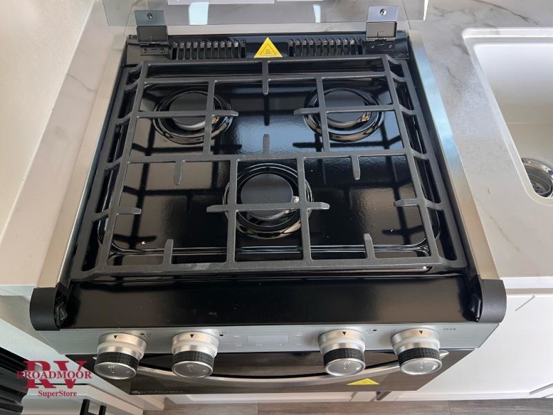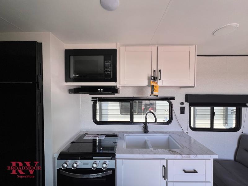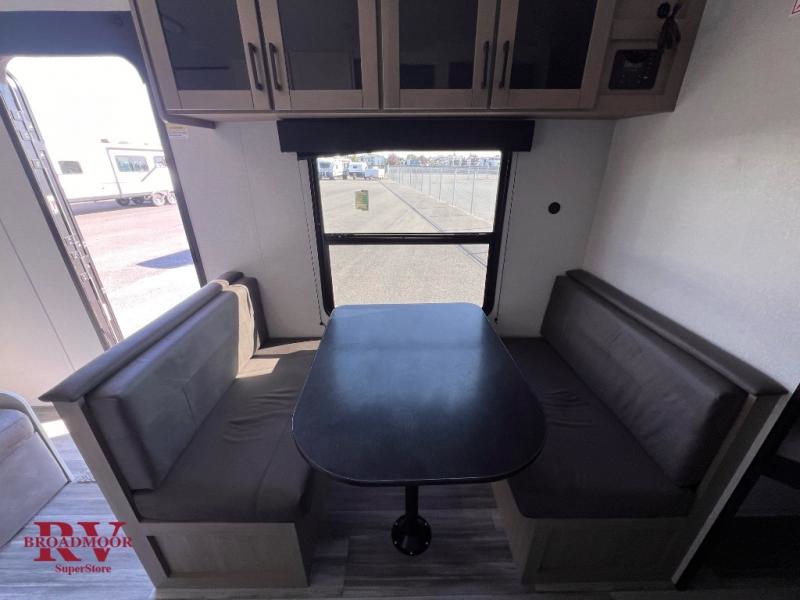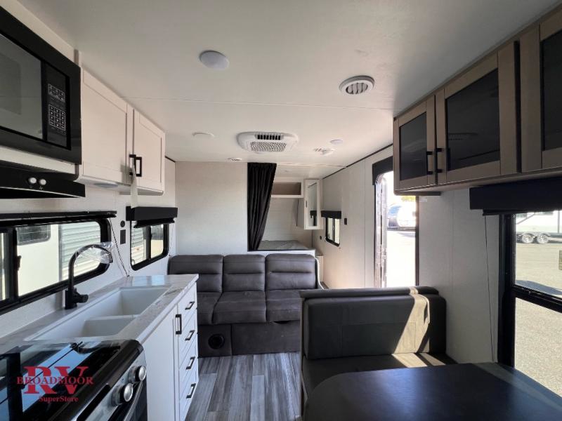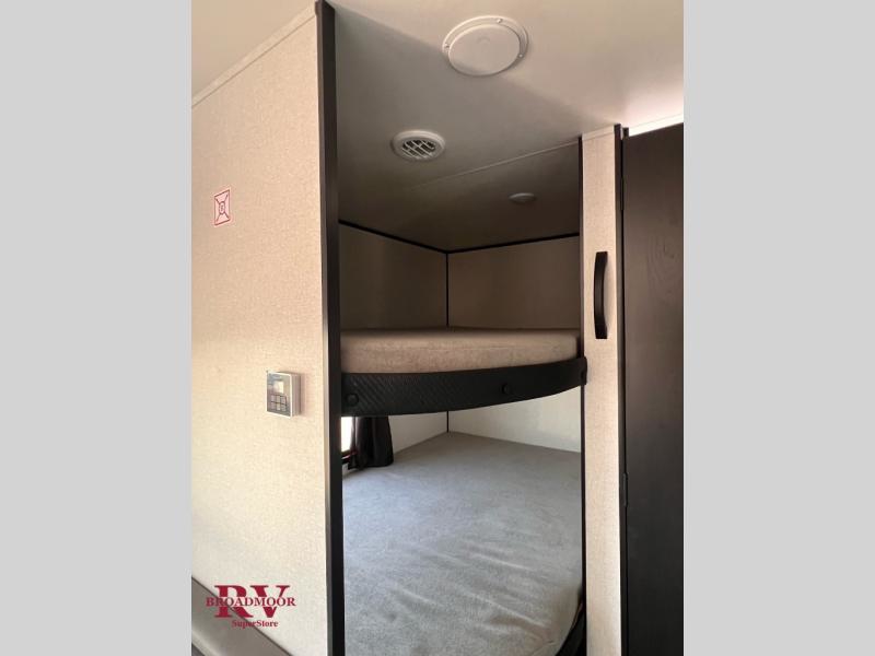 You can comfortably sleep up to eight people in this trailer thanks to the double-size bunks, the RV queen bed in the front bedroom, plus the booth dinette and jack-knife sofa in the main living area! The chef of your crew will have a three burner cooktop and microwave oven to prepare meals, and everyone can store their favorite drinks in the 8 cu. ft. 12V refrigerator. The bathroom includes a shower and a toilet, with the sink just outside of this room so others can brush their teeth if one is taking a shower before bed. The outside storage will let you bring along fishing poles and the 16' power awning with LED lights will create a nice place to gather in the evenings!