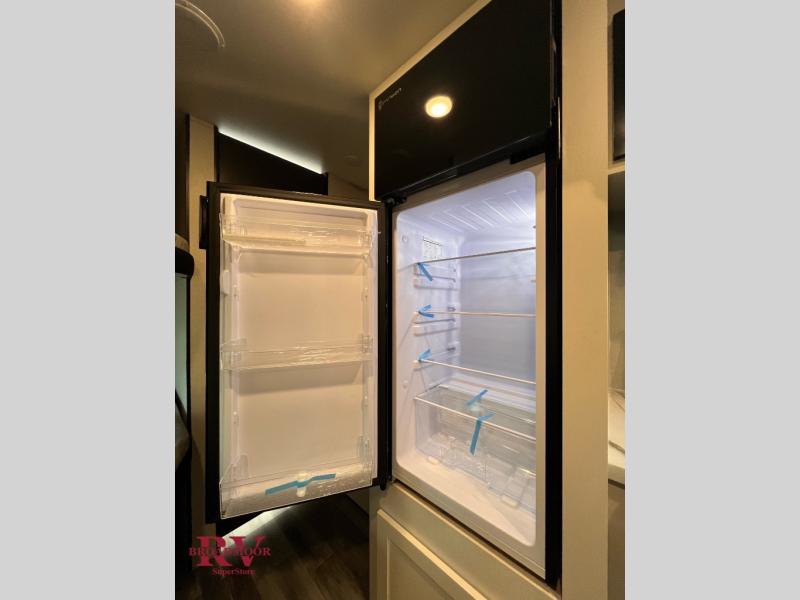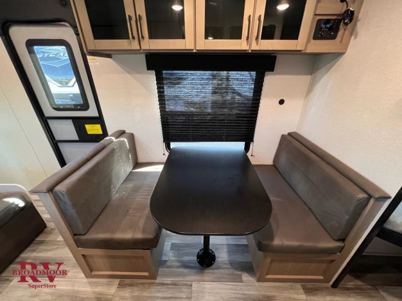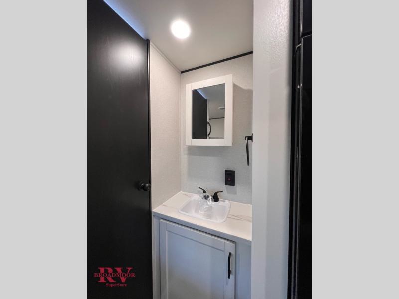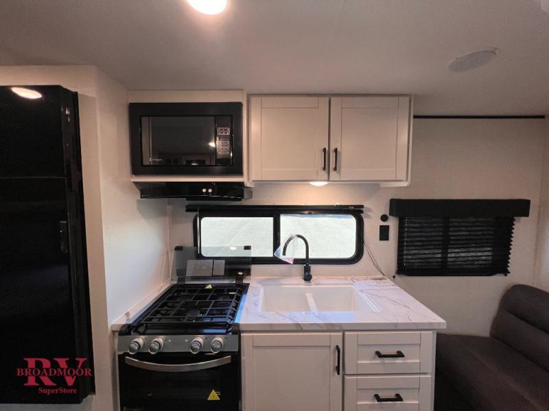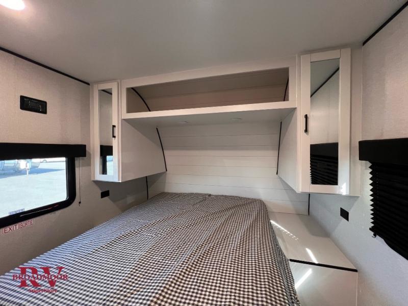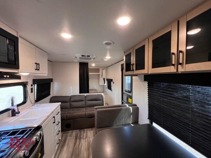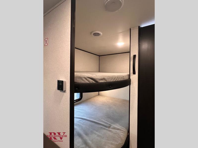 You can comfortably sleep up to eight people in this trailer thanks to the double-size bunks, the RV queen bed in the front bedroom, plus the booth dinette and jack-knife sofa in the main living area! The chef of your crew will have a three burner cooktop and microwave oven to prepare meals, and everyone can store their favorite drinks in the 8 cu. ft. 12V refrigerator. The bathroom includes a shower and a toilet, with the sink just outside of this room so others can brush their teeth if one is taking a shower before bed. The outside storage will let you bring along fishing poles and the 16' power awning with LED lights will create a nice place to gather in the evenings!