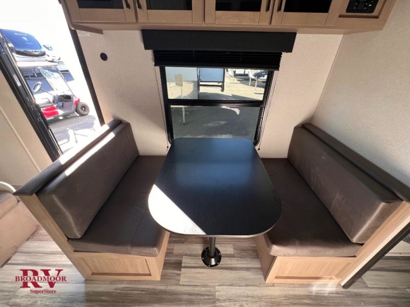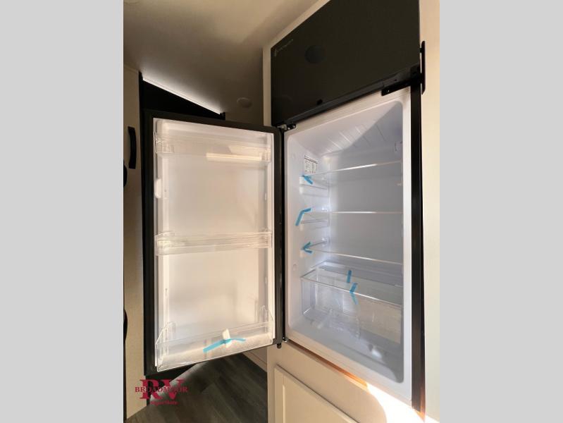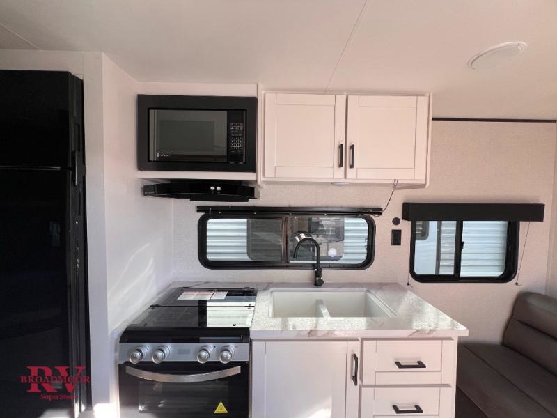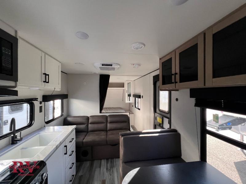 You can comfortably sleep up to eight people in this trailer thanks to the double-size bunks, the RV queen bed in the front bedroom, plus the booth dinette and jack-knife sofa in the main living area! The chef of your crew will have a three burner cooktop and microwave oven to prepare meals, and everyone can store their favorite drinks in the 8 cu. ft. 12V refrigerator. The bathroom includes a shower and a toilet, with the sink just outside of this room so others can brush their teeth if one is taking a shower before bed. The outside storage will let you bring along fishing poles and the 16' power awning with LED lights will create a nice place to gather in the evenings!