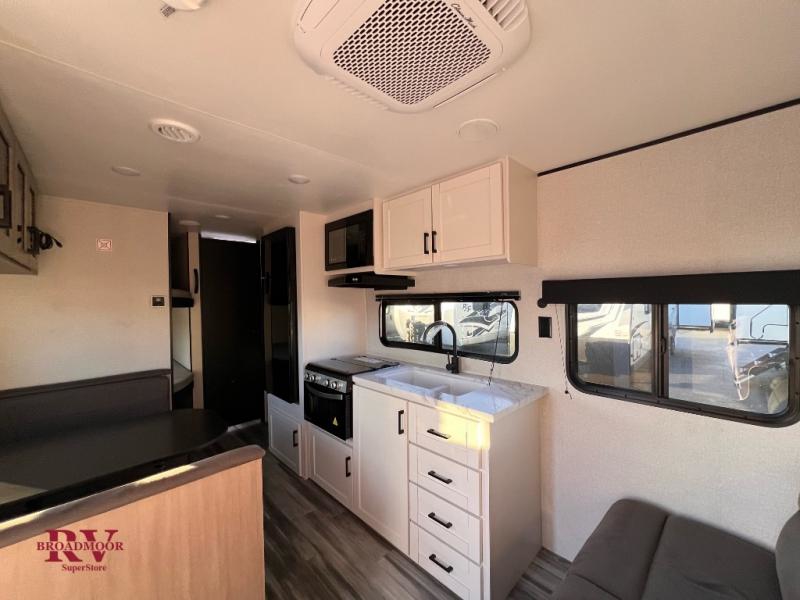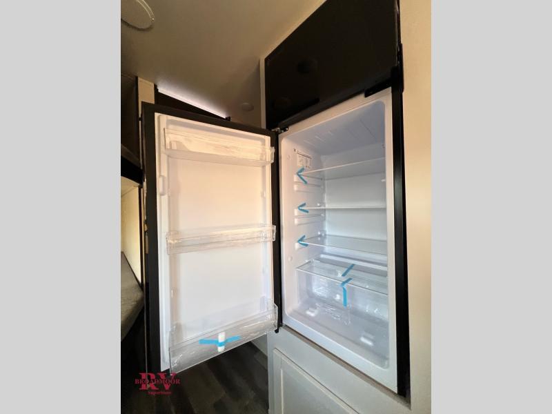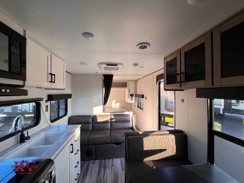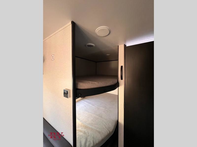 You can comfortably sleep up to eight people in this trailer thanks to the double-size bunks, the RV queen bed in the front bedroom, plus the booth dinette and jack-knife sofa in the main living area! The chef of your crew will have a three burner cooktop and microwave oven to prepare meals, and everyone can store their favorite drinks in the 8 cu. ft. 12V refrigerator. The bathroom includes a shower and a toilet, with the sink just outside of this room so others can brush their teeth if one is taking a shower before bed. The outside storage will let you bring along fishing poles and the 16' power awning with LED lights will create a nice place to gather in the evenings!