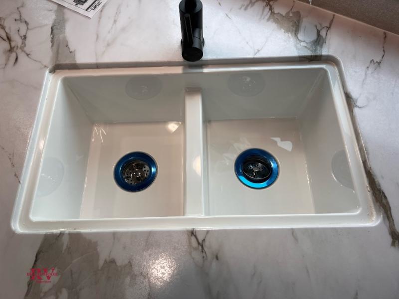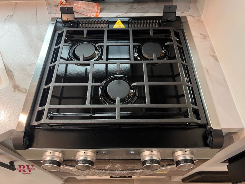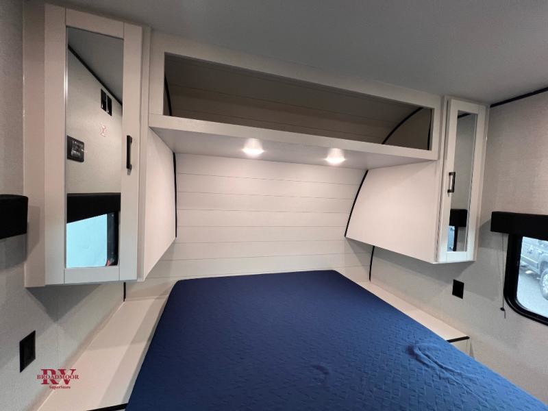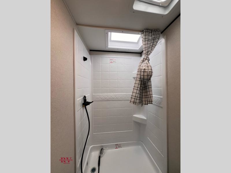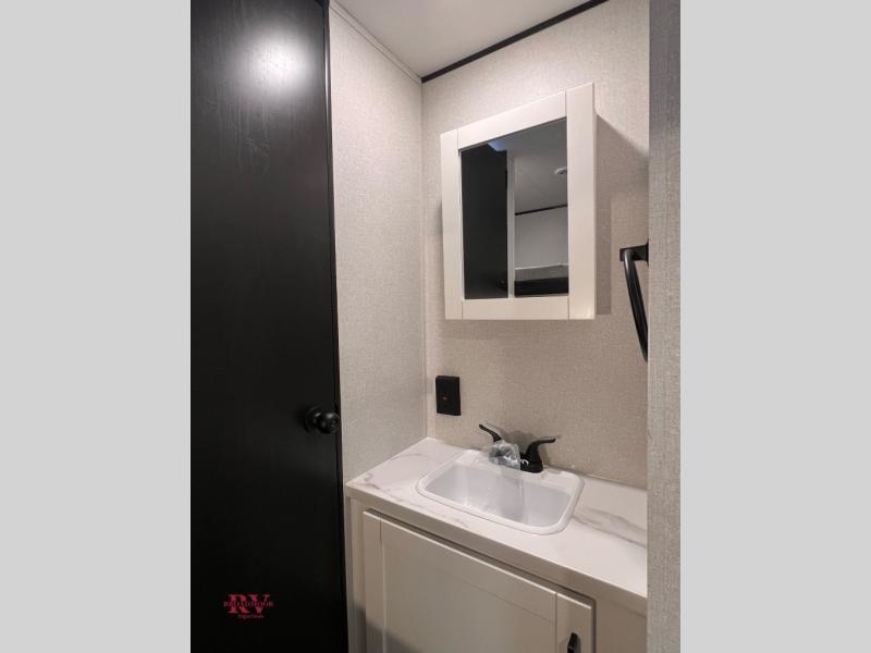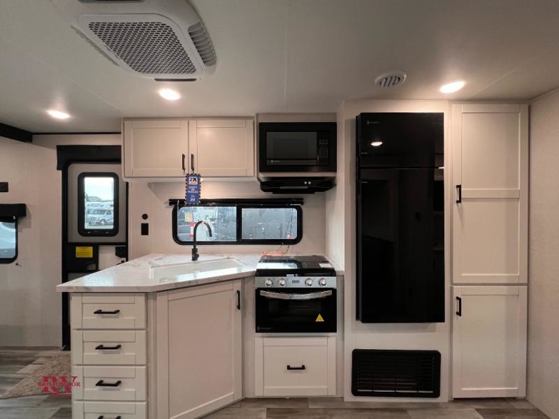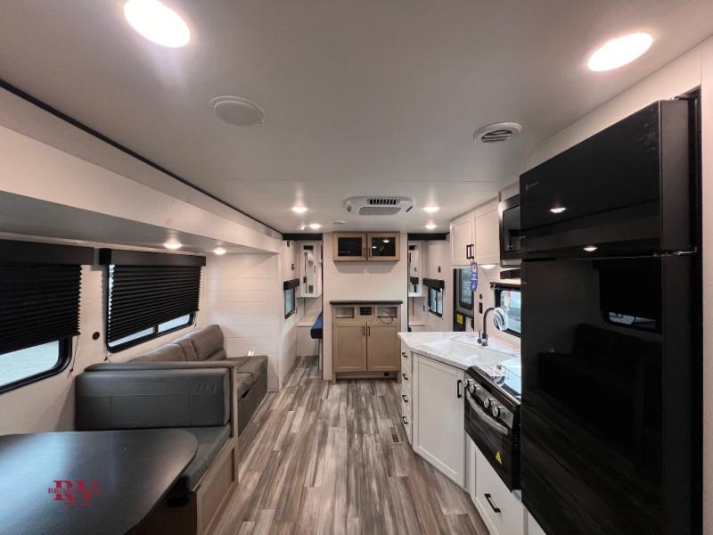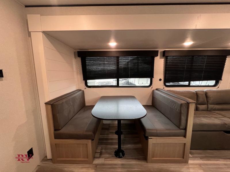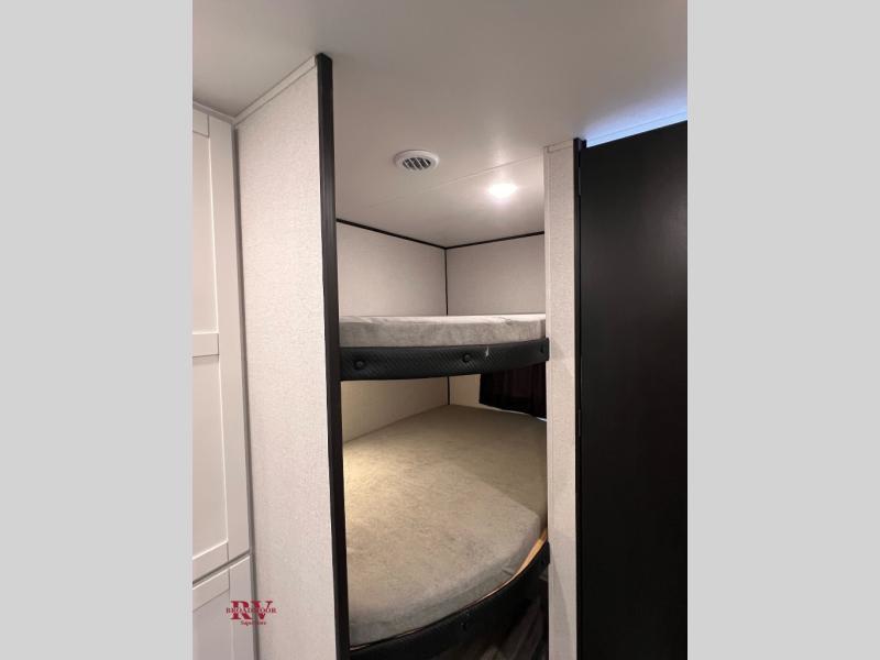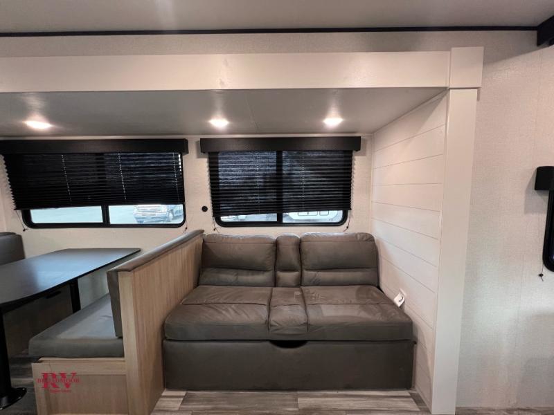 You can comfortably sleep up to ten people in this trailer thanks to the double-size bunks, the RV queen bed in the front bedroom, plus the booth dinette and jack-knife sofa in the main living area! The chef of your crew will have a three burner cooktop and microwave oven to prepare meals, and everyone can store their favorite drinks in the 8 cu. ft. 12V refrigerator inside, or in the outdoor refrigerator for convenience. The rear corner bathroom includes a shower and a toilet, with the sink just outside of this room so others can brush their teeth if one is taking a shower before bed. The outside storage is accessible on both sides of the unit and will easily allow you bring along camp chairs, yard games and more.  A 16' powered awning with LED lights will create a nice place to gather in the evenings with family and friends!