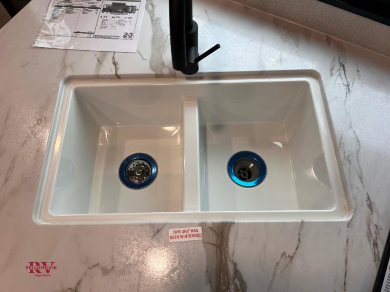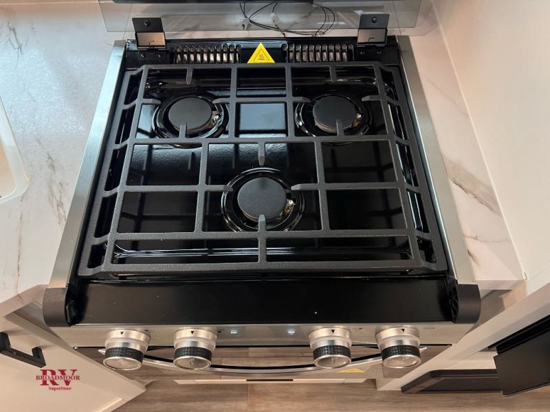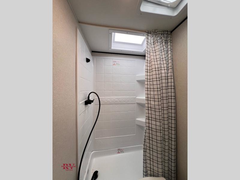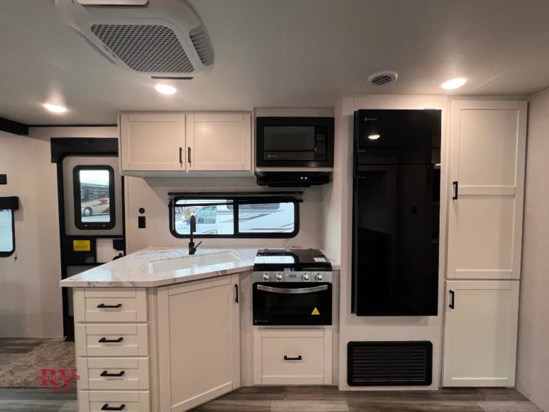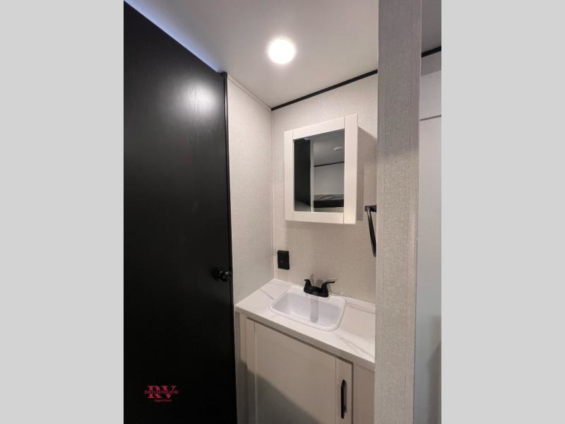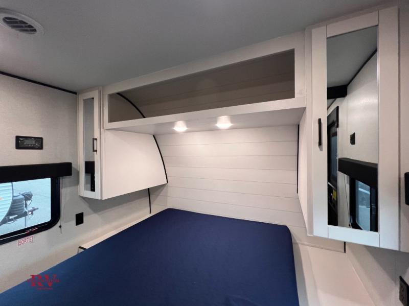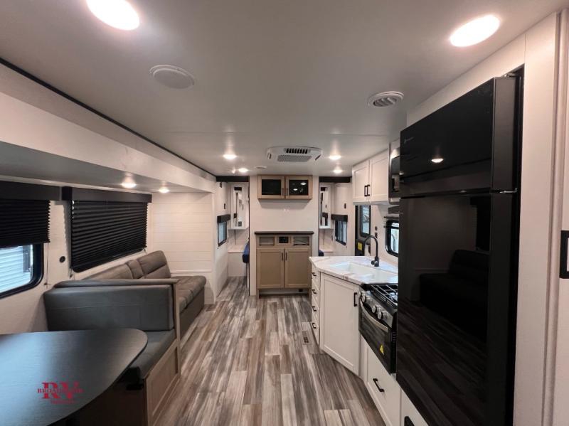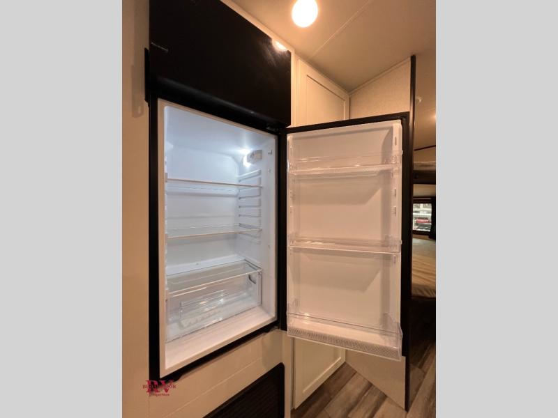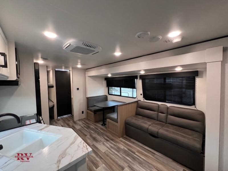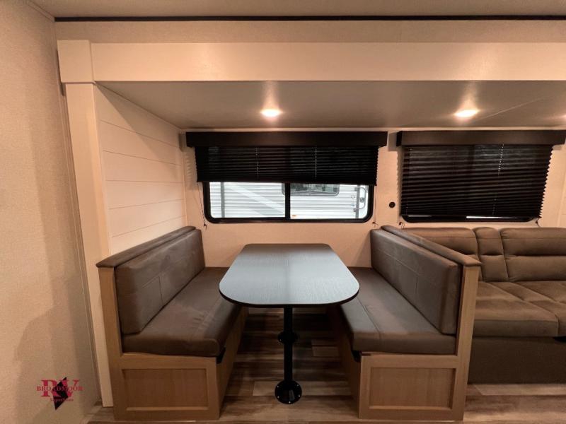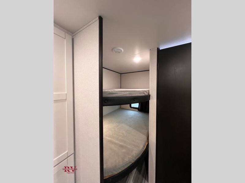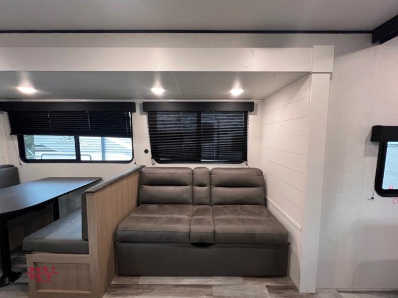 You can comfortably sleep up to ten people in this trailer thanks to the double-size bunks, the RV queen bed in the front bedroom, plus the booth dinette and jack-knife sofa in the main living area! The chef of your crew will have a three burner cooktop and microwave oven to prepare meals, and everyone can store their favorite drinks in the 8 cu. ft. 12V refrigerator inside, or in the outdoor refrigerator for convenience. The rear corner bathroom includes a shower and a toilet, with the sink just outside of this room so others can brush their teeth if one is taking a shower before bed. The outside storage is accessible on both sides of the unit and will easily allow you bring along camp chairs, yard games and more.  A 16' powered awning with LED lights will create a nice place to gather in the evenings with family and friends!