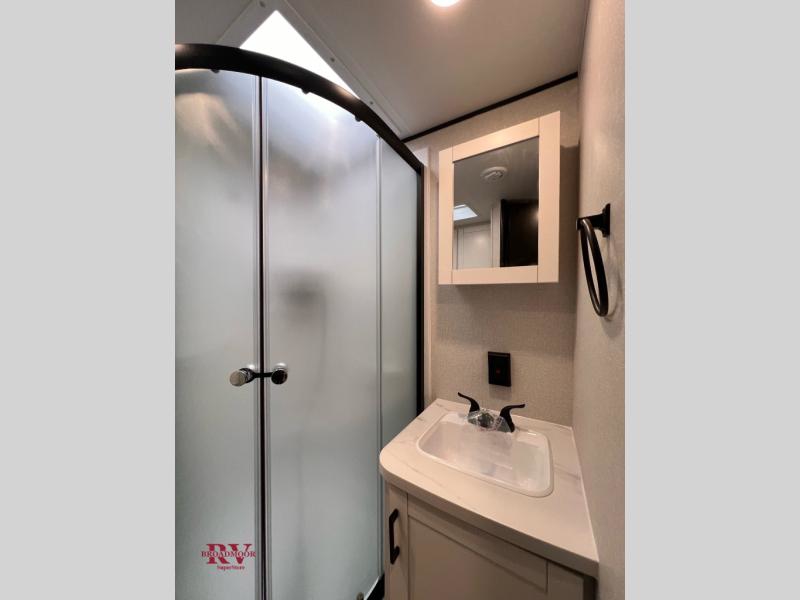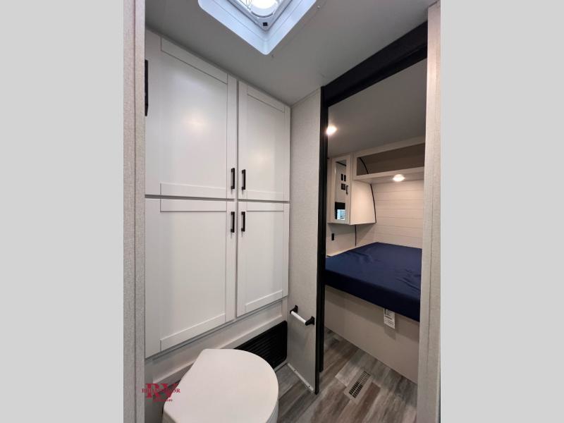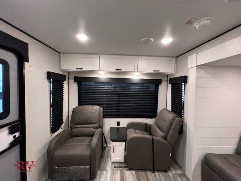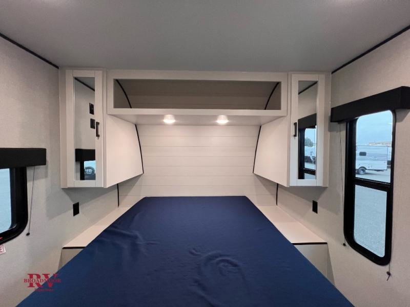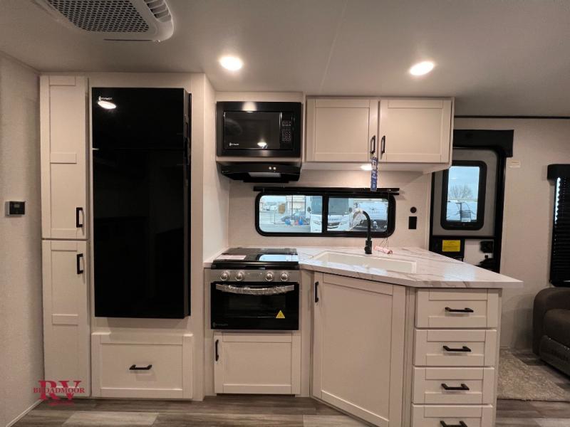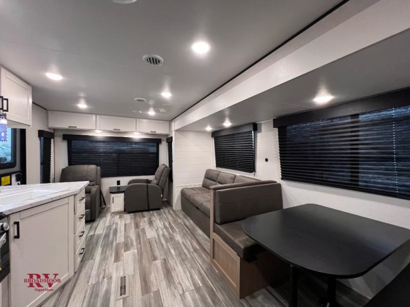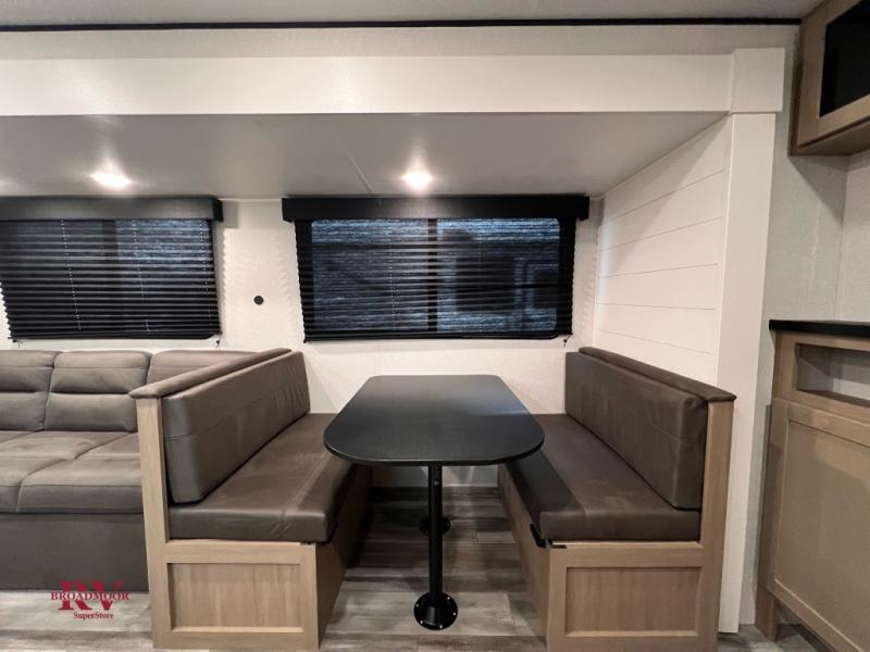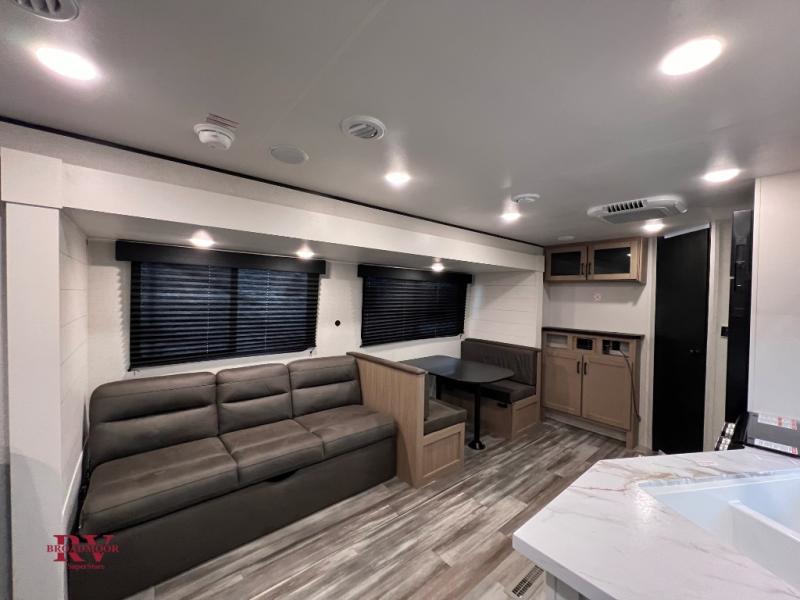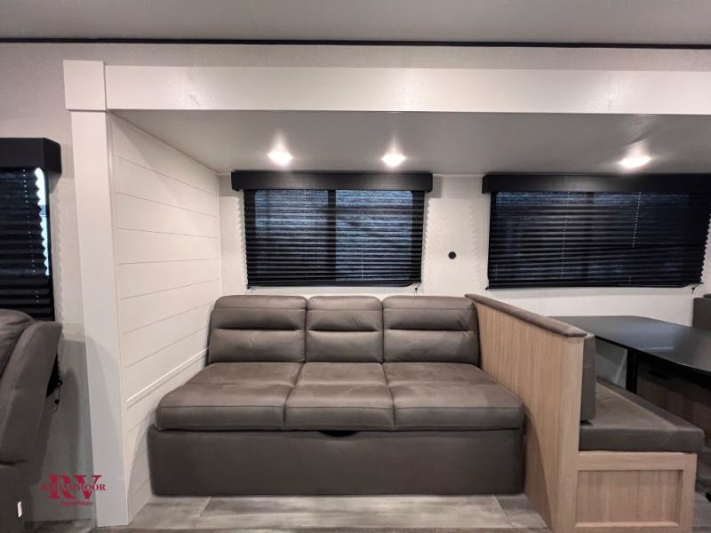 You can comfortably sleep up to six people in this trailer thanks to the RV queen bed in the front bedroom, plus the booth dinette and jack-knife sofa in the main living area! The chef of your crew will have a three burner cooktop and microwave oven to prepare meals, and everyone can store their favorite drinks in the 8 cu. ft. 12V refrigerator. The walk-through bath is spacious and includes a radius shower, toilet, a sink, and linen closet and is the full width of the unit. The outside storage will let you bring along camp chairs and games, fishing poles and more, plus the 18' power awning with LED lights will create a nice place to gather in the evenings!