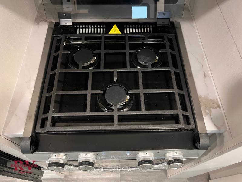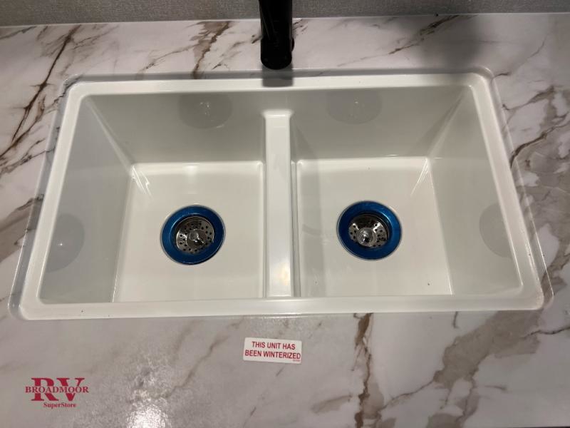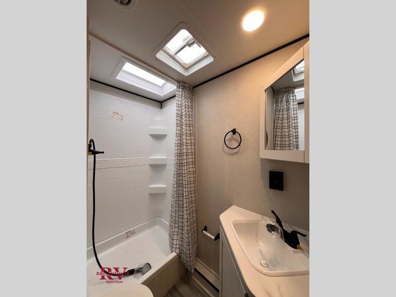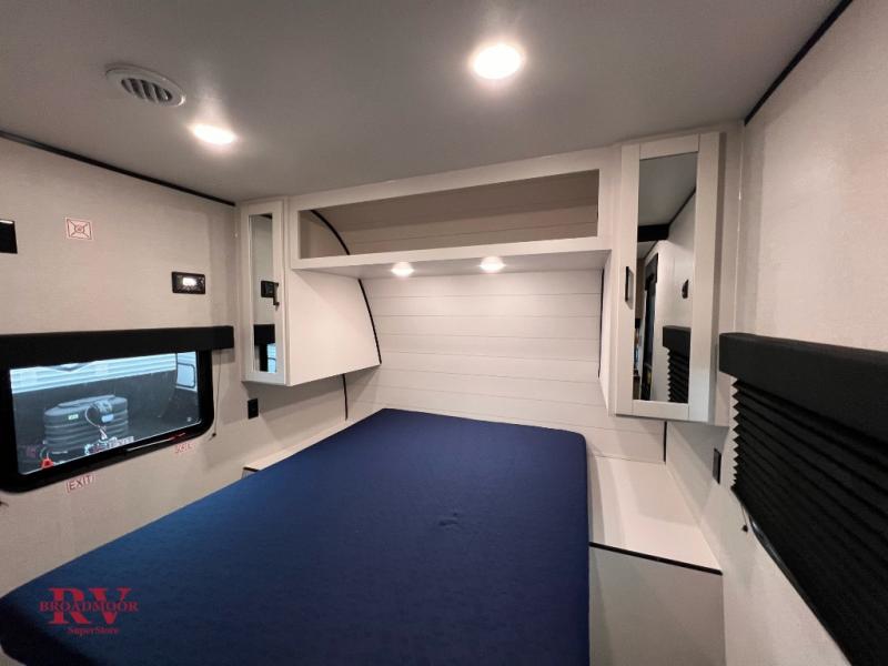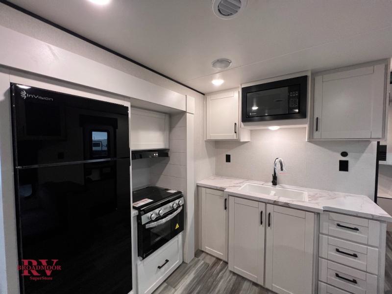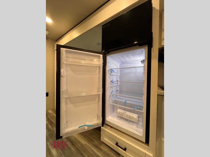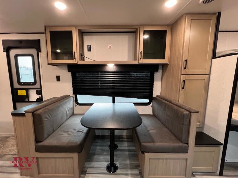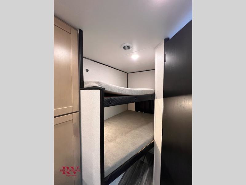 Wherever you decide to camp, you'll be met with comforts each day with this spacious travel trailer. There is a large slide out that will give the dog more space to nap on the floor. Your crew can relax on the jack-knife sofa, play a game at the booth dinette, or visit outdoors under the 16' power awning with LED lights. The outside kitchen is complete with an outdoor refrigerator for cold drinks, and there is an LP Quick Connect if you want to add your own grill. Head inside to clean up in the full bath, then head to bed in the front private bedroom. Here, you'll find a queen bed, dual wardrobes, plus a shelf for books. And your guests can sleep on the double-size bunks and living room furniture!