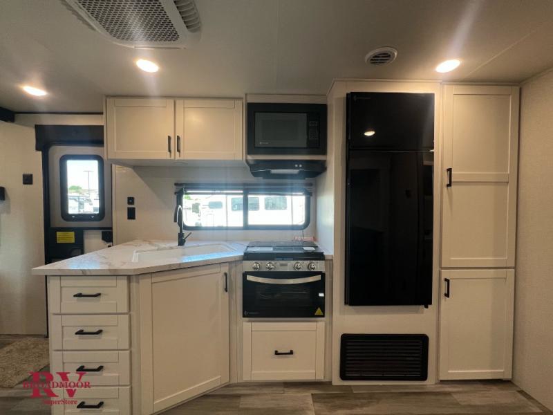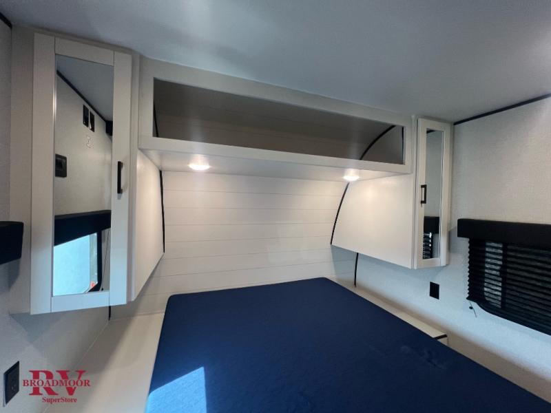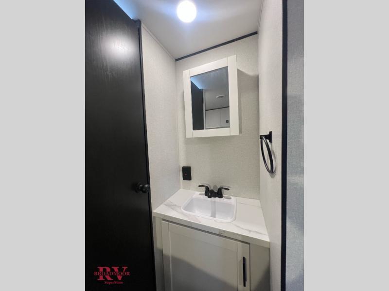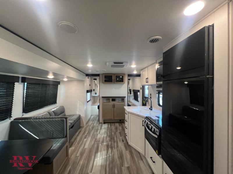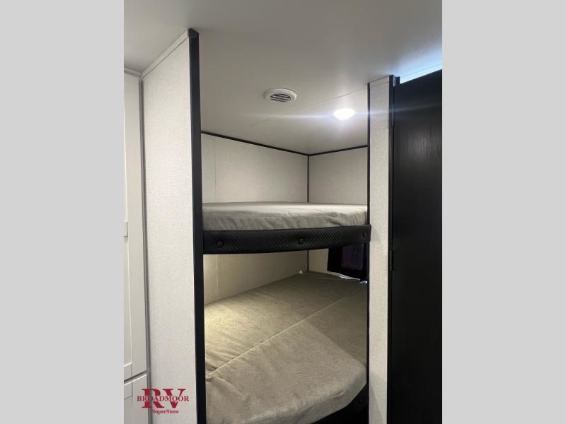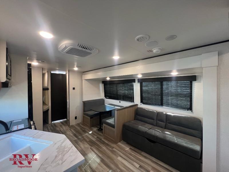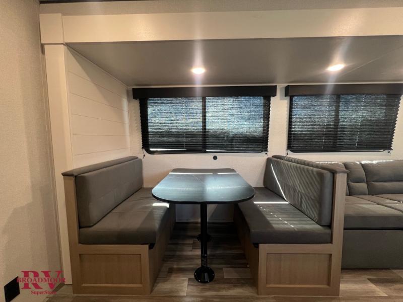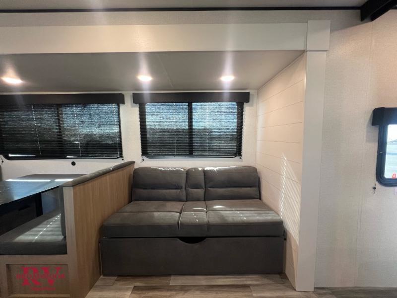 You can comfortably sleep up to ten people in this trailer thanks to the double-size bunks, the RV queen bed in the front bedroom, plus the booth dinette and jack-knife sofa in the main living area! The chef of your crew will have a three burner cooktop and microwave oven to prepare meals, and everyone can store their favorite drinks in the 8 cu. ft. 12V refrigerator inside, or in the outdoor refrigerator for convenience. The rear corner bathroom includes a tub/shower and a toilet, with the sink just outside of this room so others can brush their teeth if one is taking a shower before bed. The outside storage is accessible on both sides of the unit and will easily allow you bring along camp chairs, yard games and more. A 16' powered awning with LED lights will create a nice place to gather in the evenings with family and friends!