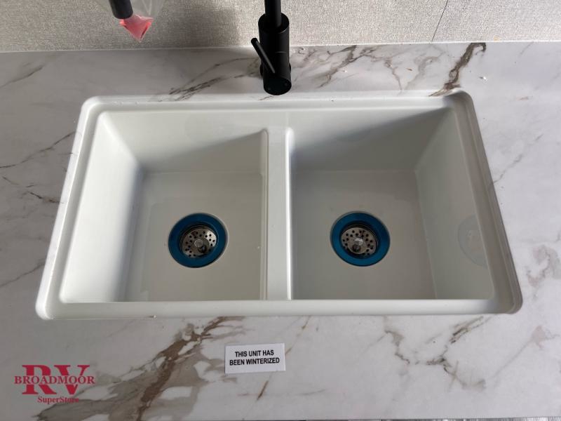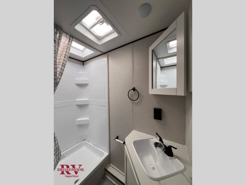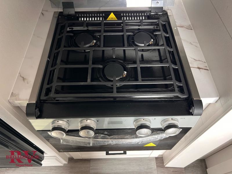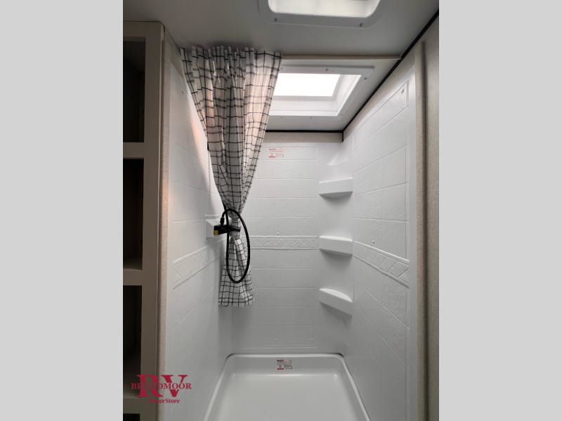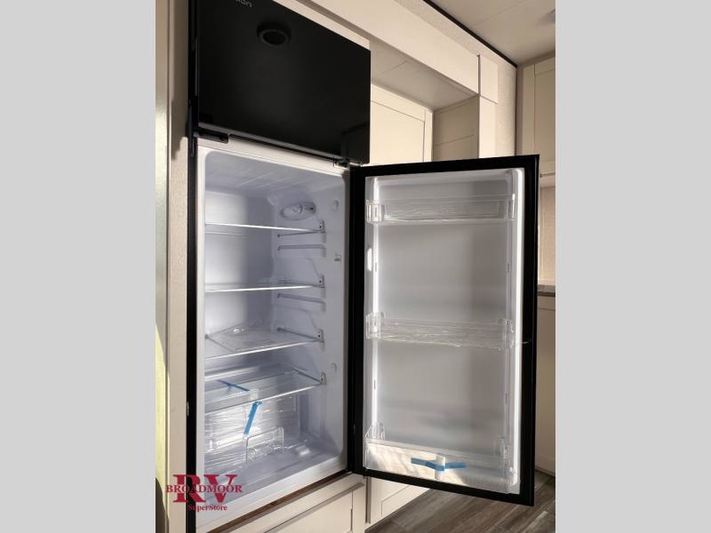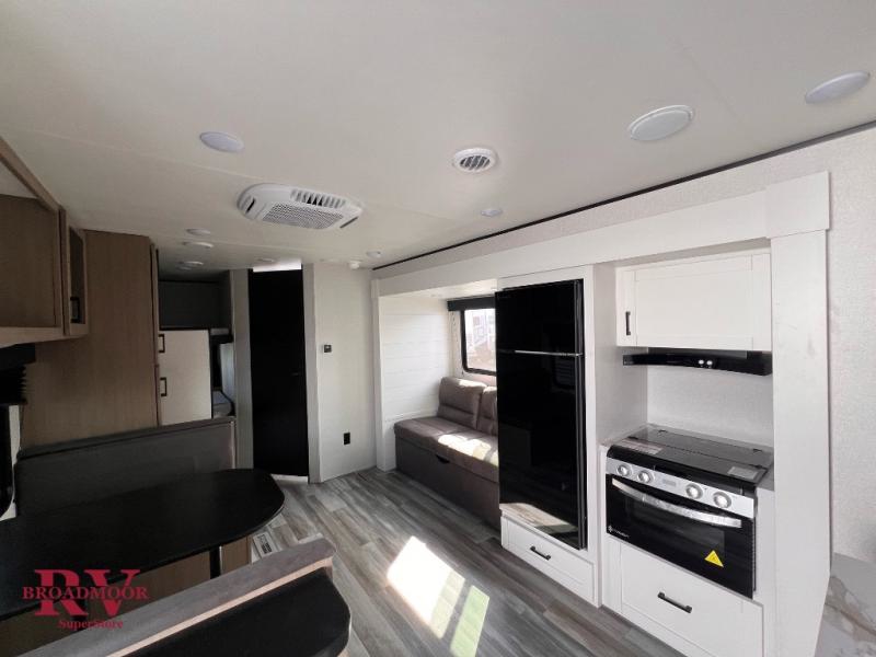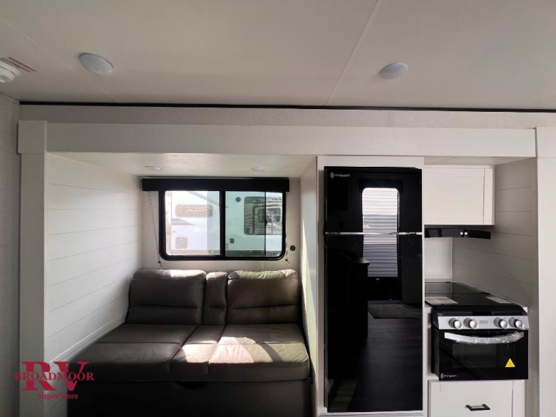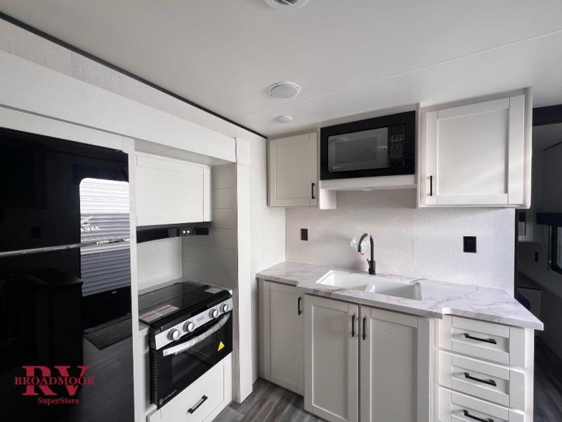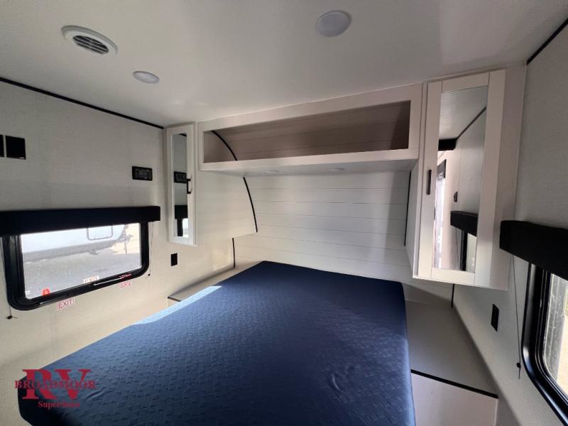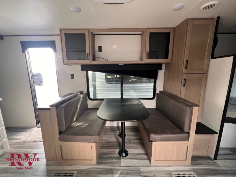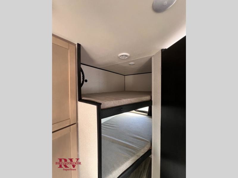 Wherever you decide to camp, you'll be met with comforts each day with this spacious travel trailer. There is a large slide out that will give the dog more space to nap on the floor. Your crew can relax on the jack-knife sofa, play a game at the booth dinette, or visit outdoors under the 16' power awning with LED lights. The outside kitchen is complete with an outdoor refrigerator for cold drinks, and there is an LP Quick Connect if you want to add your own grill. Head inside to clean up in the full bath, then head to bed in the front private bedroom. Here, you'll find a queen bed, dual wardrobes, plus a shelf for books. And your guests can sleep on the double-size bunks and living room furniture!