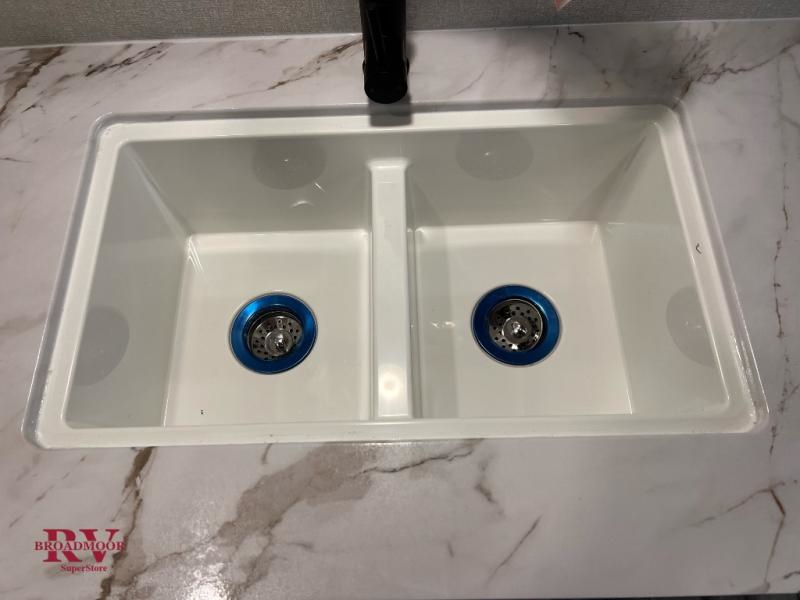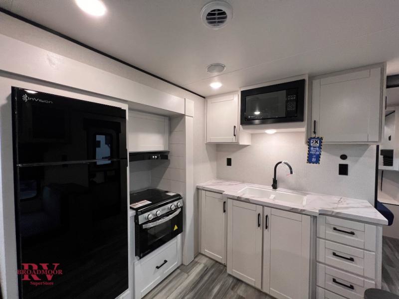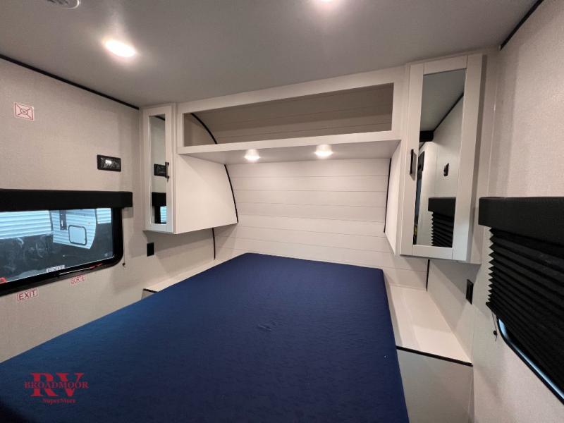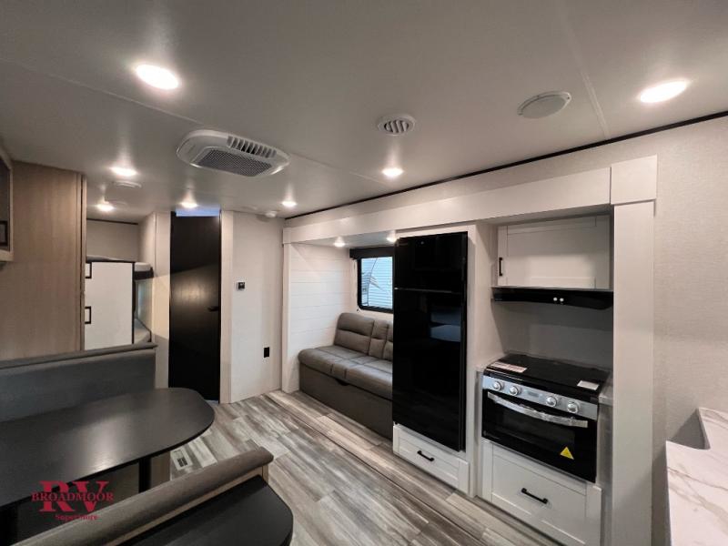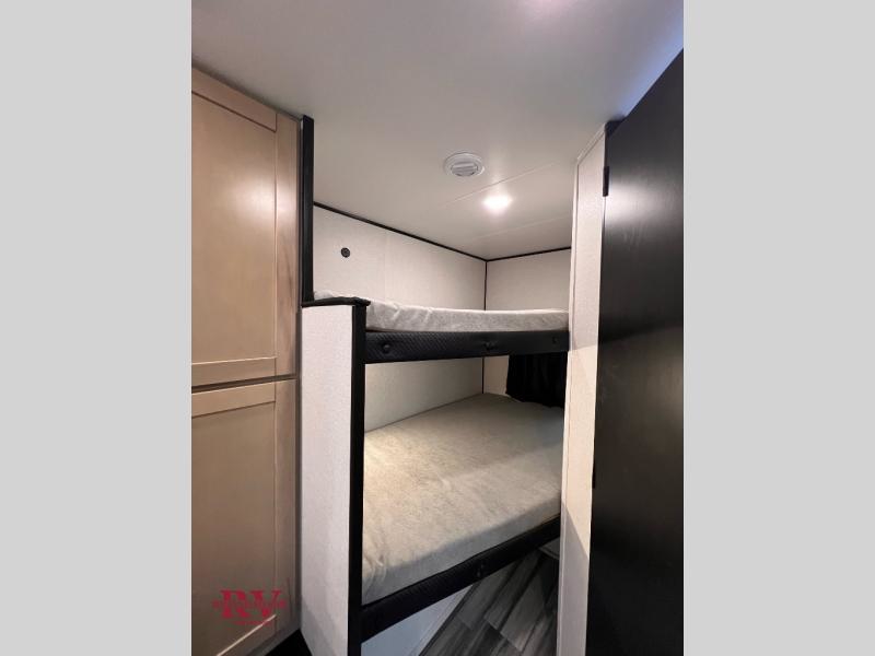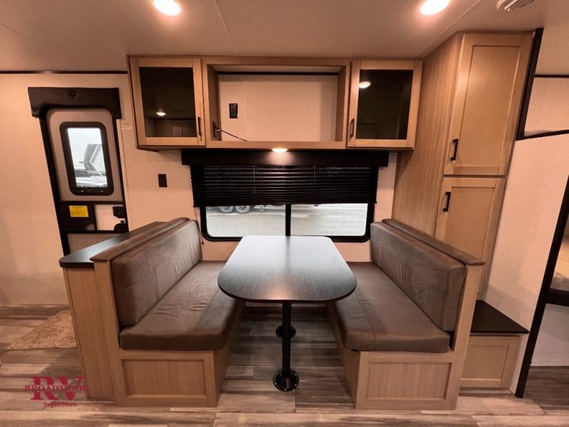 Wherever you decide to camp, you'll be met with comforts each day with this spacious travel trailer. There is a large slide out that will give the dog more space to nap on the floor. Your crew can relax on the jack-knife sofa, play a game at the booth dinette, or visit outdoors under the 16' power awning with LED lights. The outside kitchen is complete with an outdoor refrigerator for cold drinks, and there is an LP Quick Connect if you want to add your own grill. Head inside to clean up in the full bath, then head to bed in the front private bedroom. Here, you'll find a queen bed, dual wardrobes, plus a shelf for books. And your guests can sleep on the double-size bunks and living room furniture!