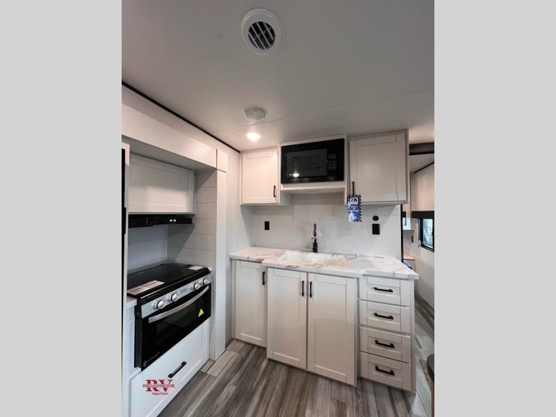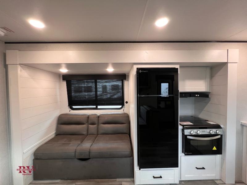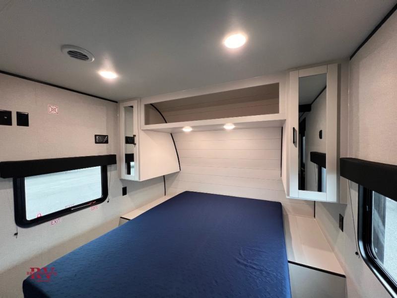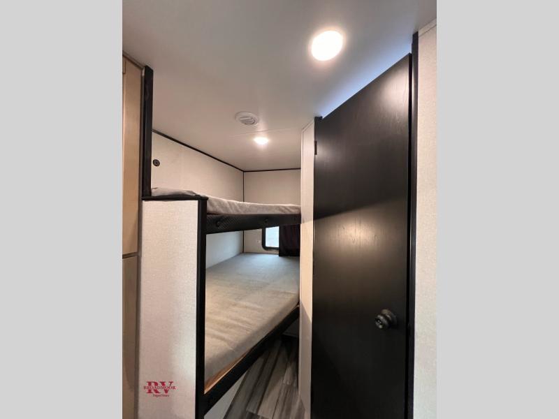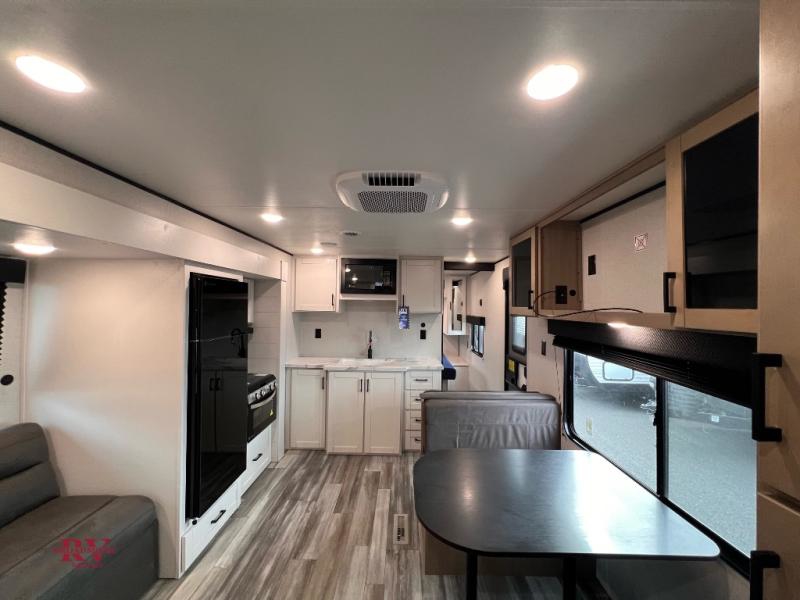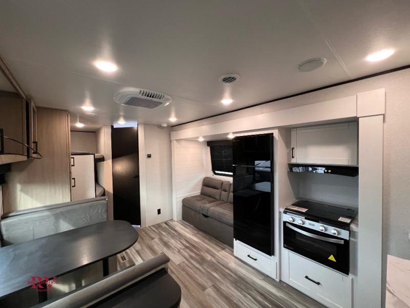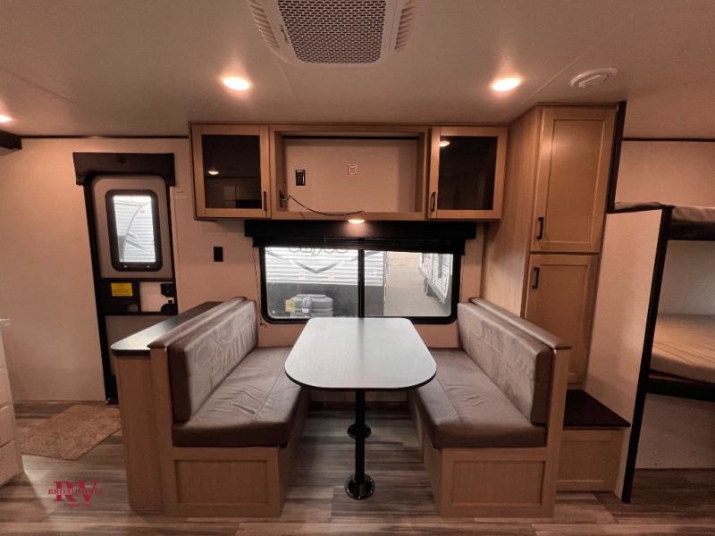 Wherever you decide to camp, you'll be met with comforts each day with this spacious travel trailer. There is a large slide out that will give the dog more space to nap on the floor. Your crew can relax on the jack-knife sofa, play a game at the booth dinette, or visit outdoors under the 16' power awning with LED lights. The outside kitchen is complete with an outdoor refrigerator for cold drinks, and there is an LP Quick Connect if you want to add your own grill. Head inside to clean up in the full bath, then head to bed in the front private bedroom. Here, you'll find a queen bed, dual wardrobes, plus a shelf for books. And your guests can sleep on the double-size bunks and living room furniture!