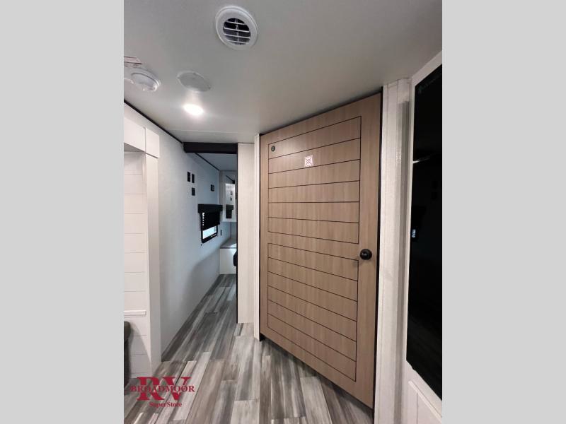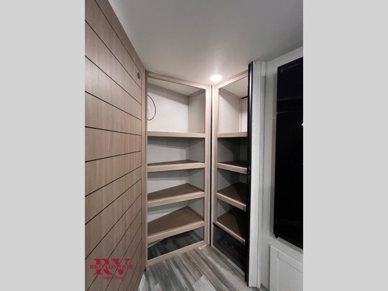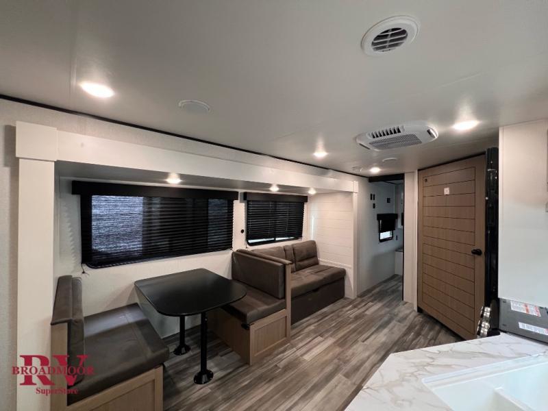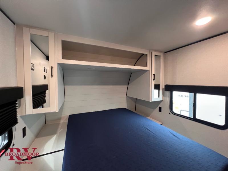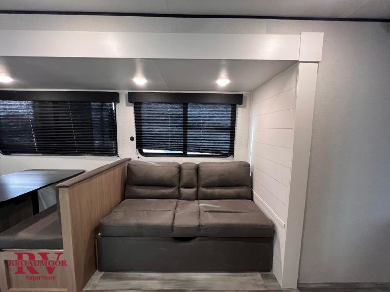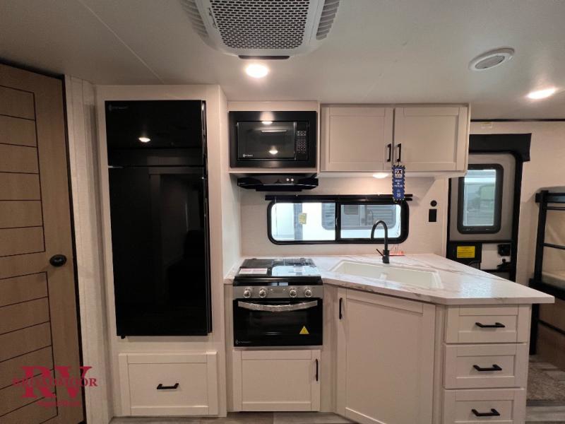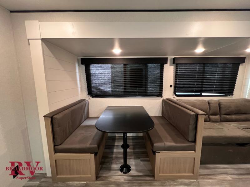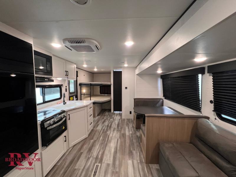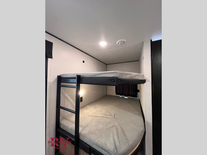 If space is what you're looking for in your next trailer, space is what you'll get this this Jay Flight SLX! The large slide houses the jack-knife sofa and booth dinette, and the added space here will provide everyone room to move about. The chef of your group will love cooking inside, or they can head outside to cook on the outdoor kitchen. Double-size bunks are sure to be a big hit with the little ones, and you'll love having your own space up front in the private bedroom. This unit includes ample storage space, including a hidden pantry with shelves, a bedroom closet plus dual bedside wardrobes, plus exterior storage for hiking or fishing gear!