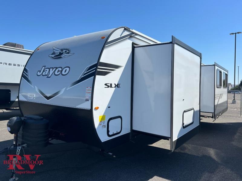 The Jayco Jay Flight SLX travel trailer is quite easy to own because it is lightweight for an easier towing experience. Built on a fully integrated A-frame with galvanized-steel, impact-resistant wheel wells, the Jay Flight SLX has quality at its very foundation. That quality continues on to the electric self-adjusting brakes, easy-lube hubs, Magnum Truss roof system, and LP quick connect. Some of what the mandatory Customer Value Package includes is backup camera prep, Keyed-Alike entry and baggage doors, marine grade exterior speakers, and an on-demand tankless water heater.