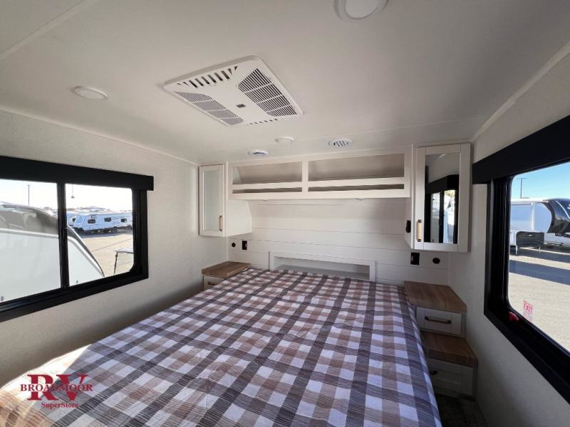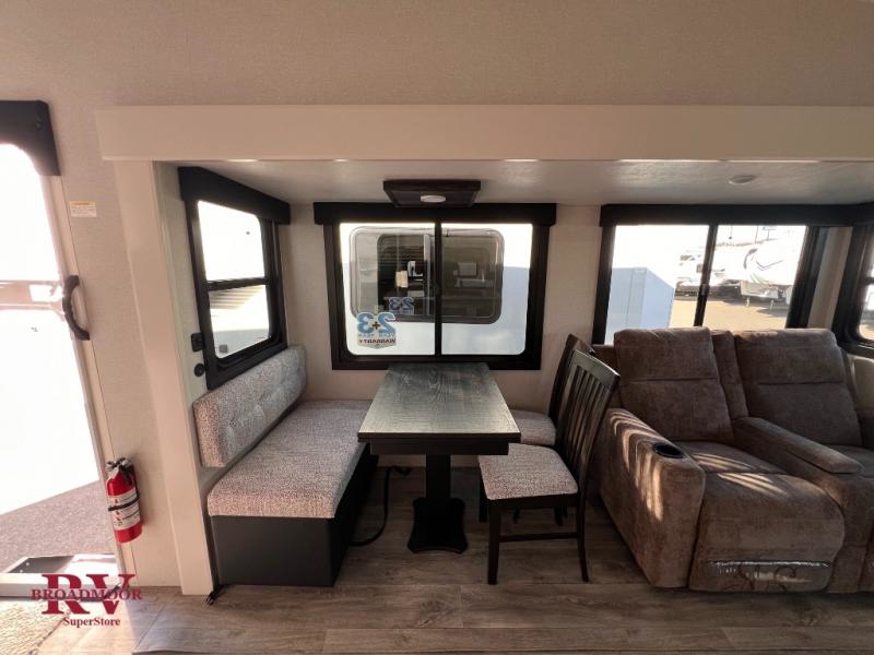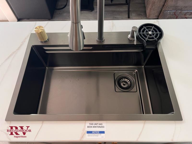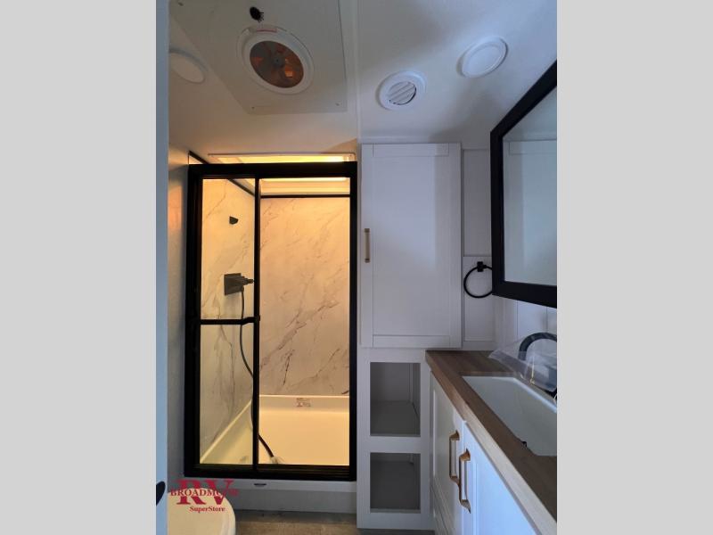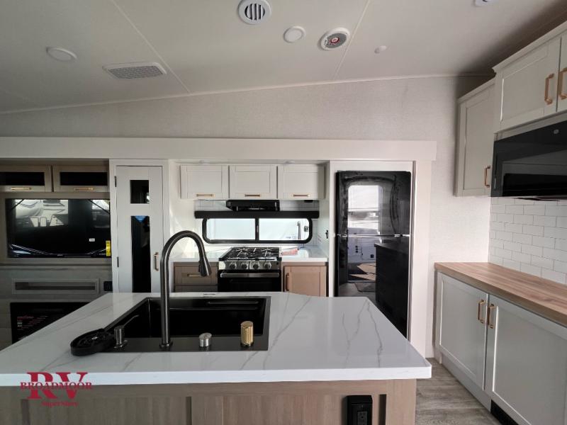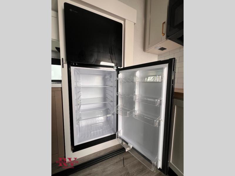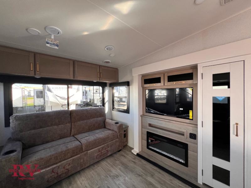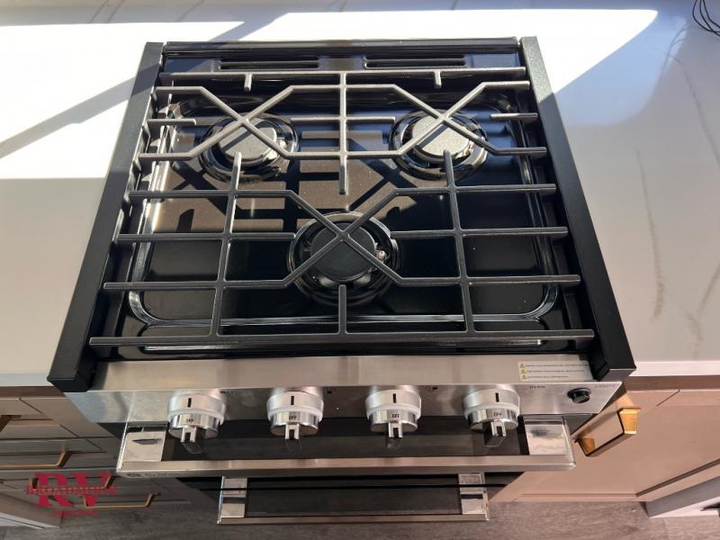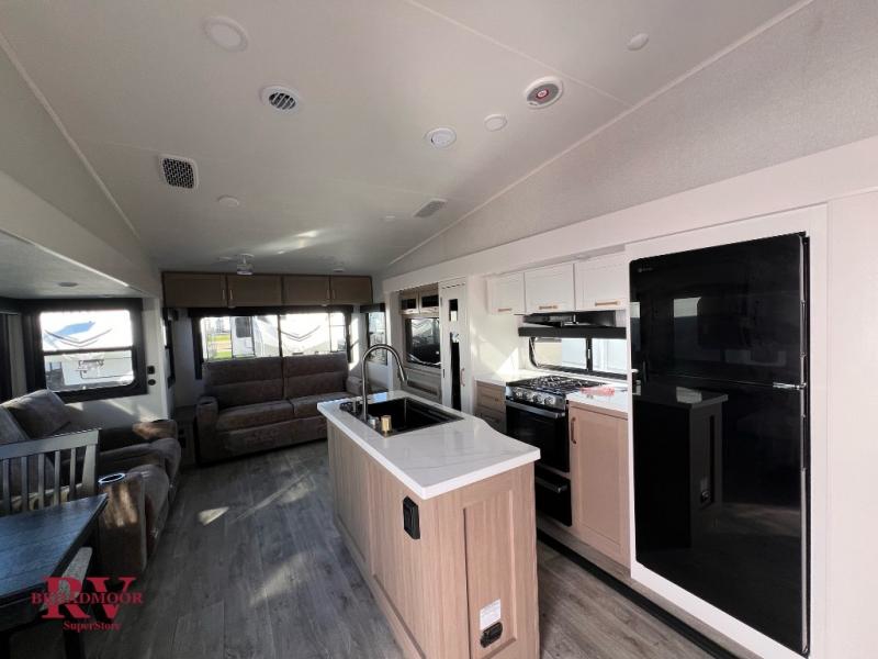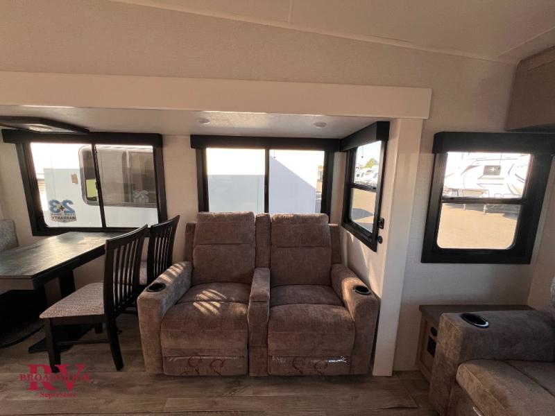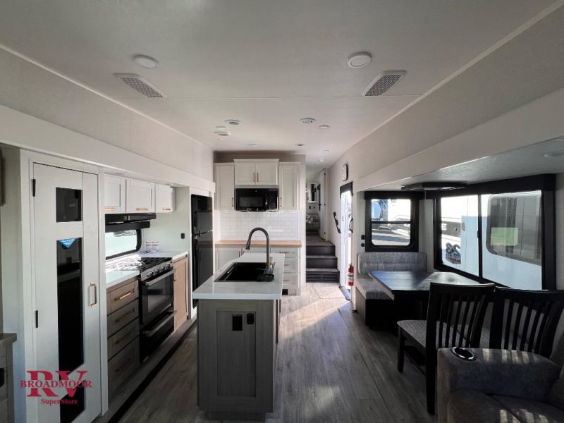 You will love how much interior space you have in this fifth wheel thanks to the dual opposing slides in the combined kitchen and living area! While your crew is relaxing on the theater seat or tri-fold sofa, you can prepare dinner on the GE black and stainless 21" range. There is also an entertainment center and fireplace across from the theater seat for easy viewing, and the table and chairs with a bench will be the perfect place to play a board game at. Head to the front to enjoy the private bedroom with an Olympic queen bed, and the full bath is close by for easy nighttime use!