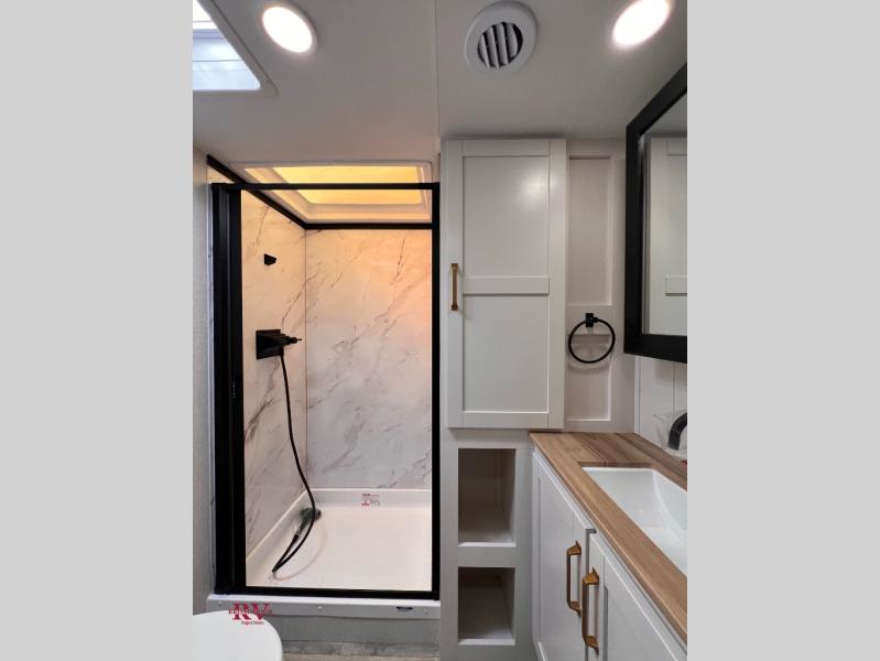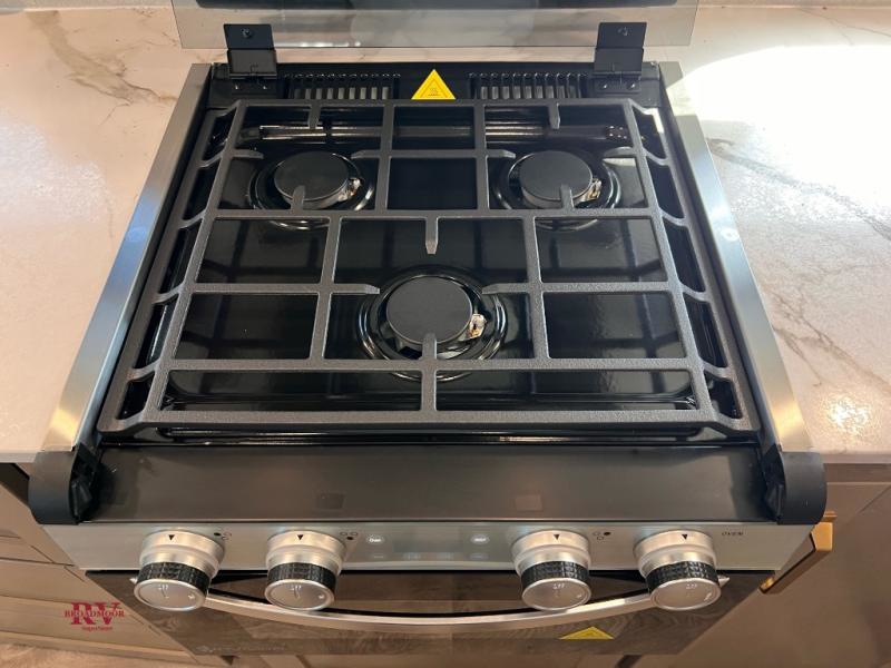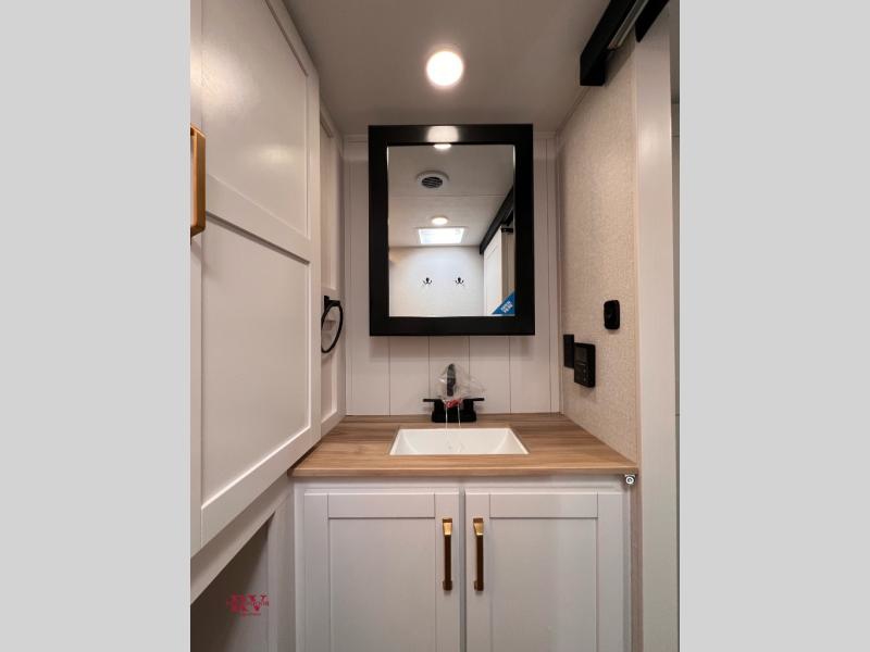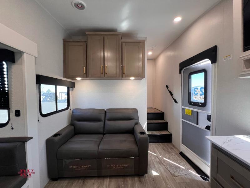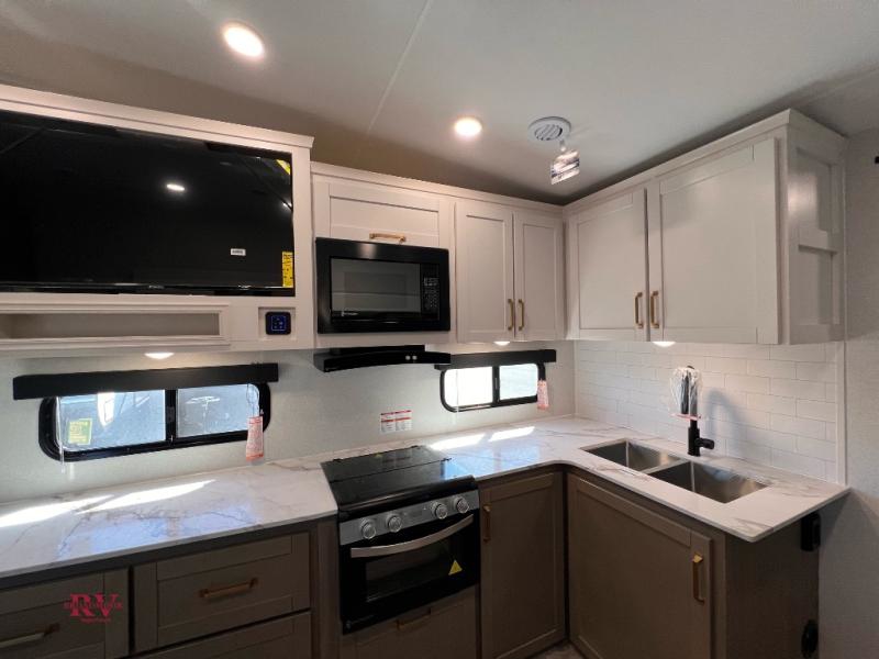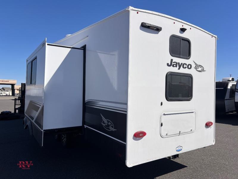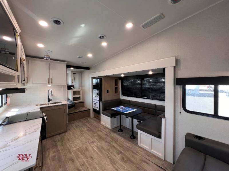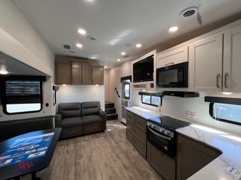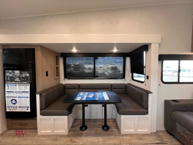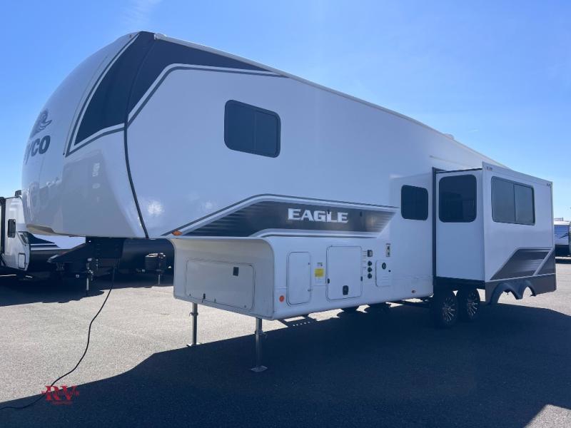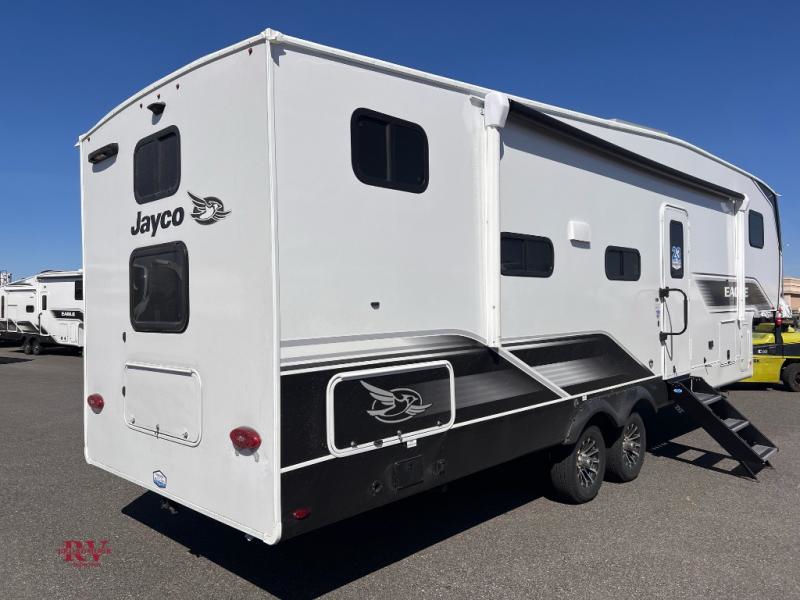 With any Eagle SLE fifth wheel by Jayco, you will enjoy a lighter tow weight, high-end finishes, and the same quality construction you've come to expect from Jayco! There is an Alpha Ply TPO roof membrane, a fully enclosed and heated underbelly, plus Stronghold VBL walls for added durability. There is also a rear 2" towing receiver outside, along with metal slam latch baggage doors, MORryde Step Above entry steps, and a Winegard Air 360 antenna with router prep if you want to stay connected as you camp. Once inside you'll enjoy the handcrafted door/drawer fronts, shower skylight, and residential vinyl flooring throughout with no carpet for an easier clean. The on-demand water heater, 30K BTU furnace, and 15K BTU "Whisper Quiet" A/C will ensure your comfort, and the Overland 1 Solar Package will provide off-grid capabilities!