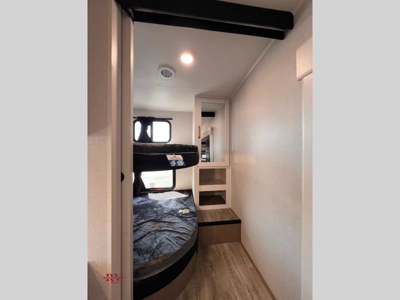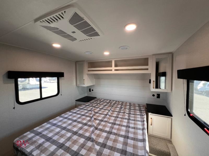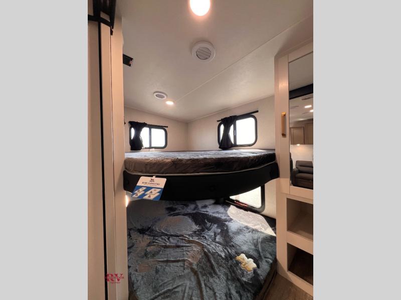 If you enjoy camping with a larger group, this fifth wheel is perfect for you! The rear bunkhouse includes double-size bunks, bunk storage and a wardrobe to keep this space tidy. You'll have the front private bedroom all to yourselves with a queen bed, and if you have any other guests, they can sleep on the tri-fold sofa and U-shaped dinette in the main living area. This space is also shared with the full kitchen, complete with a microwave and range, 12V refrigerator, and plenty of overhead cabinets for storage. After dinner, head outdoors to enjoy the 19' power awning with LED lights as you relax in your camp chairs!