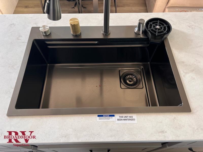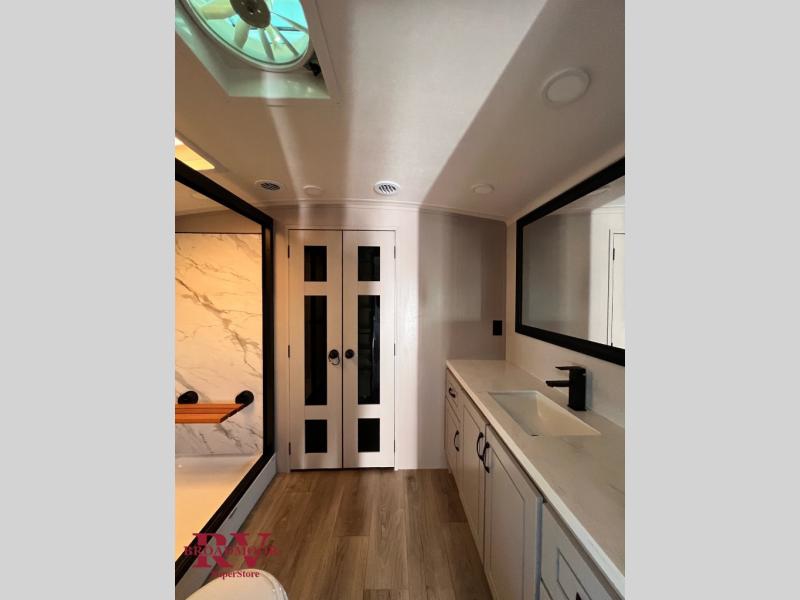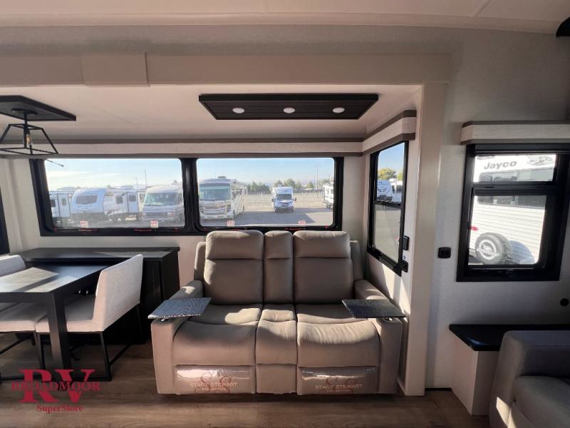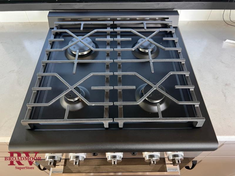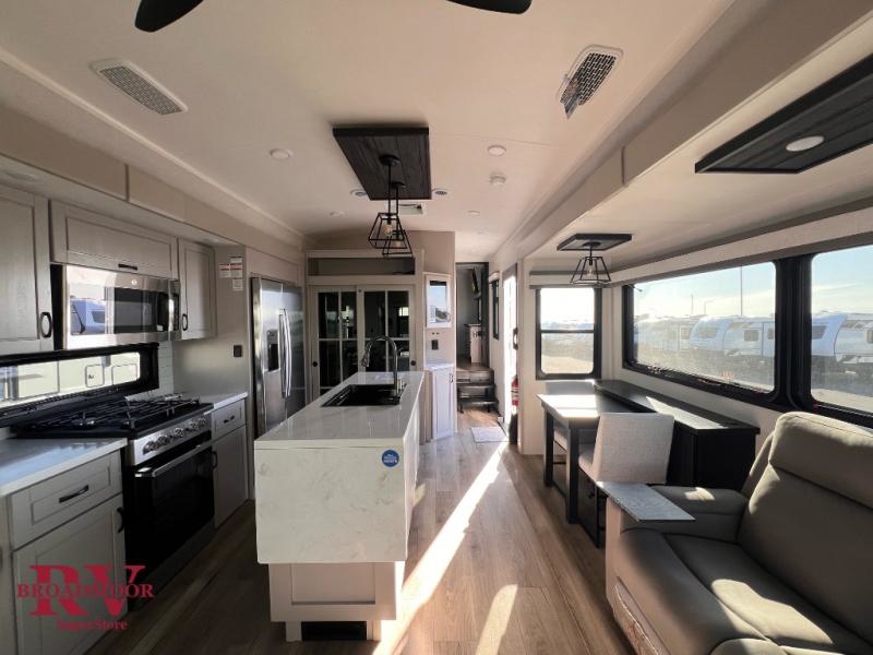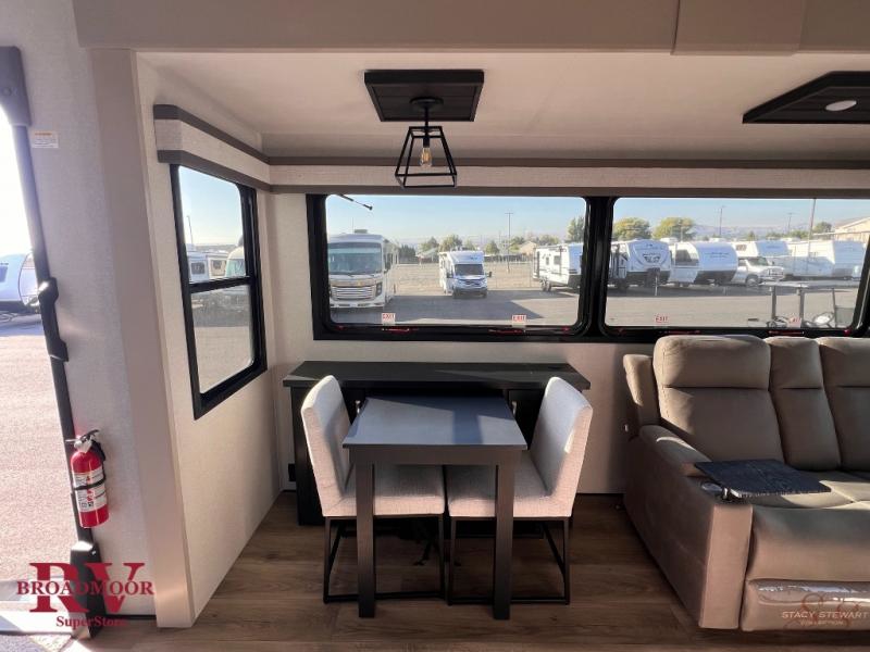 Finding the perfect RV park or campground is all you have to do, then you can load up and hit the road whether you are a full-timer or weekend warrior. The two electric awnings and the three slides are easy to set up and close, and you will have lots of interior and exterior storage to bring everything you might need. The kitchen offers a residential refrigerator and 24" stove, a 30" residential microwave, a kitchen island, a pantry and a pull-out countertop. You can relax on the tri-fold sofa and the theater seats while watching your shows on the 50" Smart LED HDTV with fully digital HDMI output and home entertainment system with subwoofer plus there is a fireplace below. Dine at the roll-top dinette table, or you can work from here as well. The front bedroom offers a king bed slide and a flip-top dresser with 32" TV, plus access to a spacious private front bath including a walk-in closet, washer/dryer prep, and more.